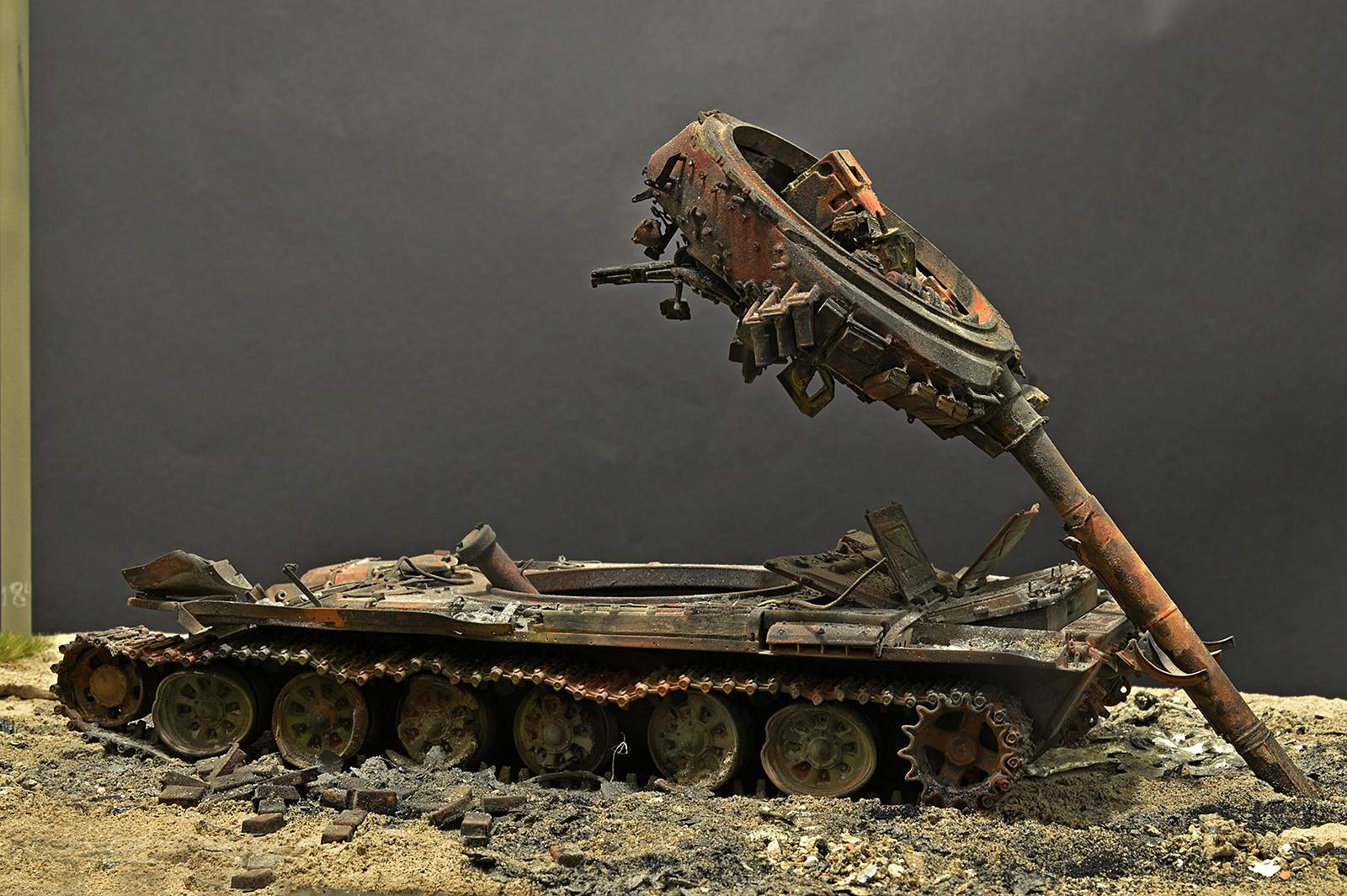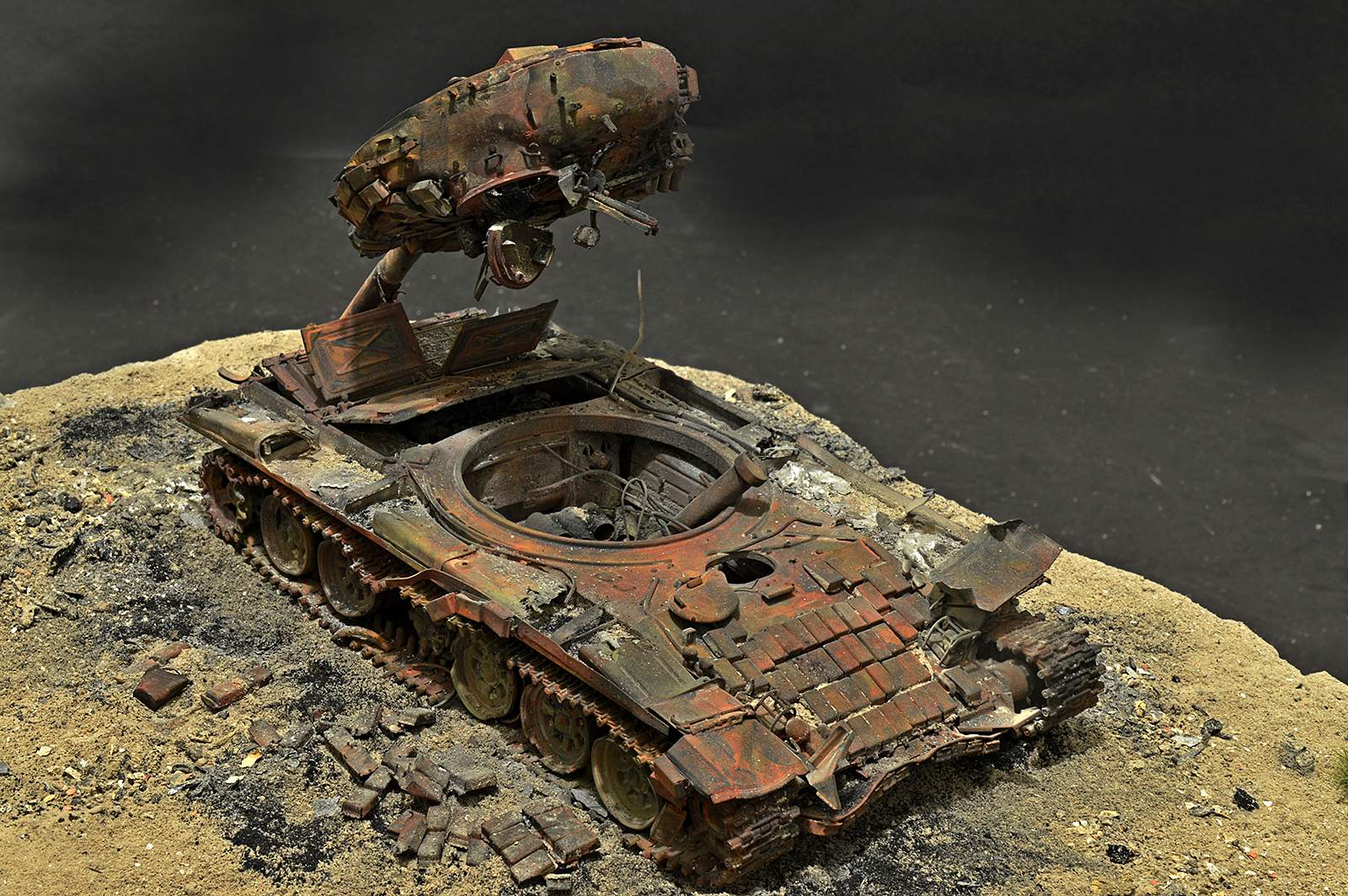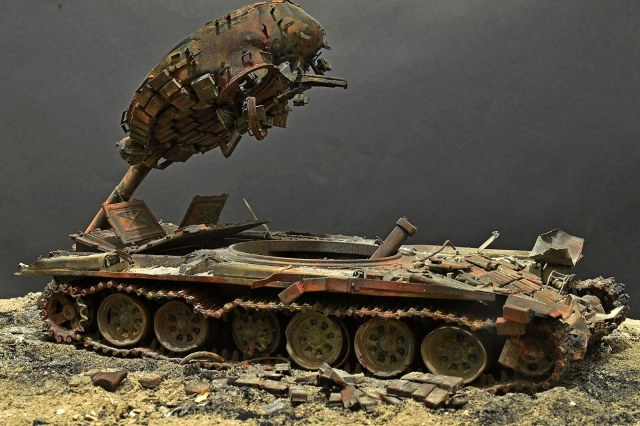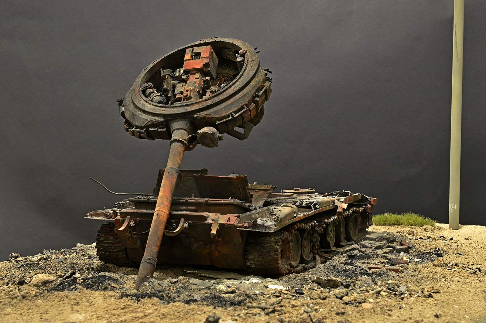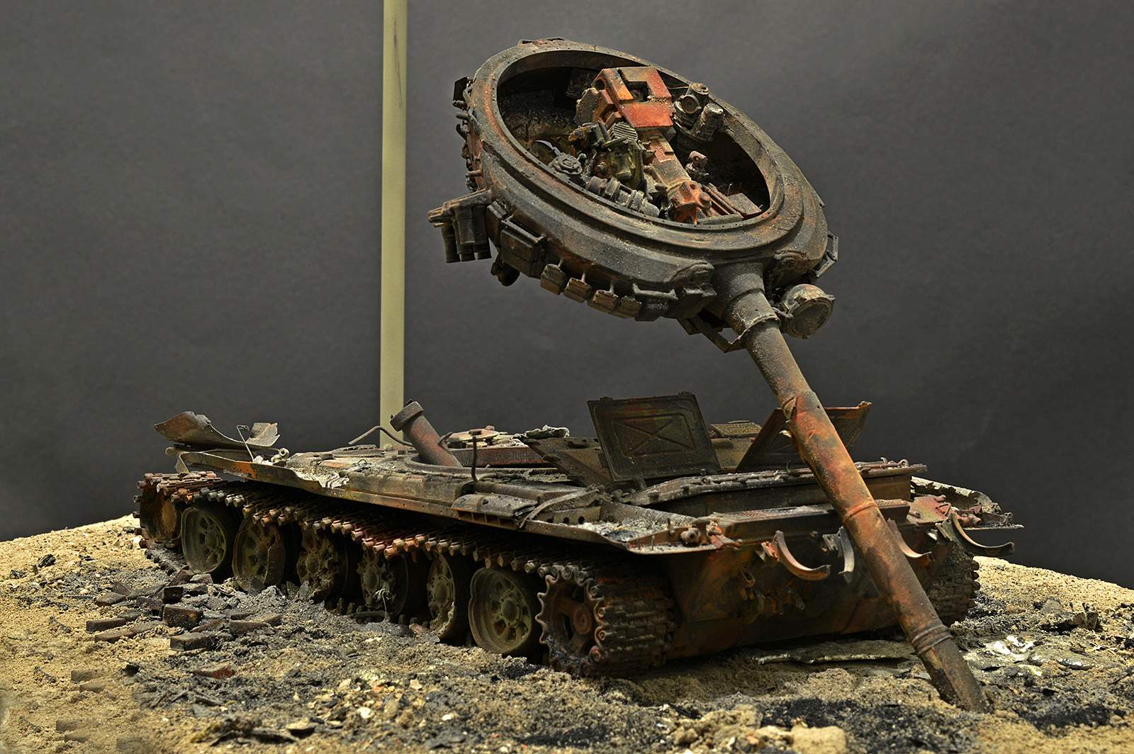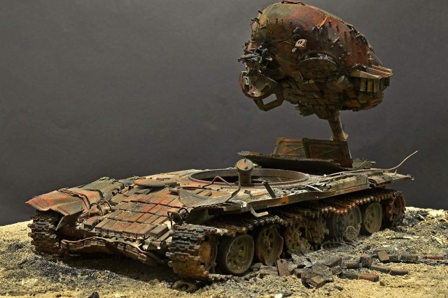 Отлично! Полная иллюзия разбитого, горелого танка. Воспроизведение интерьера - отдельный БОЛЬШОЙ ПЛЮС! Браво.