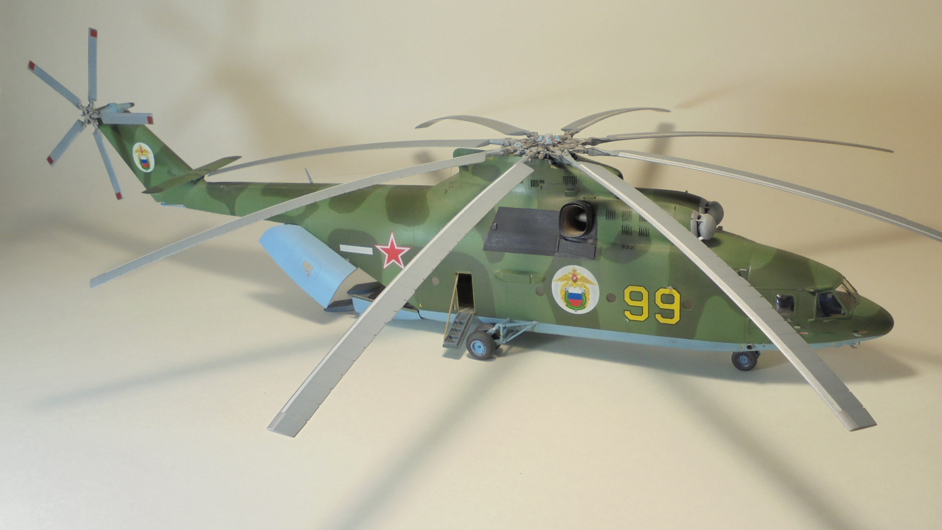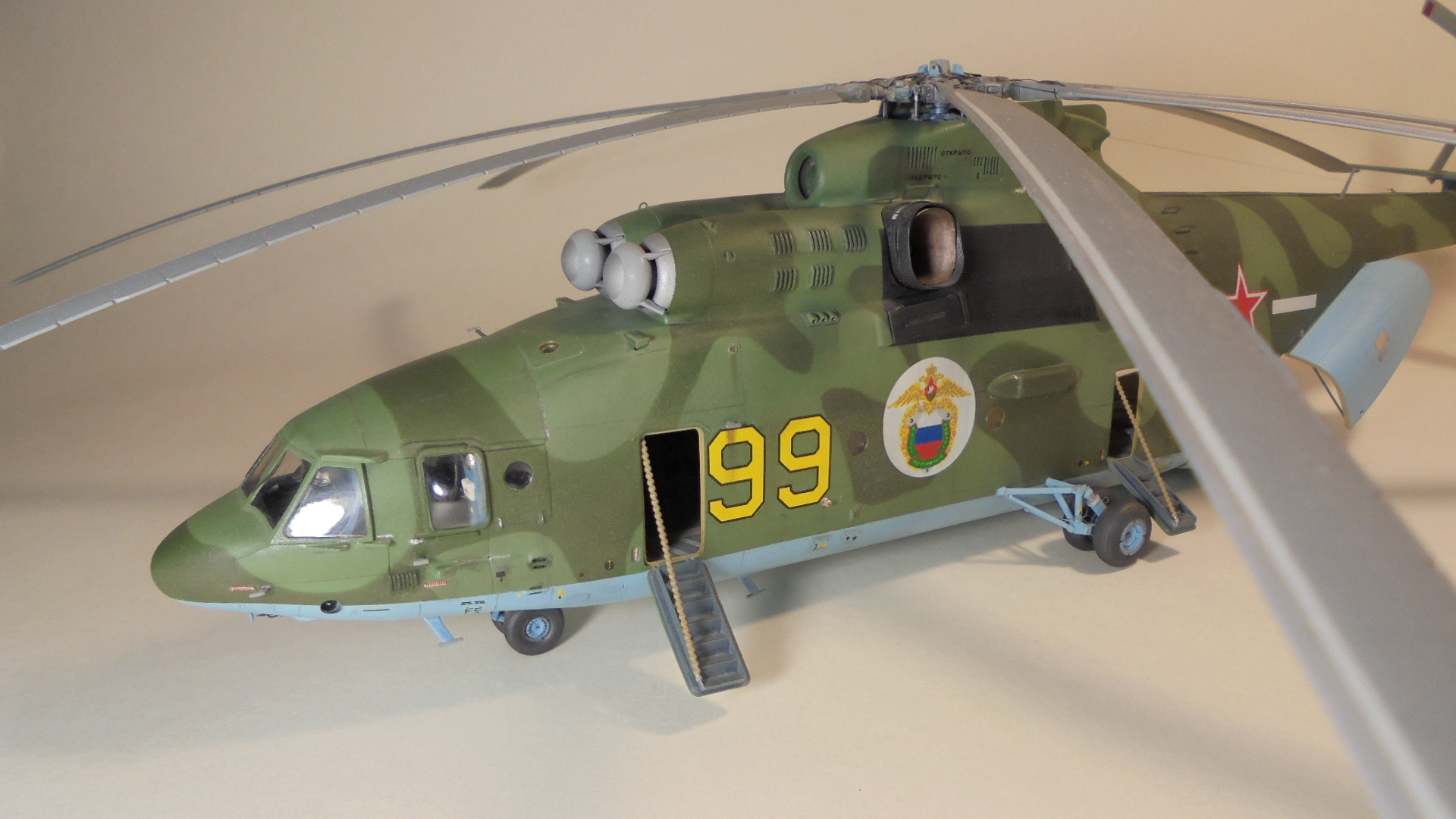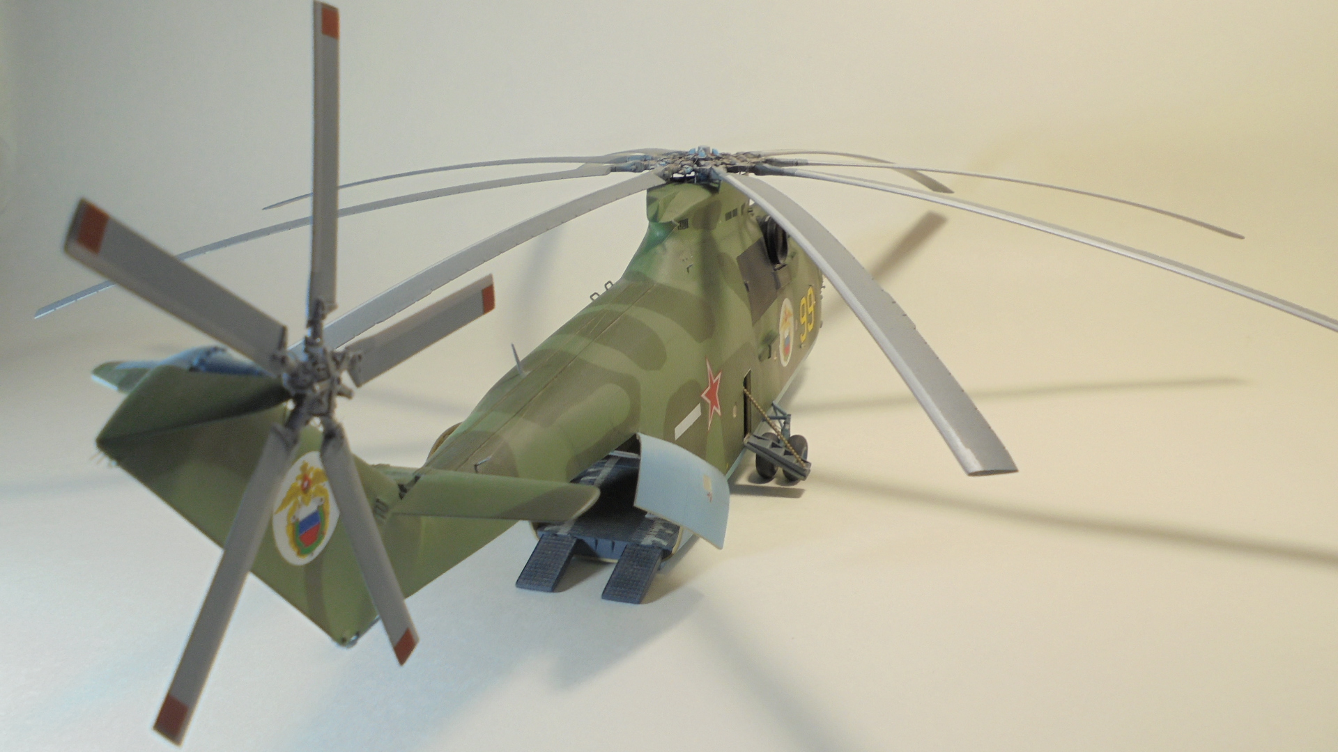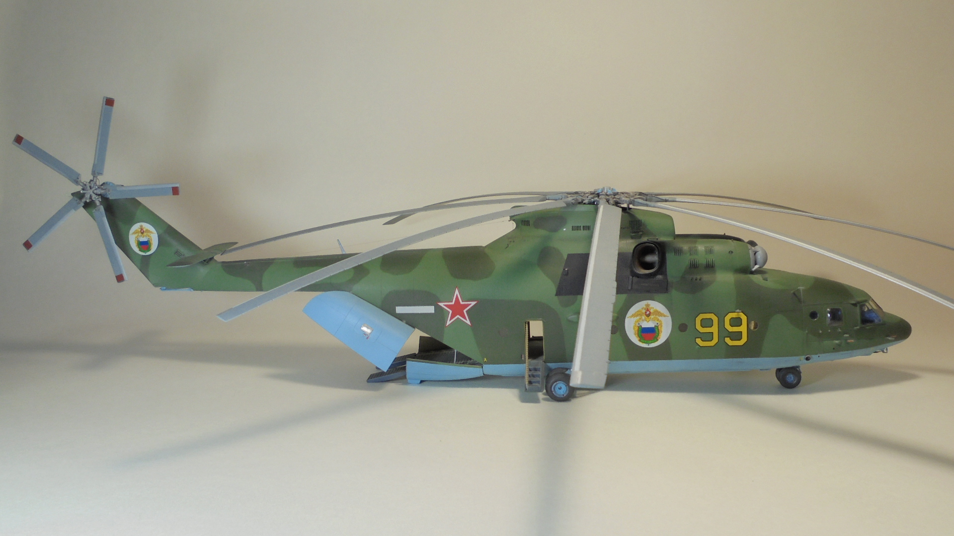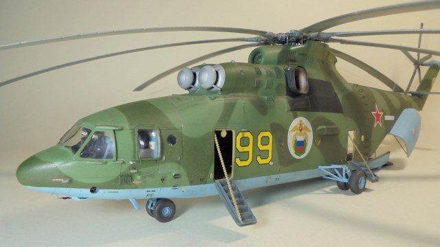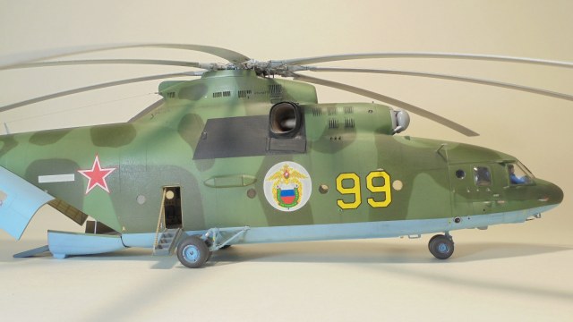 Добрый день. Собирал ГИГАНТА долго и упорно.Из моих доработок;сделал открытым грузовой отсек внутри всё самодельное из подручных материалов так же сделал дворники,натянул антенну из медной проволоки,хвостовой огонь,проводку на основных стойках шасси,ручки на капотах двигунов,проводку на основном и хвостовом винтах. Намучился когда склеивал две половины корпуса уж очень большие зазоры были в районе двигателей да и многие детали со смещением.Красил нитро красками ЗВЕЗДА, при покраски широко использовал флюоресцентный восковой пластилин, молярный скотч,изоленту, смывка местами а так простой карандаш расшивка .В НЭТЕ так и нашёл Данный борт ,покрасил по инструкции ЗВЕЗДЫ Ми-26 пограничных войск РФ Таджикистан 1993 год модель не старался застарить. Декаль ужасна просто. Не везде победил!.