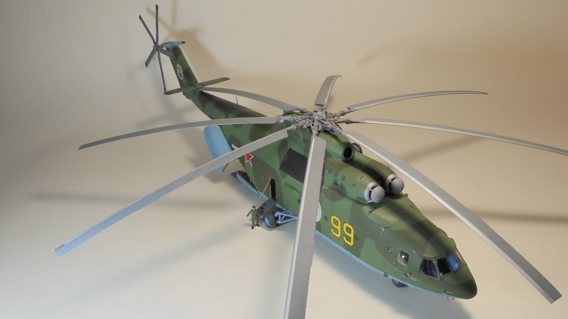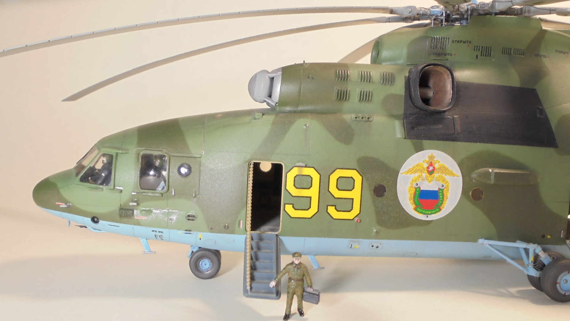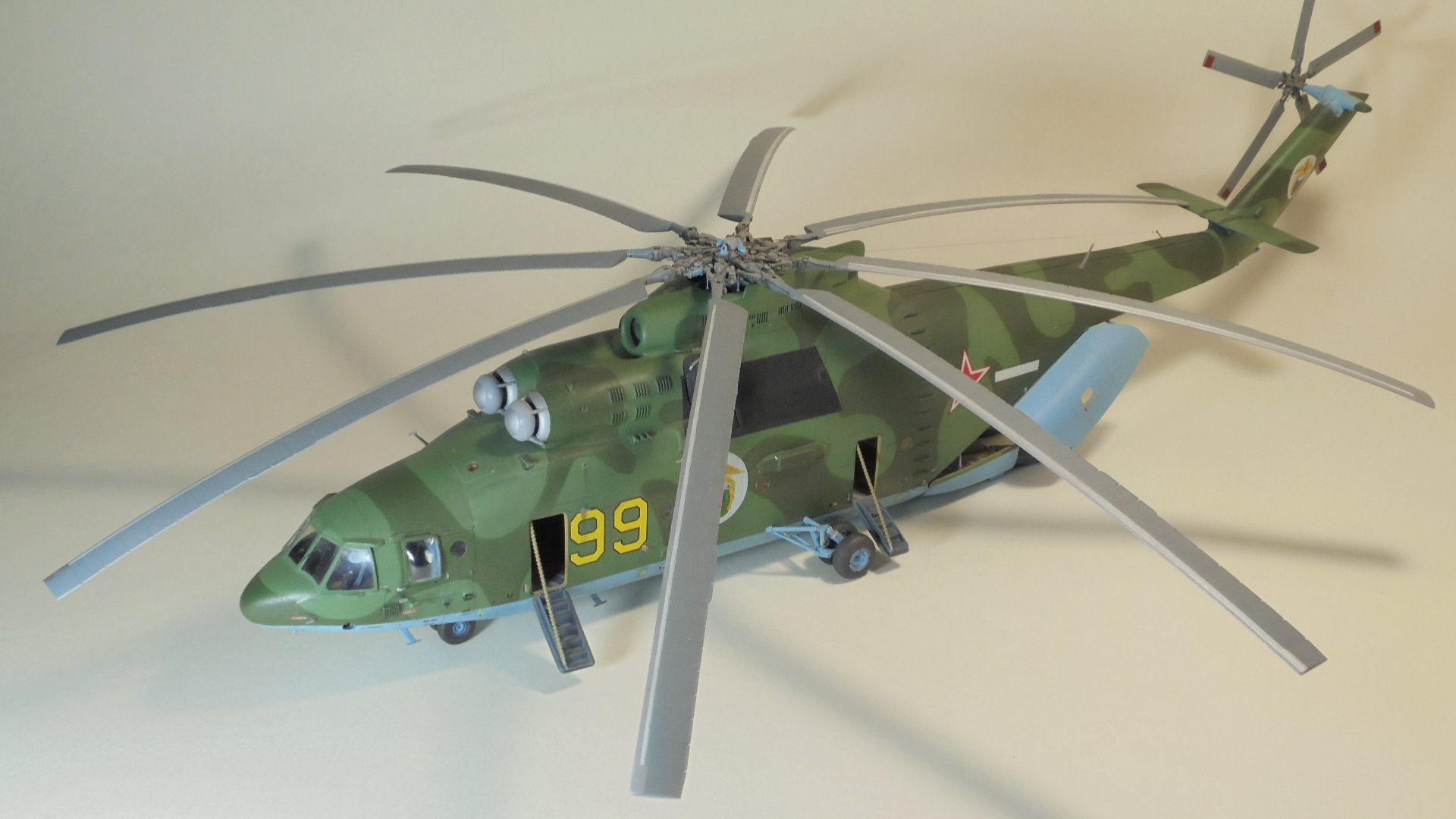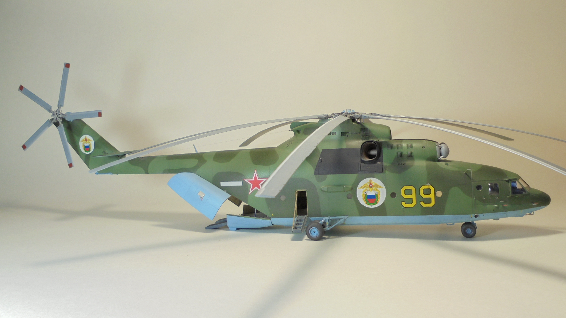 Добрый день. Собирал ГИГАНТА долго и упорно.Из моих доработок;сделал открытым грузовой отсек внутри всё самодельное из подручных материалов так же сделал дворники,натянул антенну из медной проволоки,хвостовой огонь,проводку на основных стойках шасси,ручки на капотах двигунов,проводку на основном и хвостовом винтах. Намучился когда склеивал две половины корпуса уж очень большие зазоры были в районе двигателей да и многие детали со смещением.Красил нитро красками ЗВЕЗДА, при покраски широко использовал флюоресцентный восковой пластилин, молярный скотч,изоленту, смывка местами а так простой карандаш расшивка .В НЭТЕ так и нашёл Данный борт ,покрасил по инструкции ЗВЕЗДЫ Ми-26 пограничных войск РФ Таджикистан 1993 год модель не старался застарить. Декаль ужасна просто. Не везде победил!.