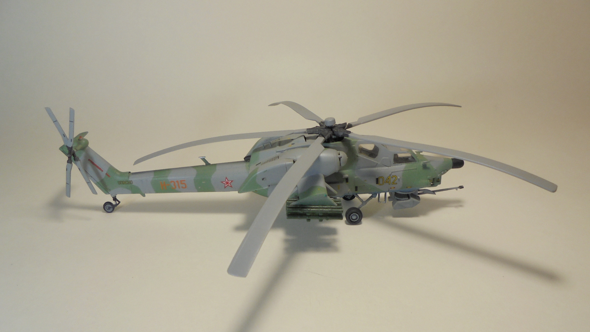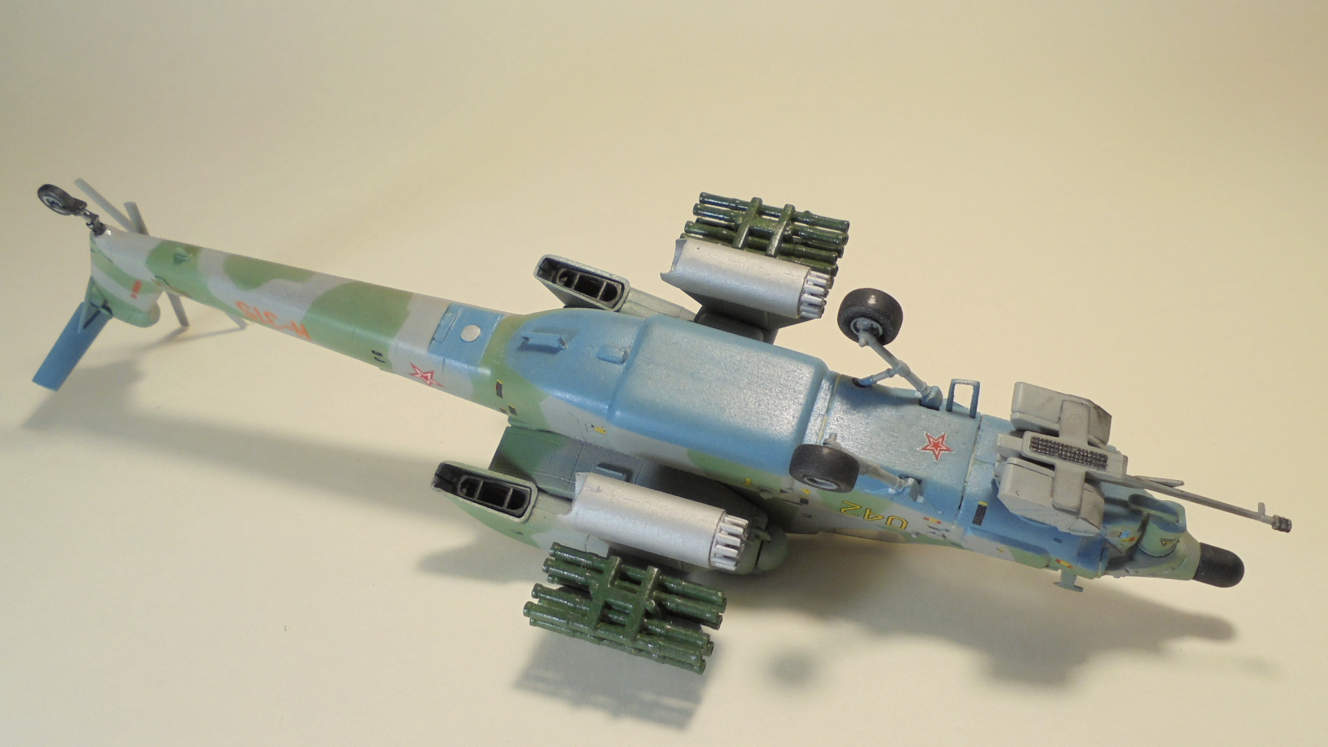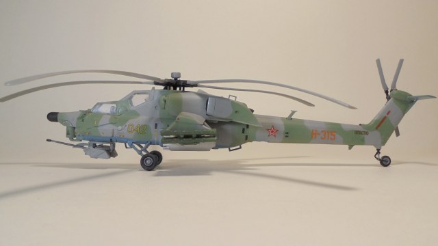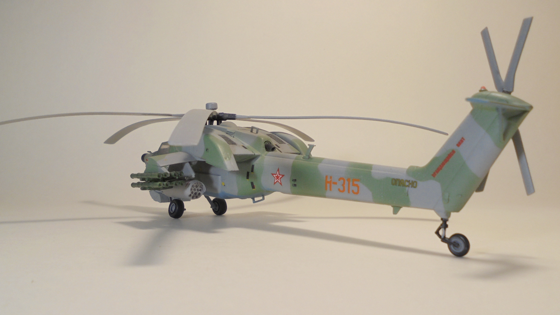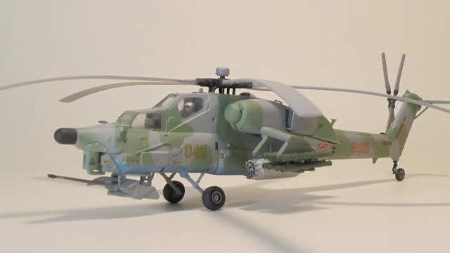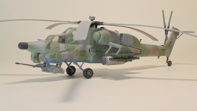 Доброго вечера.Представляю вам модель, боевой вертолёт ОКБ М.Л.Миля.Собирал в далёком 1999 году приобрести этот набор в то время было удачей в нашей деревушке.Собирал из коробки были сделаны лишь АНО и в пушке просверлено отверстие красил какими то красками?Краска от времени выцвела по моему был темнее. Приятного просмотра.