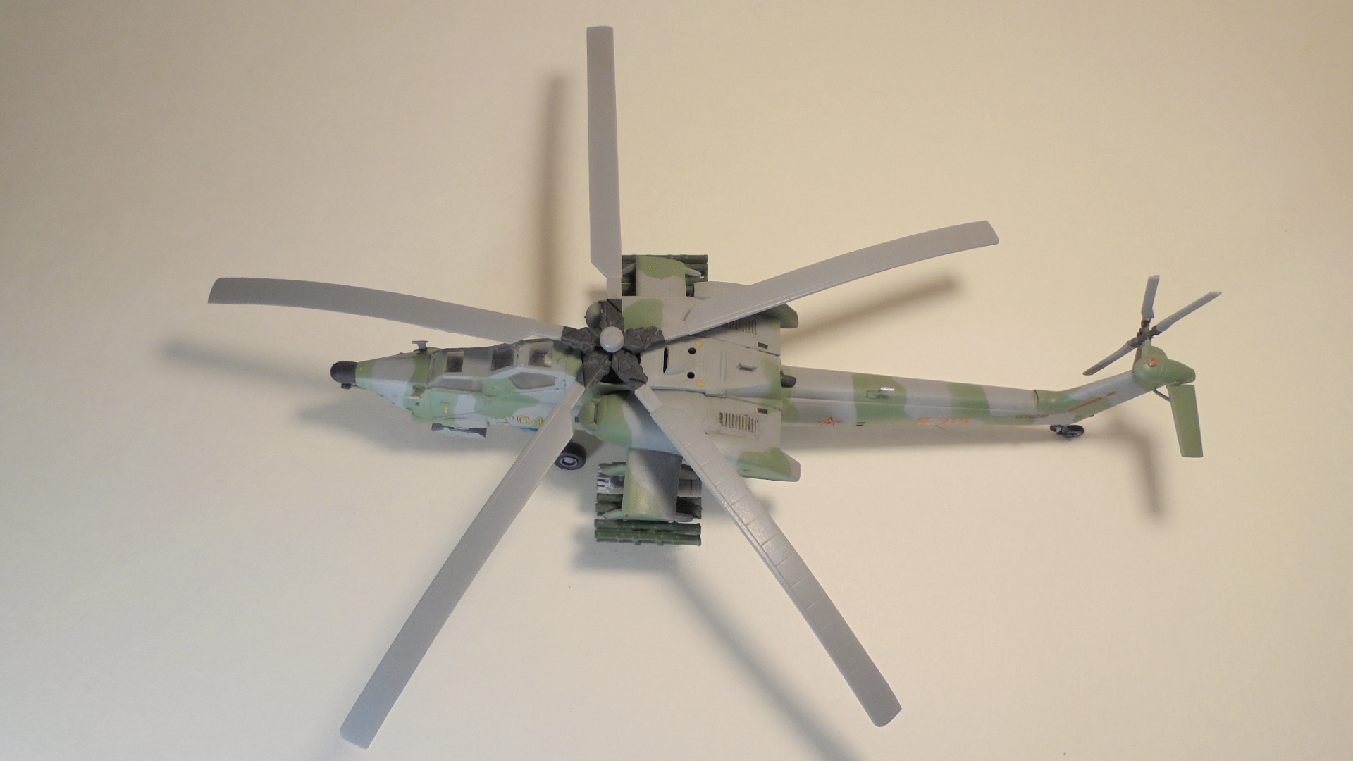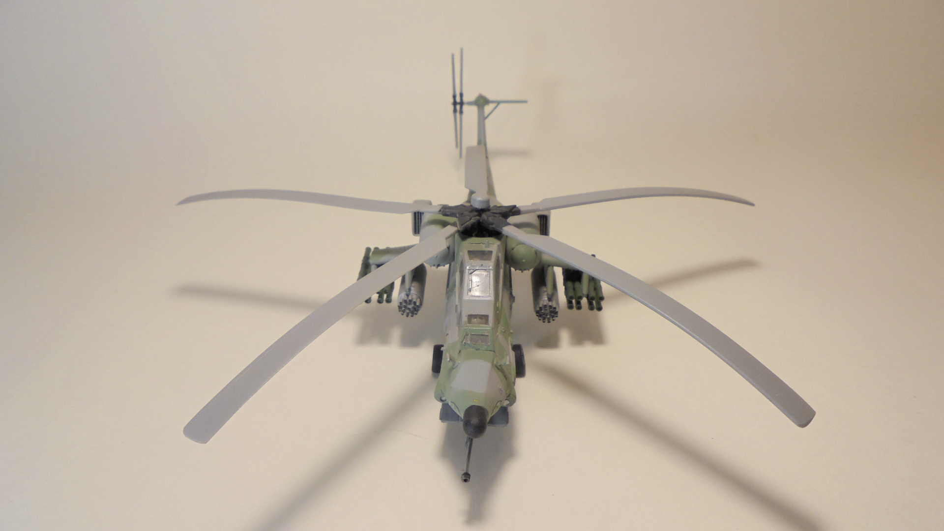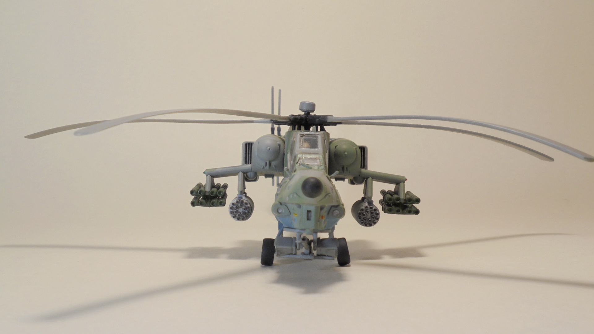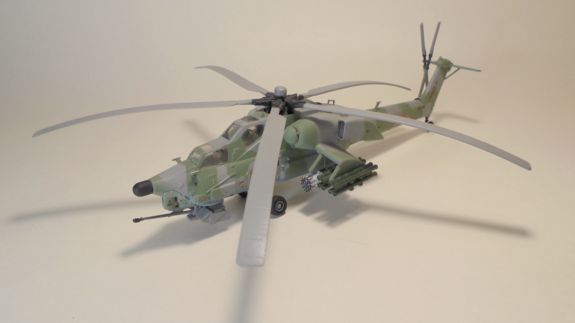 Доброго вечера.Представляю вам модель, боевой вертолёт ОКБ М.Л.Миля.Собирал в далёком 1999 году приобрести этот набор в то время было удачей в нашей деревушке.Собирал из коробки были сделаны лишь АНО и в пушке просверлено отверстие красил какими то красками?Краска от времени выцвела по моему был темнее. Приятного просмотра.