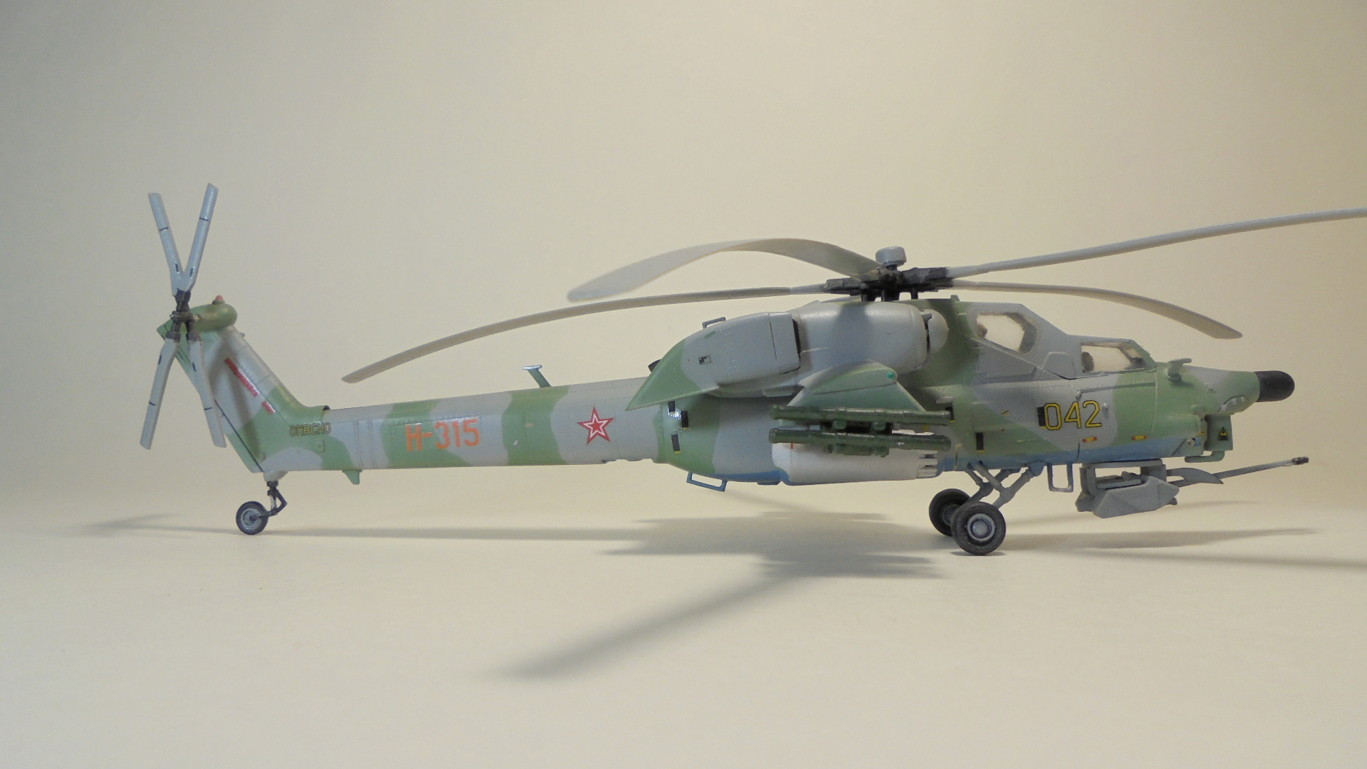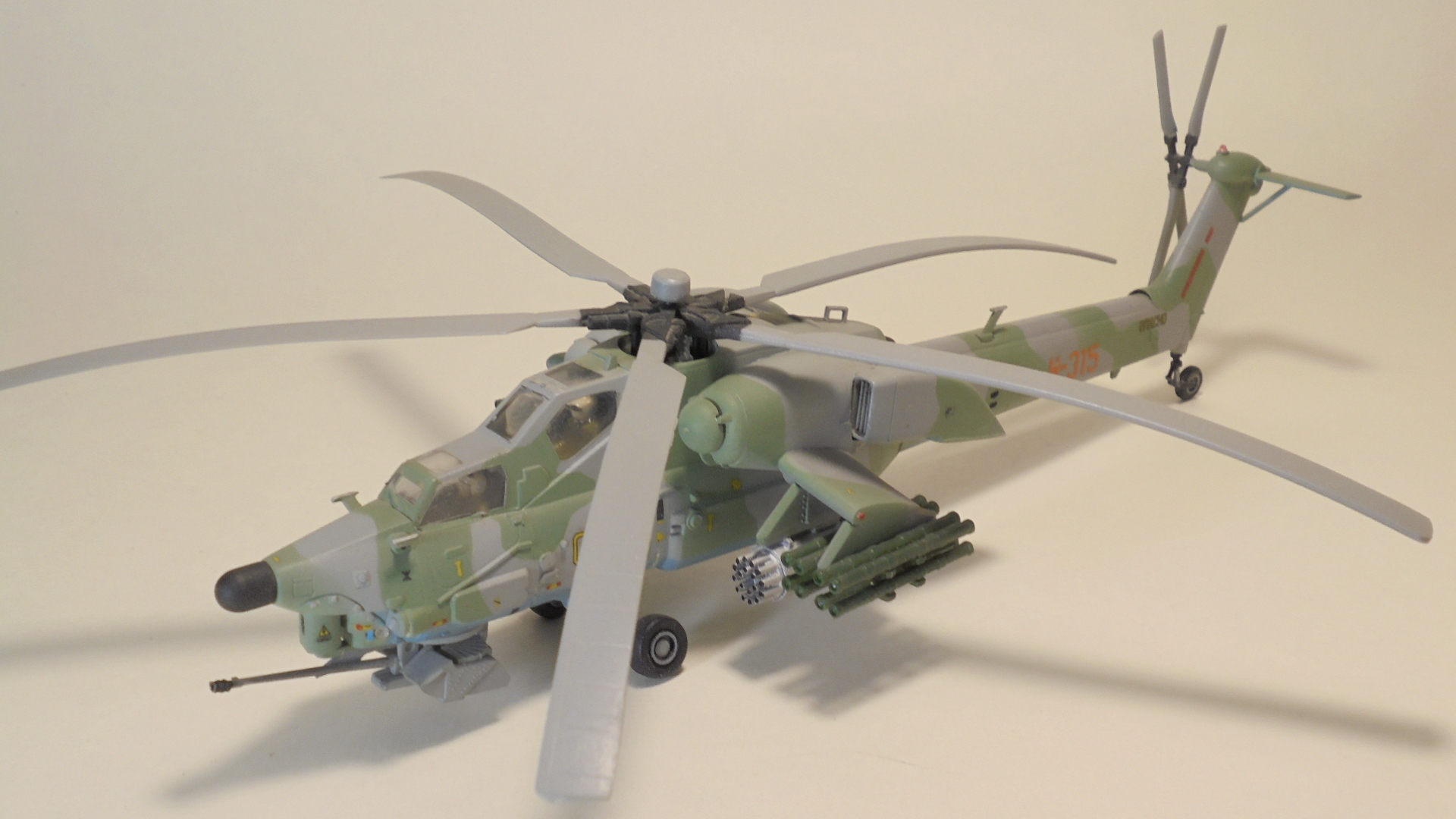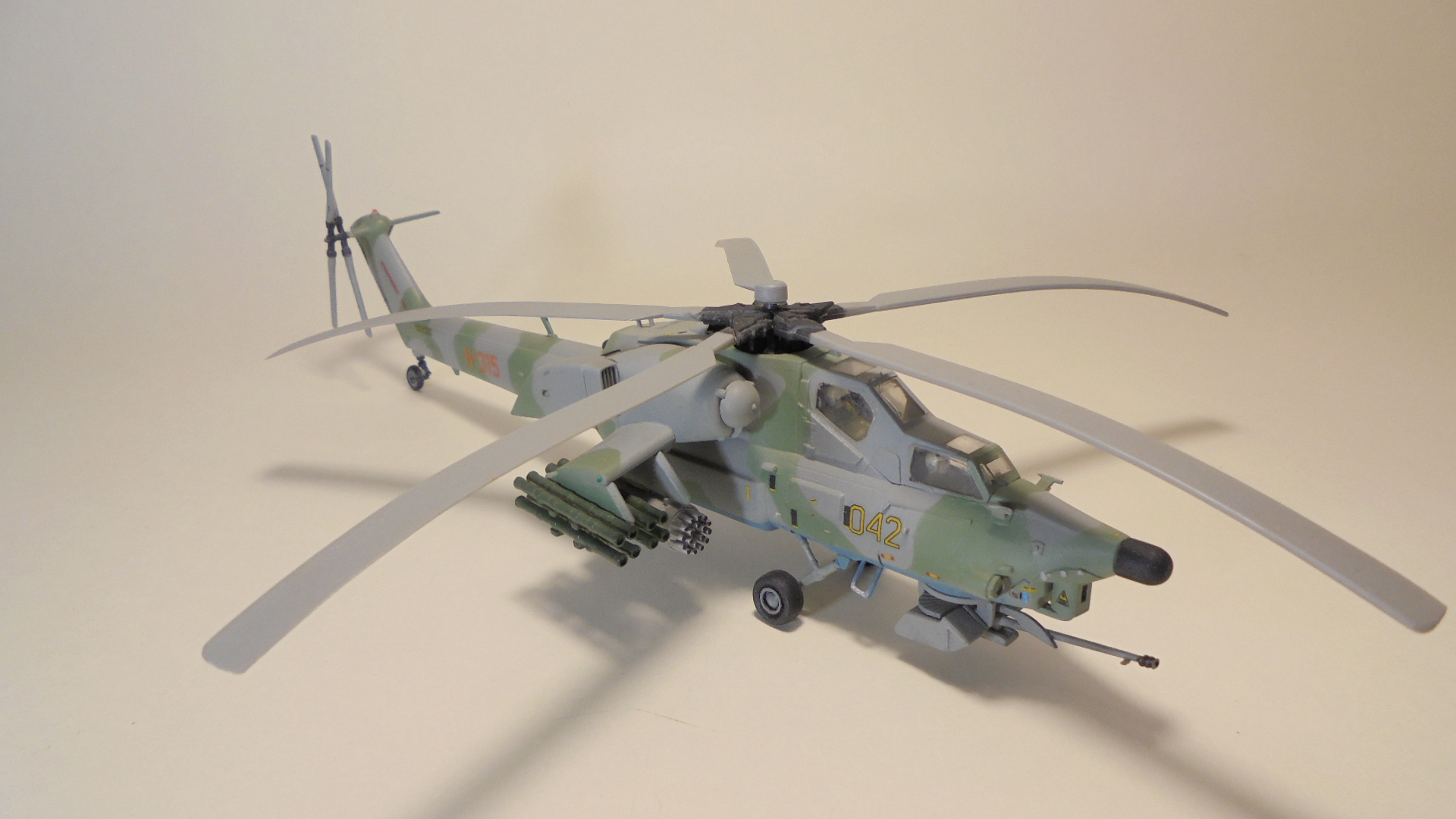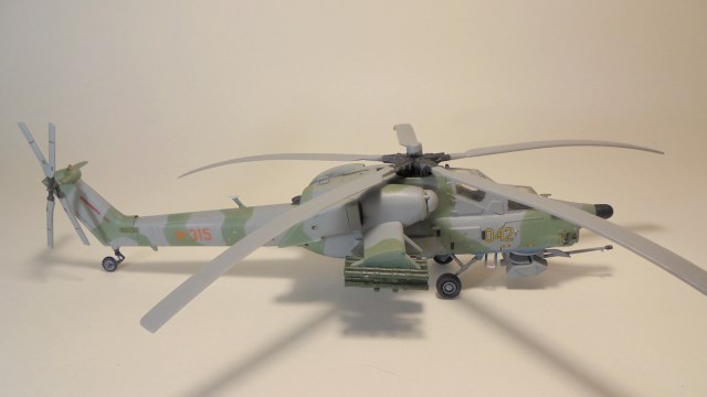 Доброго вечера.Представляю вам модель, боевой вертолёт ОКБ М.Л.Миля.Собирал в далёком 1999 году приобрести этот набор в то время было удачей в нашей деревушке.Собирал из коробки были сделаны лишь АНО и в пушке просверлено отверстие красил какими то красками?Краска от времени выцвела по моему был темнее. Приятного просмотра.