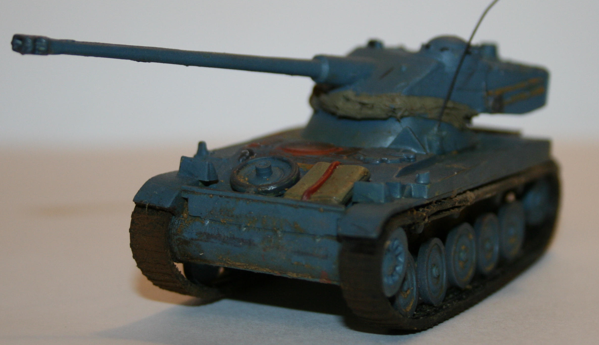 Прошу не судить слишком строго, т.к. это моя первая работа с аэрографом.По поводу модели:очень не понравились виниловые гусеницы (я их оставил только потому что нечем заменить) и шарнирное крепление катков.В результате катки клеились криво.Я как мог искривления устранял,но один каток я побороть так и не смог.По поводу необычной окраски:танк красился в то время,когда я был очарован легкими танками в одной известной игре.В результате в мою головку пришла шальная идея покрасить танк а-ля WoT.