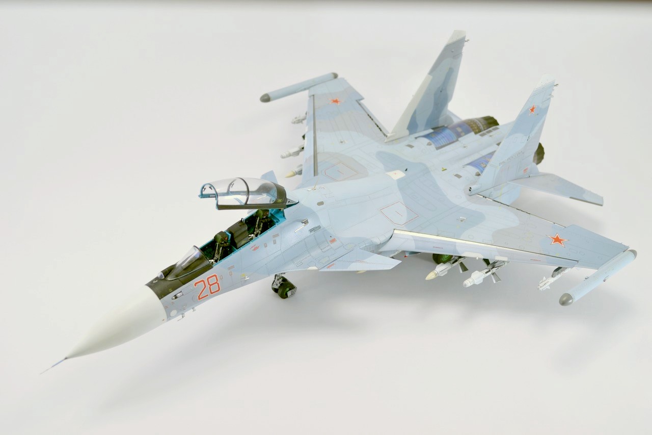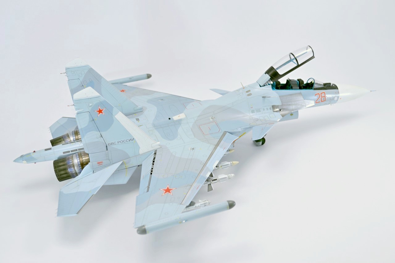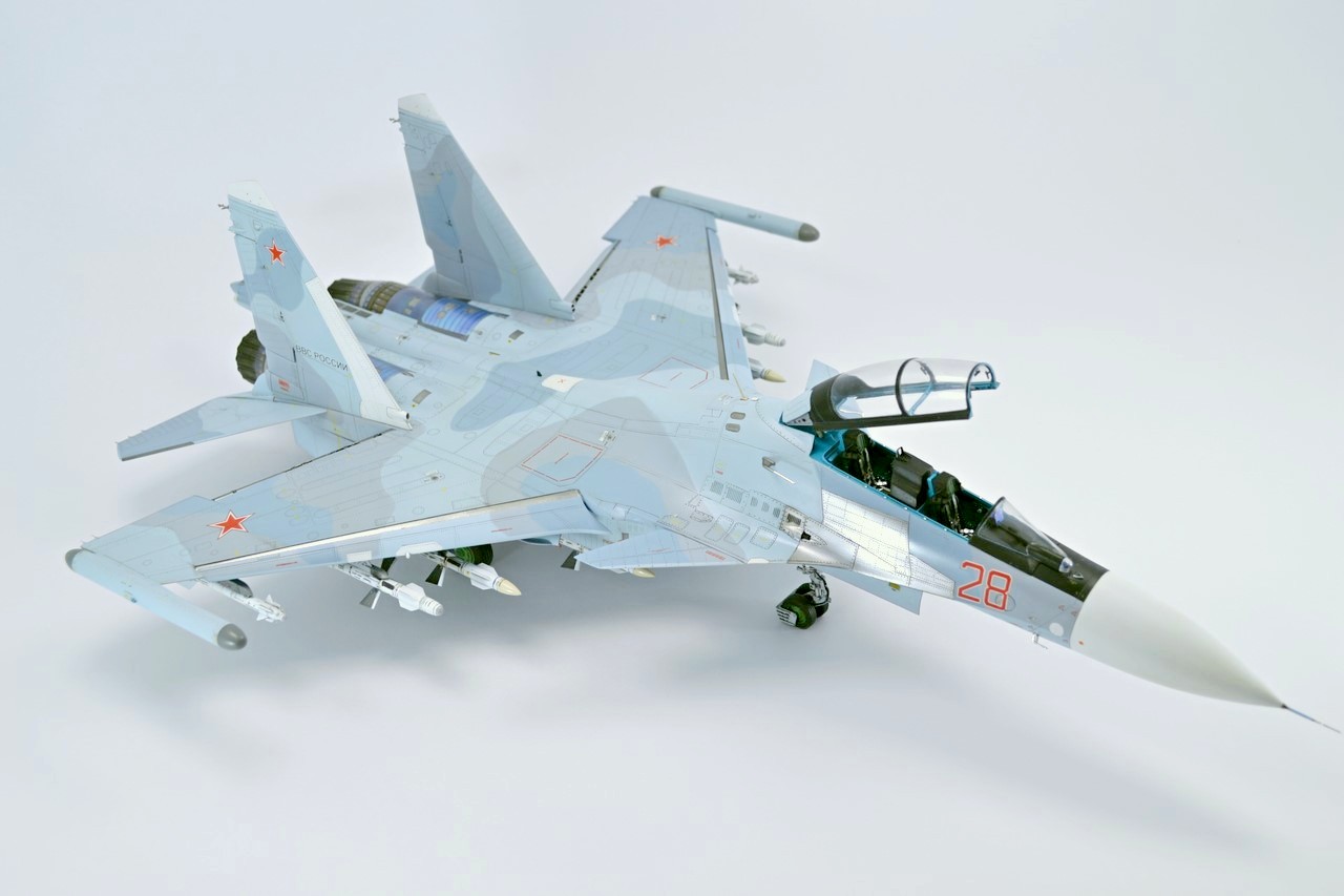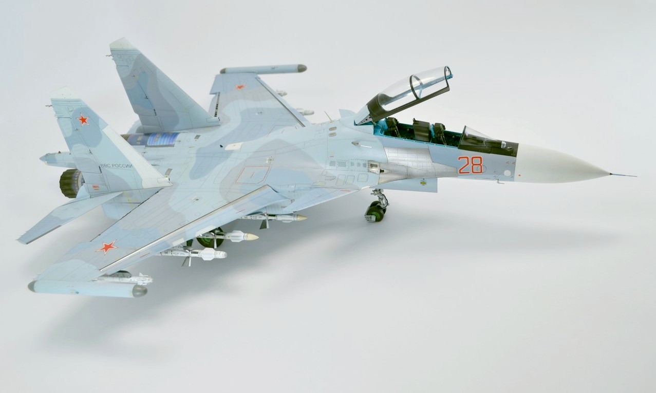 Всем привет! Выставляю на Ваш суд очередную модель из семейства Сухого. За основу выбрал Су-30МКК от HOBBYBOSSт.к. на него есть смола, которую льёт коллега из Малайзии NAZAMODELART, а именно наплывы под ПГО и сами ПГО, кили и всякие антенны применительно для малазийских ВВС. По прототипу привязка к борту кр. №28 выполнявший боевые задачи в Сирии, возможно и сейчас там находится не интересовался.Немного о приобретённой смоле, её литьё просто ужасное, в коробке всё детали просто болтались, в результате все кромки поломались пришлось все склеивать и шлифовать, в некоторых местах настолько смола тонкая пришлось усиливать пластиком, смола при обработке просто крошится, нужно работать нежно, кили и ПГО в пузырях, ямах и рытвинах, кили, поведённые винтом. Стал изучать кили, а они как оказались копией килей от Су-27УБ AСADEMY расшивка и клёпка совпадает, небольшое расхождение антенн. Узлы крепления рулей направления просто имитация. Принял решение кили отработаю от Су-27УБ AСADEMY благо уже давно лежала коробочка, с ПГО пришлось повозиться, с наплывами ПГО тоже косяки, резал фюзеляж по расшивке под ПГО, как показано в инструкции, в итоге левый наплыв по полёту с верху лёг идеально, правый на половину расхождение в 1мм, а низ от 1,5 мм до 2 мм расхождение, пришлось всё наращивать, остальная смола в урну, как-то так, делайте вывод.О сборке.Сборку начал ещё в апреле 2019 года и начал стандартно с кабины, решил внедрить смолу от НеОмеги, предназначенная для СУ-27УБ, вошла без проблем, почему выбрал её, да просто там приборы более рельефнее, совпадают они с оригиналом или нет сравнивать не стал, единственное добавил с левой стороны небольшой ЖКД, переделал приборки, в оригинале на передней панели 3 ЖКД на задней 4 ЖКД один их них большой, имитировал ЖКД декалями от AIRSCALE, по правым боковым панелям добавил бачки. Также сделал за ново кожух передней панели и ОЛС под неё, на заднем кожухе сделал козырёк более выступающим.Переделал как всегда узлы крепления отклонения флаперонов, рули поворота тоже довёл до ума, на килях с внешних боков установил антенны, а также по всему фюзеляжу. Переделал поворотные узлы стабилизаторов, обтекатели на них под гидравлику. Отклоняемые носки сделал с небольшим углом, что бы немного были по длине под ограничители отклонения носков.Сделал заново под крыльевые площадки под пилоны.Вооружение:- ракеты Р-27ЭТ, ЭР, и Р с пилонами под них от EDUARD;- «Хибины», сопла и Р-77 с пилонами от Су-35С GWH;- Р-73 с пилонами от Су-33 были в остатках.Деки использовал от Бегемота на Су-27 и Су-35С «техничка» и то не всю, опираясь на реальные борта там её мало, короче импровизировал как мог. Заказывал декаль имитирующая ИК ловушки. Приклеил плёнку на стекло ОЛС.Нишу под переднюю стойку шасси заменил от WOLFPACK, саму стойку немного «оживил» добавил всякие трубки, а ниши под основные стойки шасси и сами стойки, оставил как есть. Кресла тоже переделал, заголовник приспособил от НеОмеги, немного доработал (клёпка Арчи и так по мелочи), ремни от NanoAviation. Использовал травление от DreamModel на фонарь и датчики угла атаки, ПВД от MASTER MODEL.Колёсаот Arma Models (AM4829). Краска Акан: под основной цвет 73190 и камуфляж 73191,73192.Краска металлики для движков и сопел: ALCLAD, XTREMMETAL.Прозрачный лак акрил: MRHOBBY (H93-clearblu), TAMIYA (X23- clearblu), H93 темнее, чем X23.Собственно всё, жду замечания.