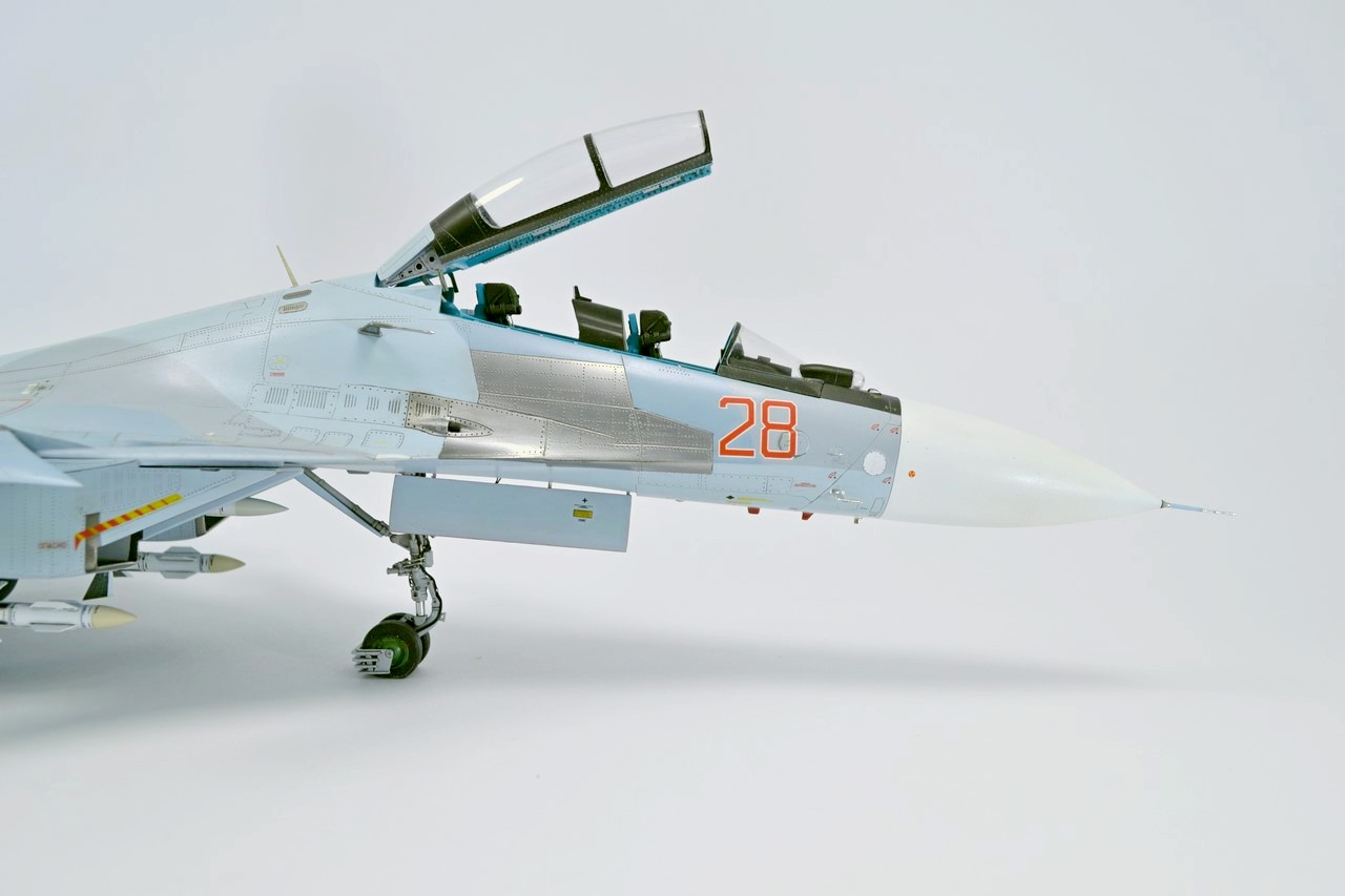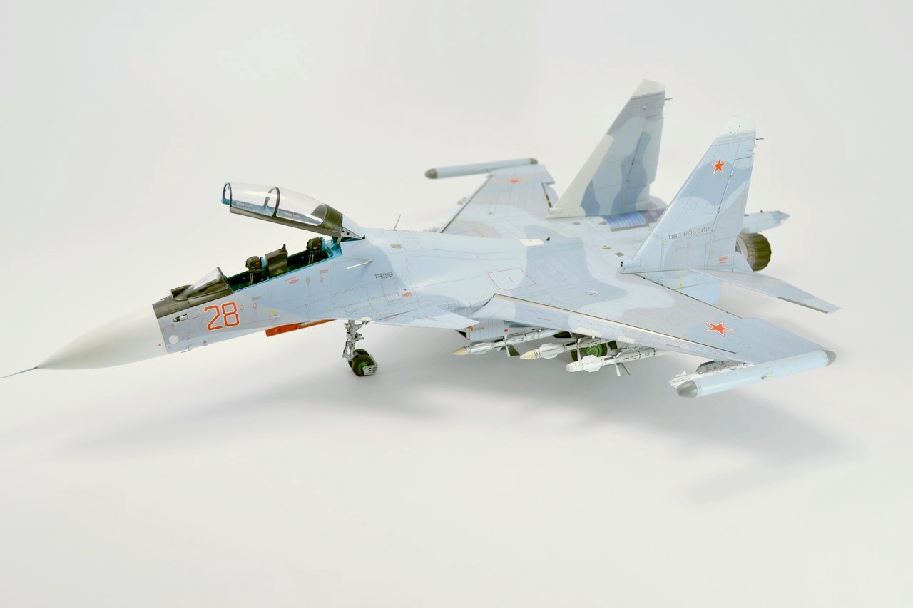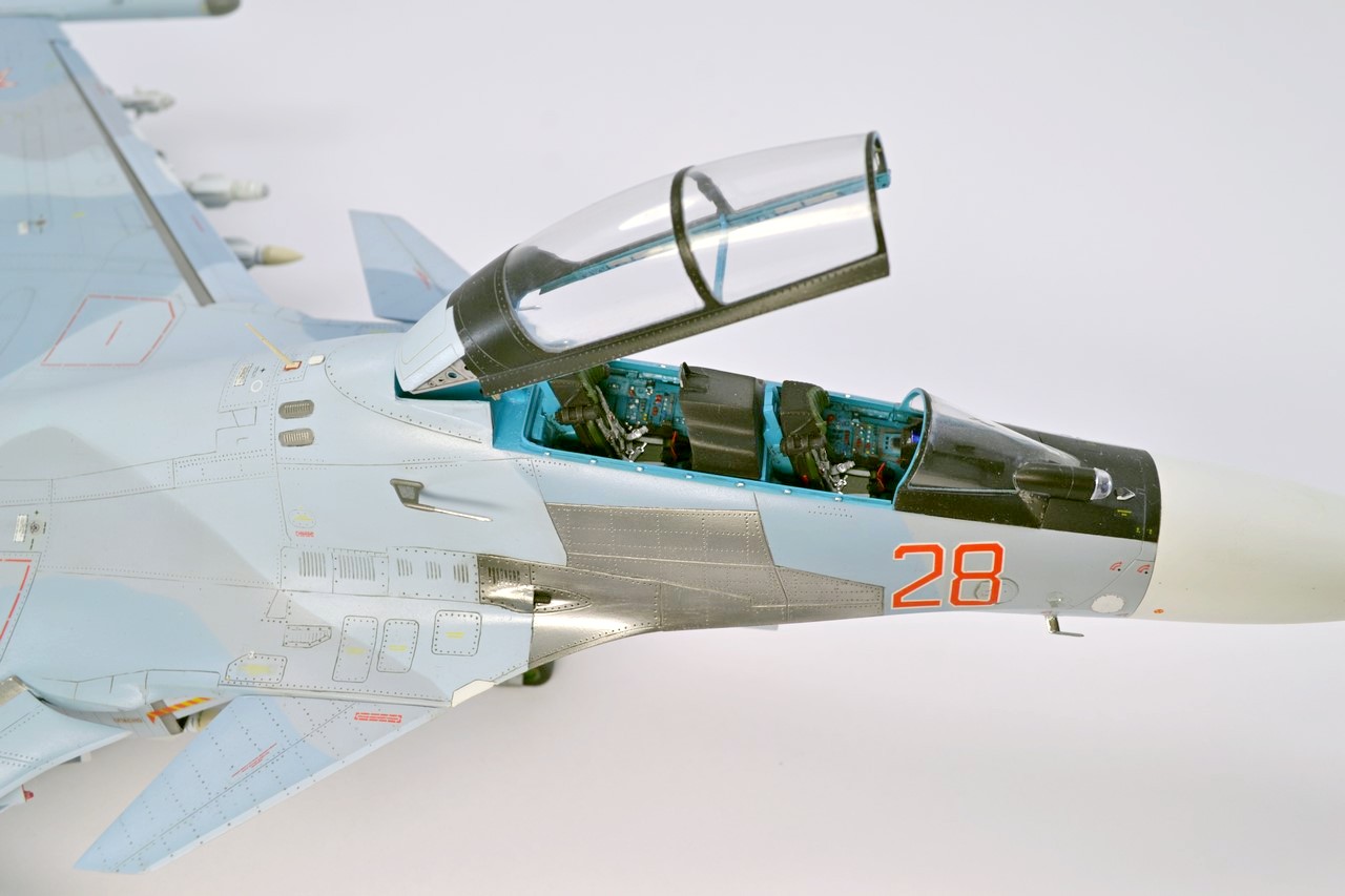 Всем привет! Выставляю на Ваш суд очередную модель из семейства Сухого. За основу выбрал Су-30МКК от HOBBYBOSSт.к. на него есть смола, которую льёт коллега из Малайзии NAZAMODELART, а именно наплывы под ПГО и сами ПГО, кили и всякие антенны применительно для малазийских ВВС. По прототипу привязка к борту кр. №28 выполнявший боевые задачи в Сирии, возможно и сейчас там находится не интересовался.Немного о приобретённой смоле, её литьё просто ужасное, в коробке всё детали просто болтались, в результате все кромки поломались пришлось все склеивать и шлифовать, в некоторых местах настолько смола тонкая пришлось усиливать пластиком, смола при обработке просто крошится, нужно работать нежно, кили и ПГО в пузырях, ямах и рытвинах, кили, поведённые винтом. Стал изучать кили, а они как оказались копией килей от Су-27УБ AСADEMY расшивка и клёпка совпадает, небольшое расхождение антенн. Узлы крепления рулей направления просто имитация. Принял решение кили отработаю от Су-27УБ AСADEMY благо уже давно лежала коробочка, с ПГО пришлось повозиться, с наплывами ПГО тоже косяки, резал фюзеляж по расшивке под ПГО, как показано в инструкции, в итоге левый наплыв по полёту с верху лёг идеально, правый на половину расхождение в 1мм, а низ от 1,5 мм до 2 мм расхождение, пришлось всё наращивать, остальная смола в урну, как-то так, делайте вывод.О сборке.Сборку начал ещё в апреле 2019 года и начал стандартно с кабины, решил внедрить смолу от НеОмеги, предназначенная для СУ-27УБ, вошла без проблем, почему выбрал её, да просто там приборы более рельефнее, совпадают они с оригиналом или нет сравнивать не стал, единственное добавил с левой стороны небольшой ЖКД, переделал приборки, в оригинале на передней панели 3 ЖКД на задней 4 ЖКД один их них большой, имитировал ЖКД декалями от AIRSCALE, по правым боковым панелям добавил бачки. Также сделал за ново кожух передней панели и ОЛС под неё, на заднем кожухе сделал козырёк более выступающим.Переделал как всегда узлы крепления отклонения флаперонов, рули поворота тоже довёл до ума, на килях с внешних боков установил антенны, а также по всему фюзеляжу. Переделал поворотные узлы стабилизаторов, обтекатели на них под гидравлику. Отклоняемые носки сделал с небольшим углом, что бы немного были по длине под ограничители отклонения носков.Сделал заново под крыльевые площадки под пилоны.Вооружение:- ракеты Р-27ЭТ, ЭР, и Р с пилонами под них от EDUARD;- «Хибины», сопла и Р-77 с пилонами от Су-35С GWH;- Р-73 с пилонами от Су-33 были в остатках.Деки использовал от Бегемота на Су-27 и Су-35С «техничка» и то не всю, опираясь на реальные борта там её мало, короче импровизировал как мог. Заказывал декаль имитирующая ИК ловушки. Приклеил плёнку на стекло ОЛС.Нишу под переднюю стойку шасси заменил от WOLFPACK, саму стойку немного «оживил» добавил всякие трубки, а ниши под основные стойки шасси и сами стойки, оставил как есть. Кресла тоже переделал, заголовник приспособил от НеОмеги, немного доработал (клёпка Арчи и так по мелочи), ремни от NanoAviation. Использовал травление от DreamModel на фонарь и датчики угла атаки, ПВД от MASTER MODEL.Колёсаот Arma Models (AM4829). Краска Акан: под основной цвет 73190 и камуфляж 73191,73192.Краска металлики для движков и сопел: ALCLAD, XTREMMETAL.Прозрачный лак акрил: MRHOBBY (H93-clearblu), TAMIYA (X23- clearblu), H93 темнее, чем X23.Собственно всё, жду замечания.