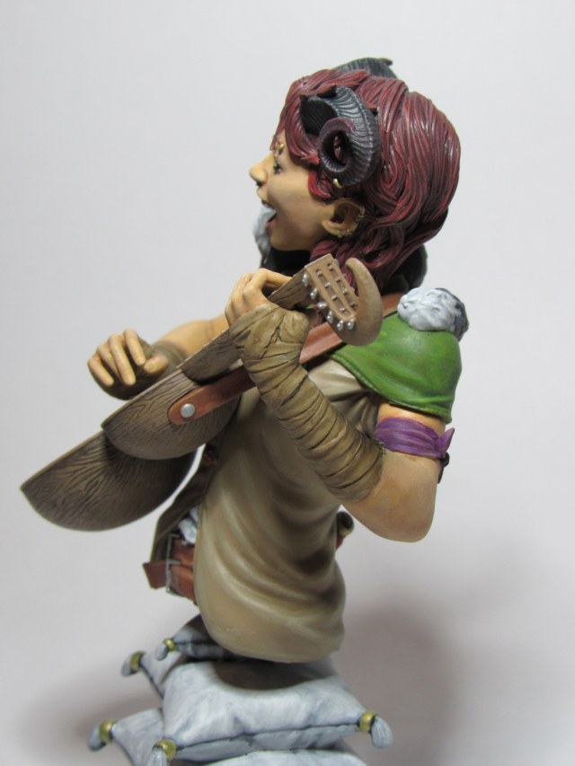 К покраске есть вопросы. Надо усложнять тело, лицо. Границы цветовых переходов не сглажены, пятнами. Лады на инструменте покрашены неаккуратно - на 9-м фото видно. И струны не помешали бы, это правда.