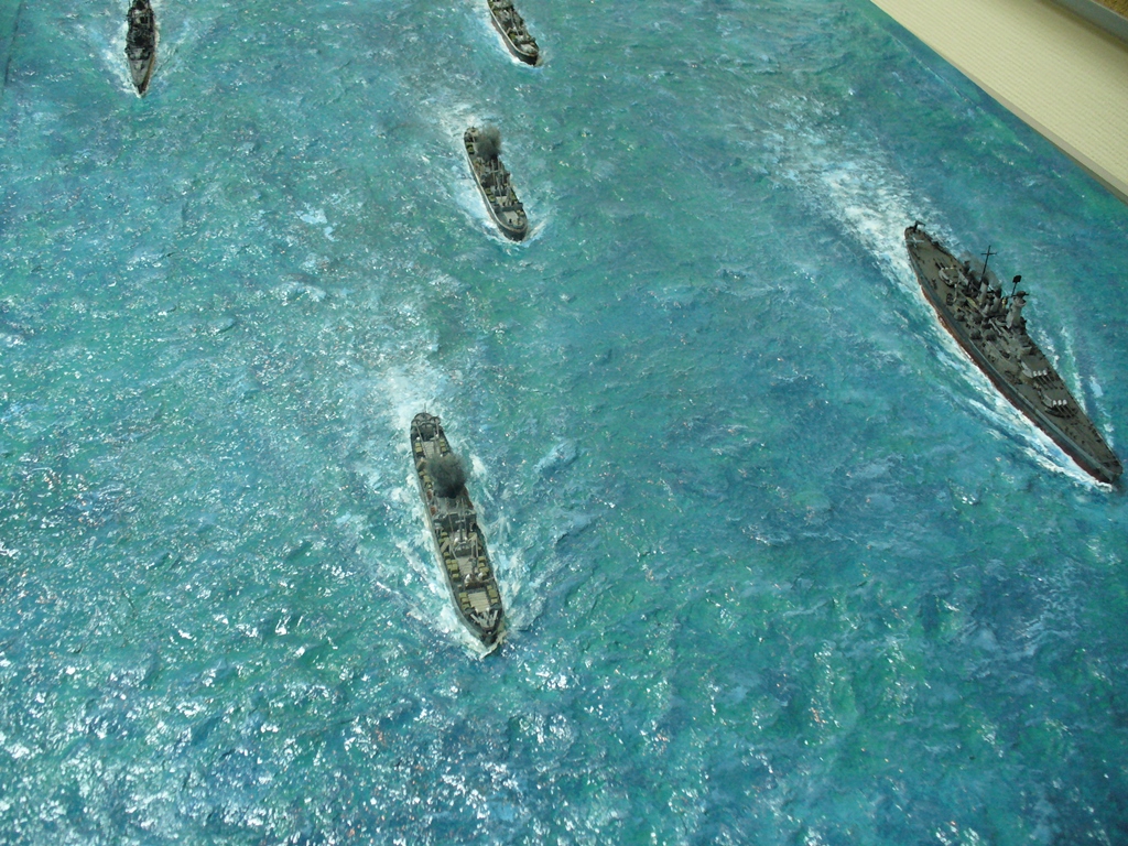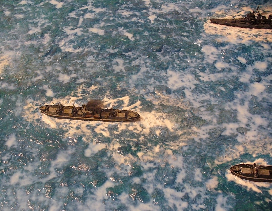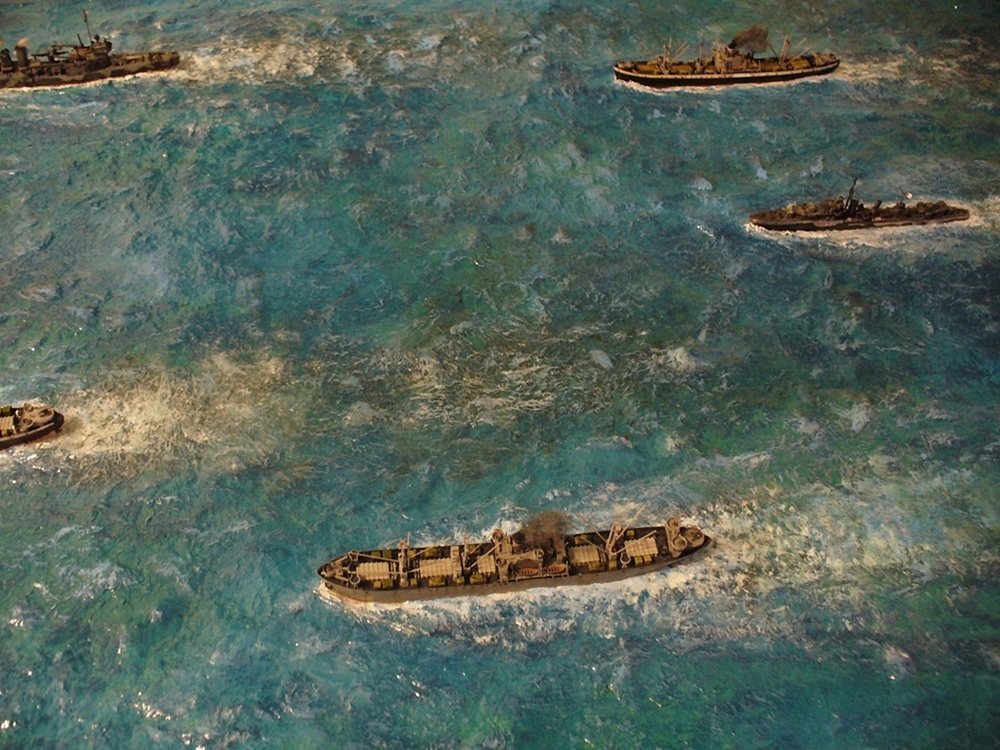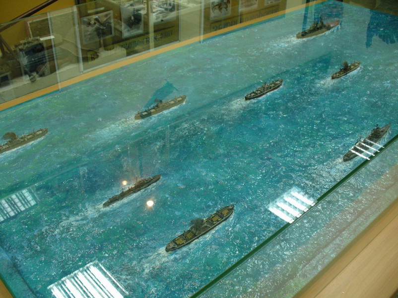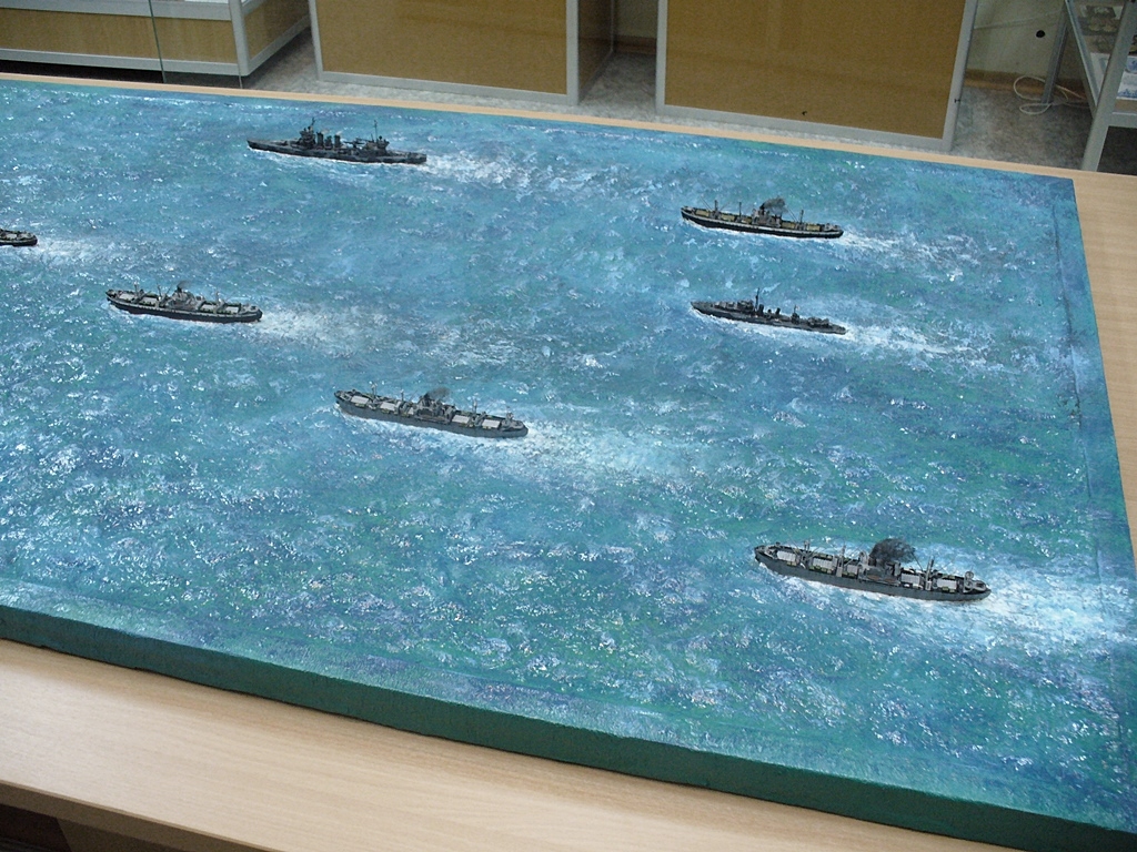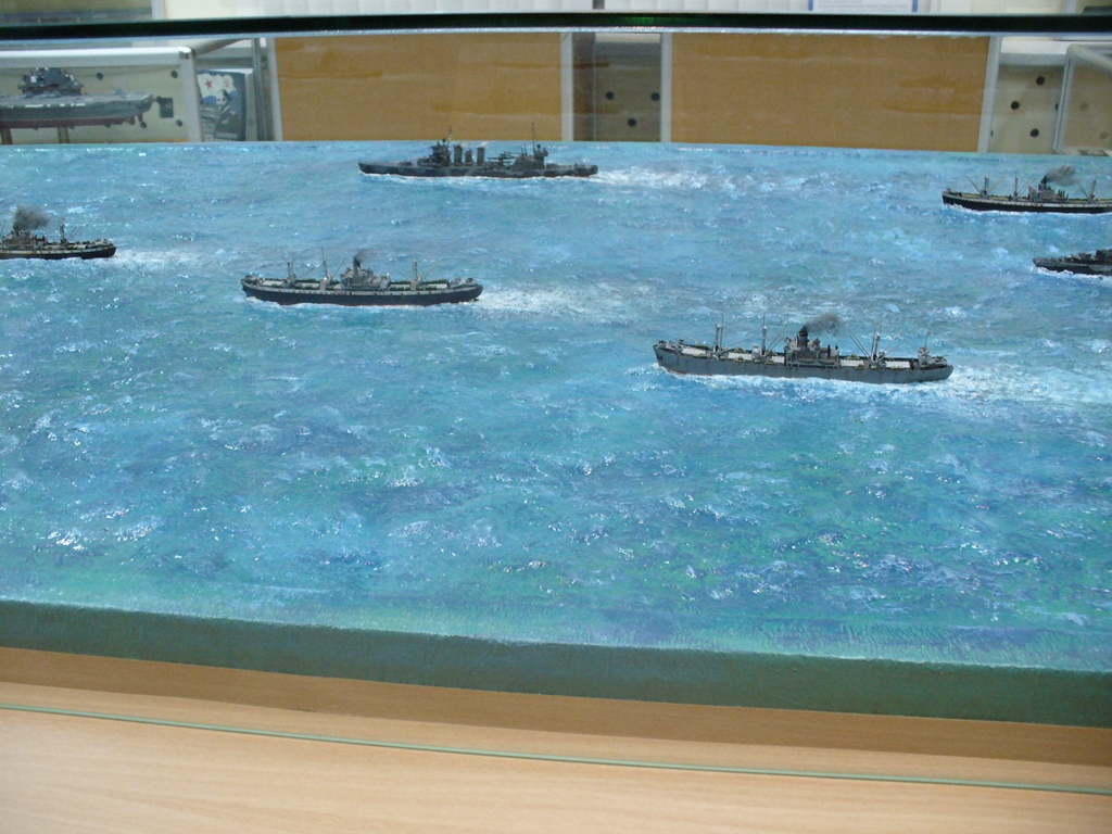 Диорама "Конвой PQ-17" исполнена как экспонат музея, освещающий страницу полярных конвоев Второй мировой. Линкор "Вашингтон" и крейсер "Тускалуза" символизируют о приданных к конвою двух группах охранения. Размер диорамы 2,07м х 1м. Основание изготовлено из досок, алюминиевого уголка. Море - бумажные полотенца и ПВА (всего потребовалось 17 больших рулонов и около 10кг ПВА). Море задуто в два тона краской для граффити и покрашено акриловыми красками из тубов "Ладога". Прозрачный слой моря - глянцевый акриловый гель Idea и глянцевый акриловый лак. Модели кораблей (линкор, крейсер + "Зулус" и "Либерти") все от Trumpeter, всего 9 шт.