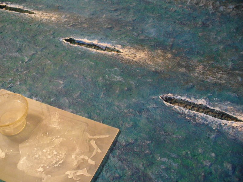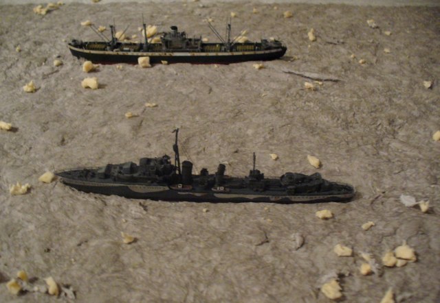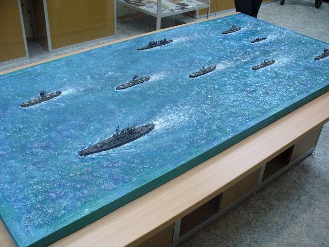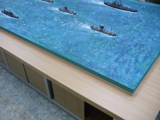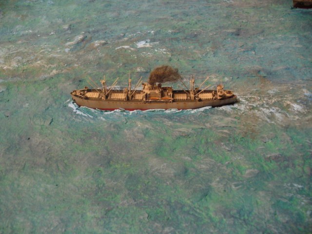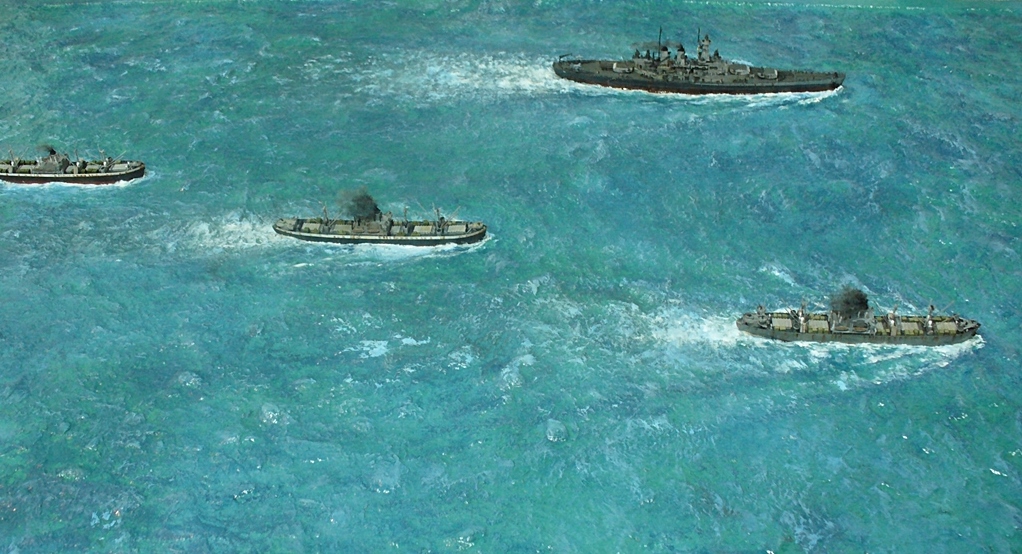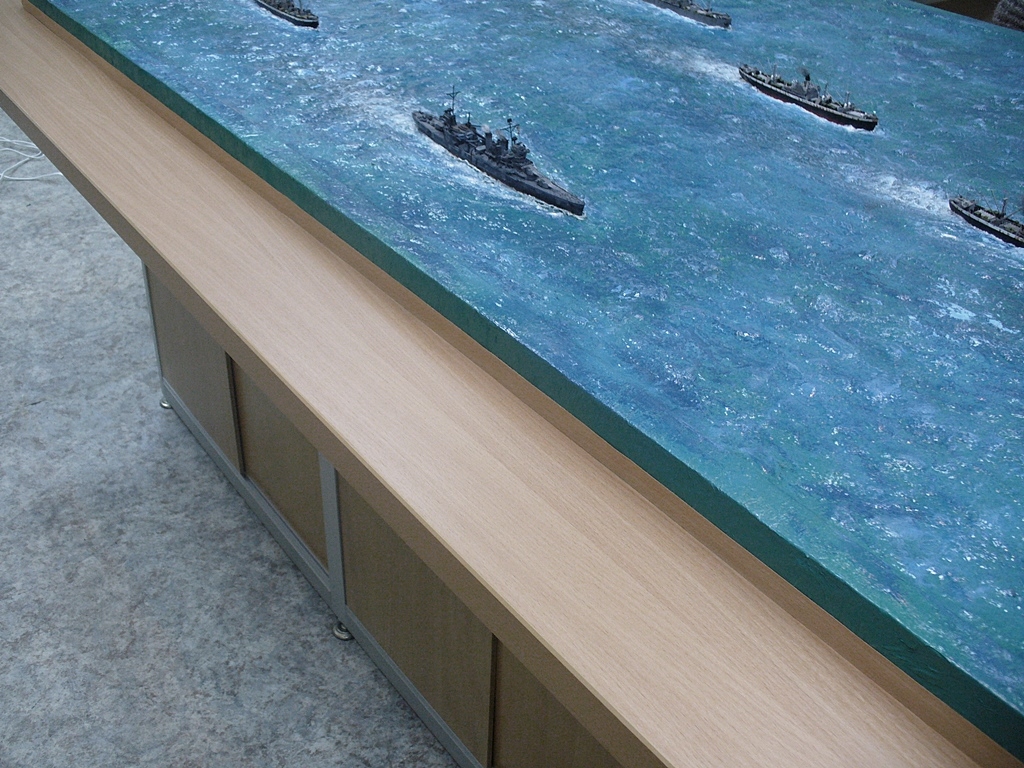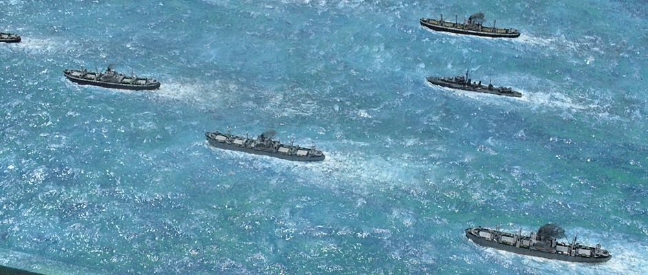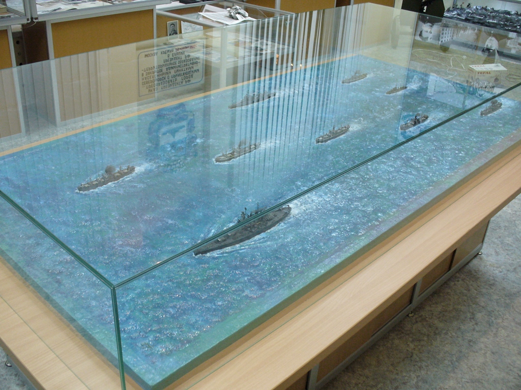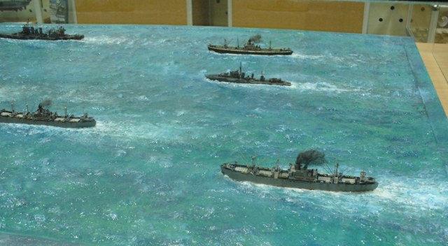 Диорама "Конвой PQ-17" исполнена как экспонат музея, освещающий страницу полярных конвоев Второй мировой. Линкор "Вашингтон" и крейсер "Тускалуза" символизируют о приданных к конвою двух группах охранения. Размер диорамы 2,07м х 1м. Основание изготовлено из досок, алюминиевого уголка. Море - бумажные полотенца и ПВА (всего потребовалось 17 больших рулонов и около 10кг ПВА). Море задуто в два тона краской для граффити и покрашено акриловыми красками из тубов "Ладога". Прозрачный слой моря - глянцевый акриловый гель Idea и глянцевый акриловый лак. Модели кораблей (линкор, крейсер + "Зулус" и "Либерти") все от Trumpeter, всего 9 шт.