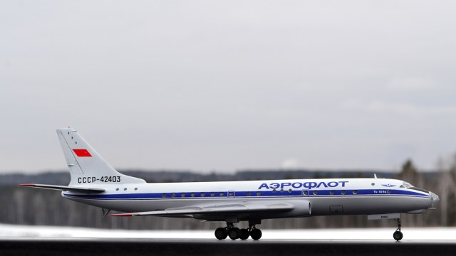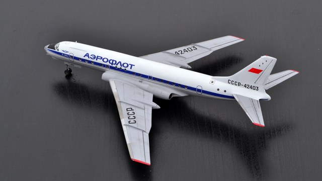 Даже не знаю, что ещё можно сказать про этот самолёт, всё и так давно известно. Пока капиталистический мир отдувался за грубые просчёты при проектированные Кометы, партия решила догнать и перегнать проклятых буржуев, выкатив на авансцену плохо управляемый, неустойчивый и вообще просто непригодный для перевозки пассажиров переделанный бомбардировщик. Как результат - почти четверть построенных самолётов потеряно в катастрофах и более тысячи человек убито. Но что стоила человеческая жизнь, когда на кону стоял политический престиж. Когда было важно, чтобы весь мир знал, что именно в нашей стране пассажиров возят современные реактивные лайнеры, пока все остальные страны корячатся на доисторических поршнях. И тем не менее, Ту-104 останется в истории, как тот самый - первый с реактивными двигателями. Поэтому его модель определённо заслуживает внимания.