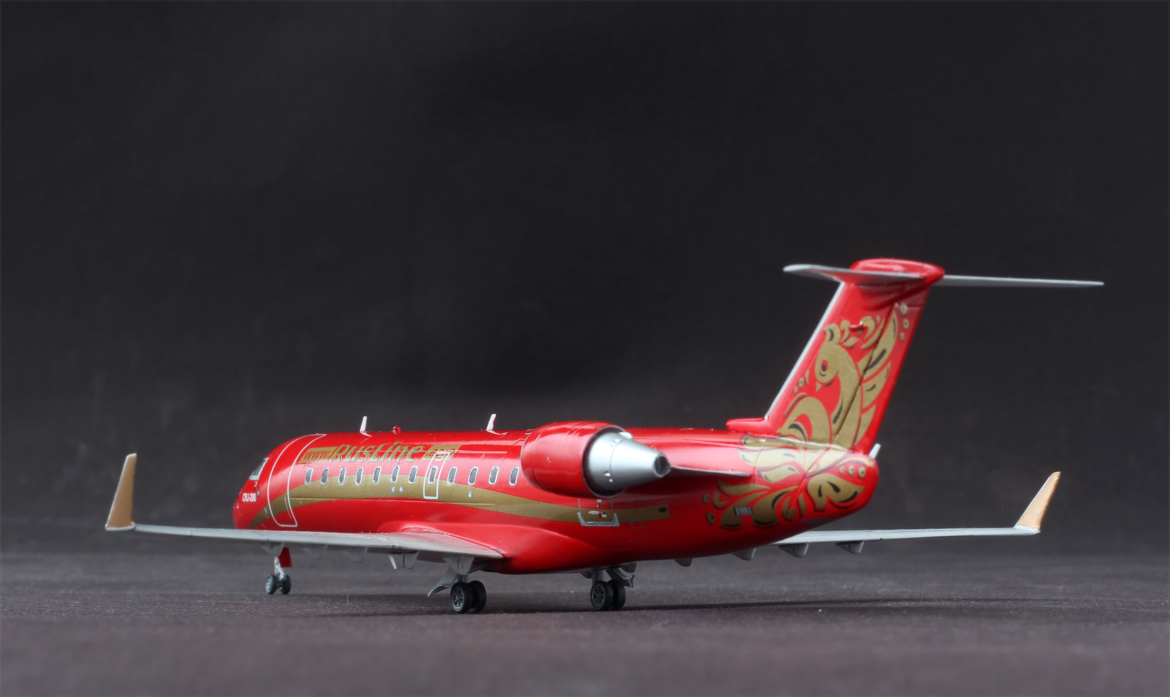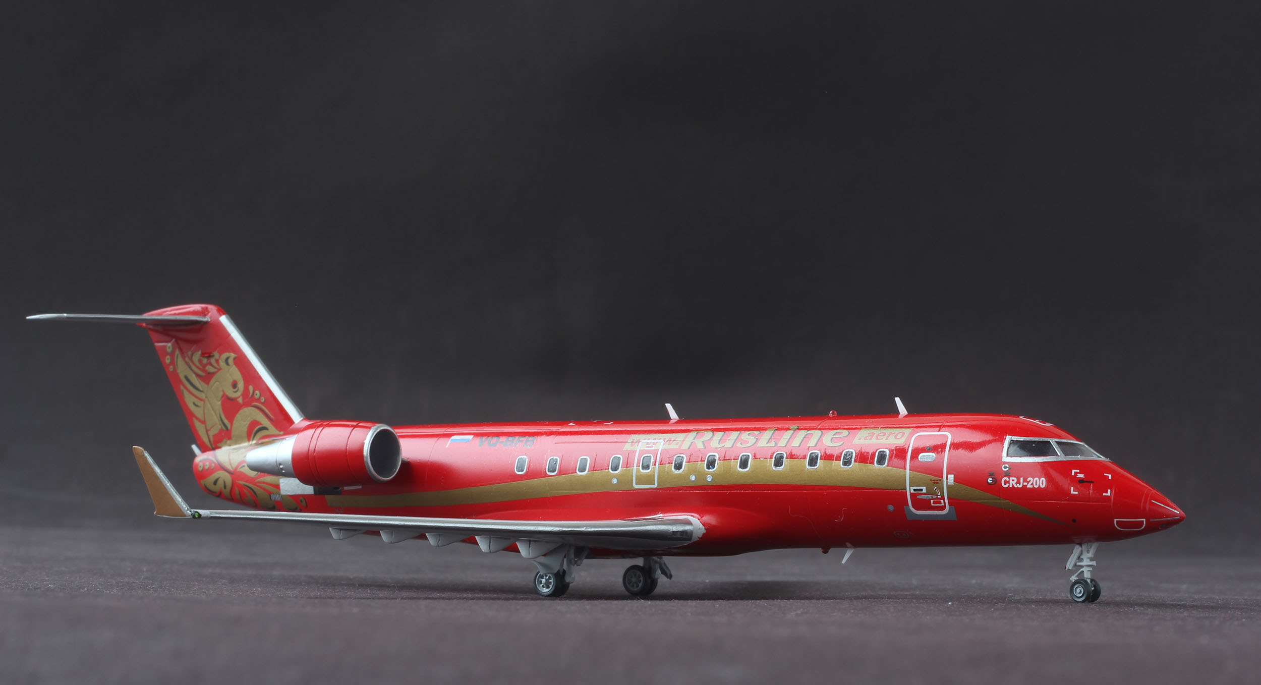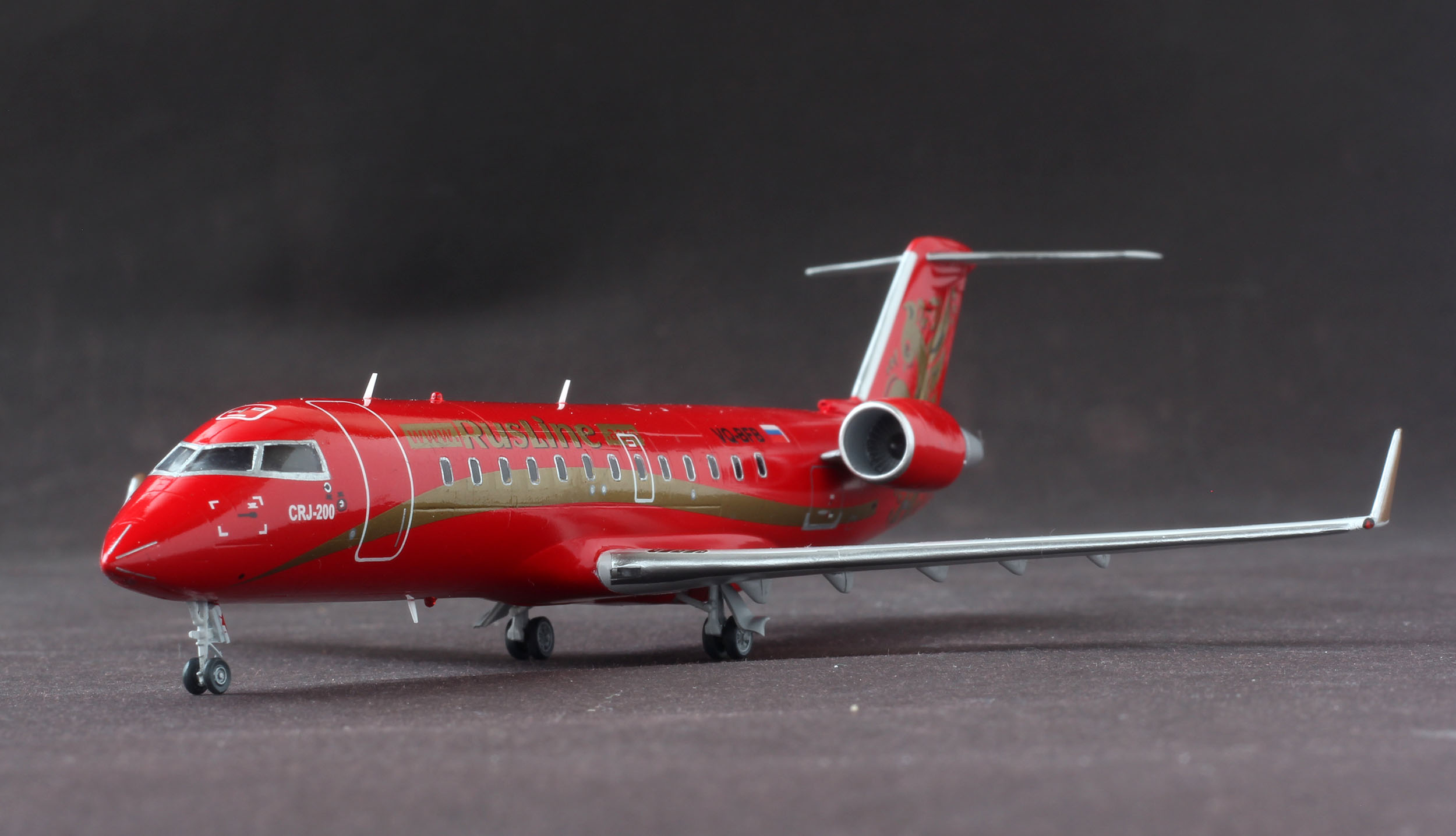 Сегодня наконец удалось отснять CRJ-200 Rus Line VQ-BFB. Модель от AWM. Смола, с возможностью собрать модель с прозрачным остеклением. Стыкуется все очень не плохо, единственное, тонковата расшивка. В наборе идут маски на стекла, но к сожалению они не совпадают с серебряными рамками из декали. С лобовиком пришлось повозиться, разрезая рамку на мелкие сегменты, а рамки иллюминаторов пришлось взять от звездовского 737. По какой то странной причине, краска начала отрываться кое гле со скотчем, в итоге все посы, это окрашенная декальная бумага. Сама декаль из набора доставила немного хлопот, трескаясь при переводе длинной золотой полосы. Пачкать практически не стал, мне понравилось, как он выглядит чистым. К сожалению есть несколько косяков, но для меня модель размером 10см оказалась не самой простой. Заранее спасибо за комментарии, конструктивная критика приветствуется.