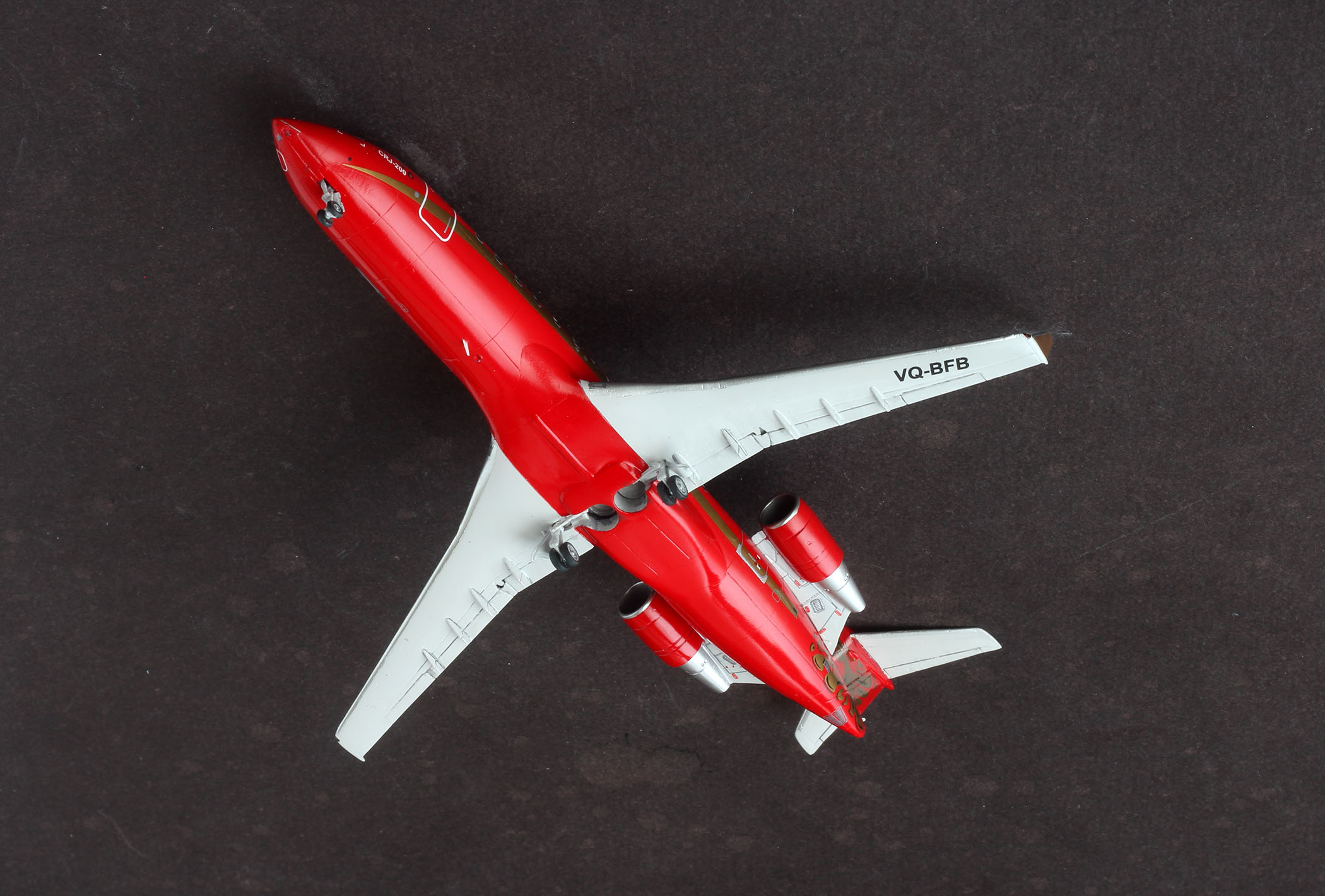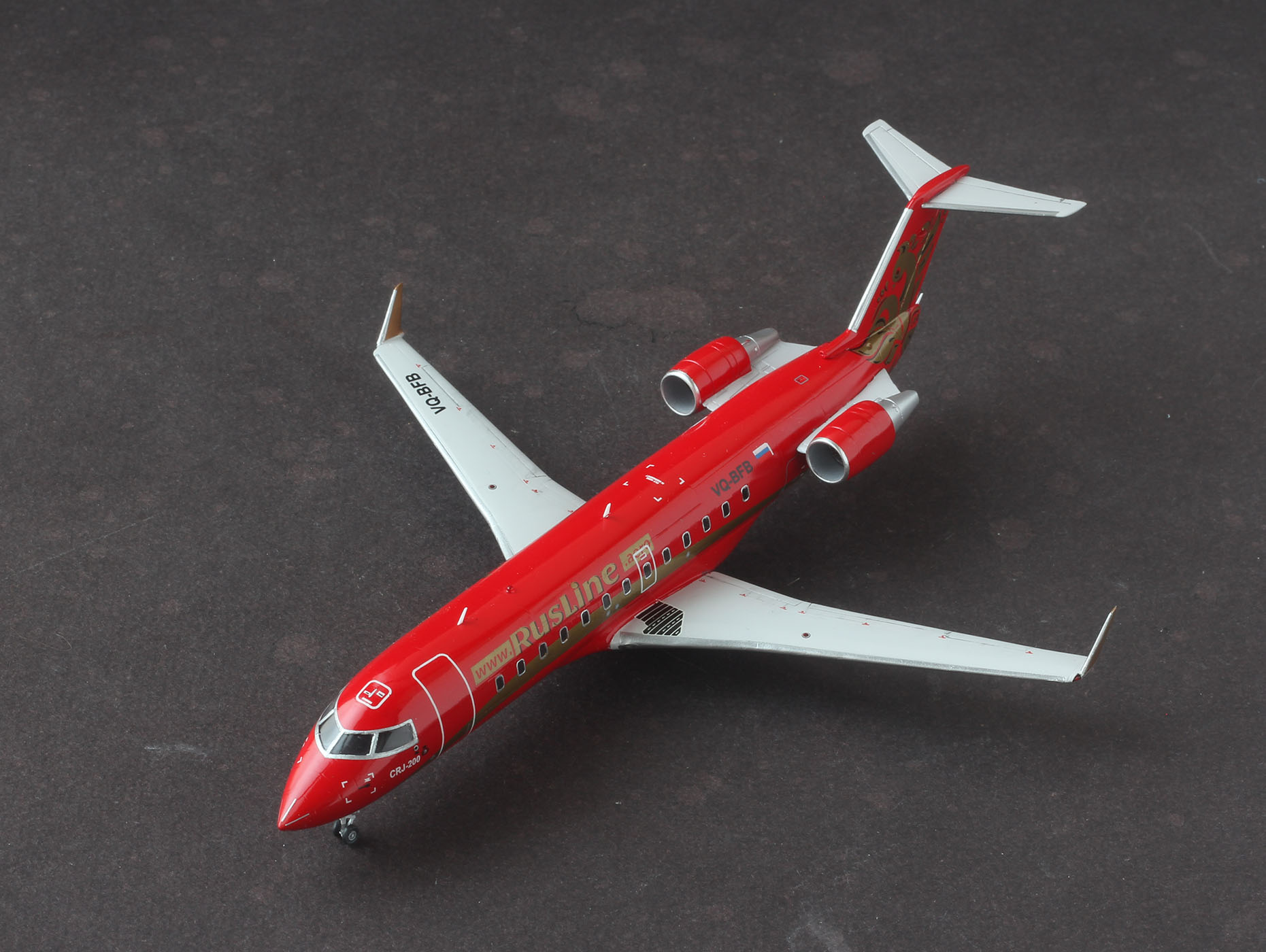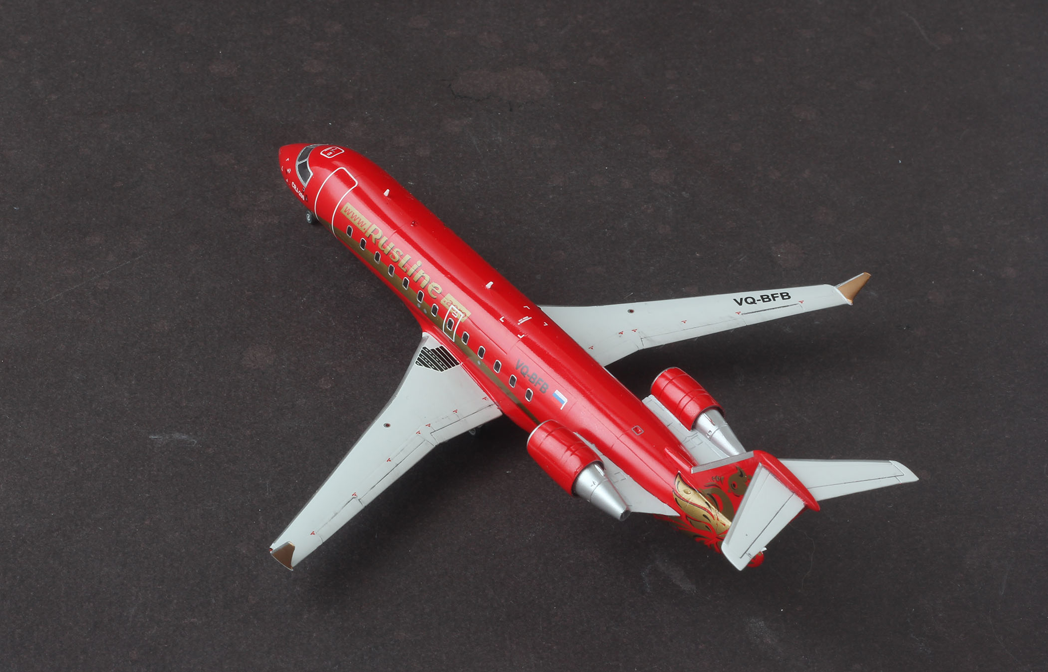 Сегодня наконец удалось отснять CRJ-200 Rus Line VQ-BFB. Модель от AWM. Смола, с возможностью собрать модель с прозрачным остеклением. Стыкуется все очень не плохо, единственное, тонковата расшивка. В наборе идут маски на стекла, но к сожалению они не совпадают с серебряными рамками из декали. С лобовиком пришлось повозиться, разрезая рамку на мелкие сегменты, а рамки иллюминаторов пришлось взять от звездовского 737. По какой то странной причине, краска начала отрываться кое гле со скотчем, в итоге все посы, это окрашенная декальная бумага. Сама декаль из набора доставила немного хлопот, трескаясь при переводе длинной золотой полосы. Пачкать практически не стал, мне понравилось, как он выглядит чистым. К сожалению есть несколько косяков, но для меня модель размером 10см оказалась не самой простой. Заранее спасибо за комментарии, конструктивная критика приветствуется.