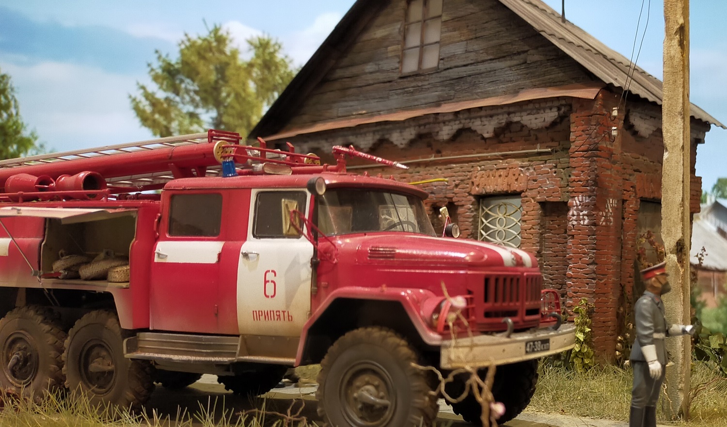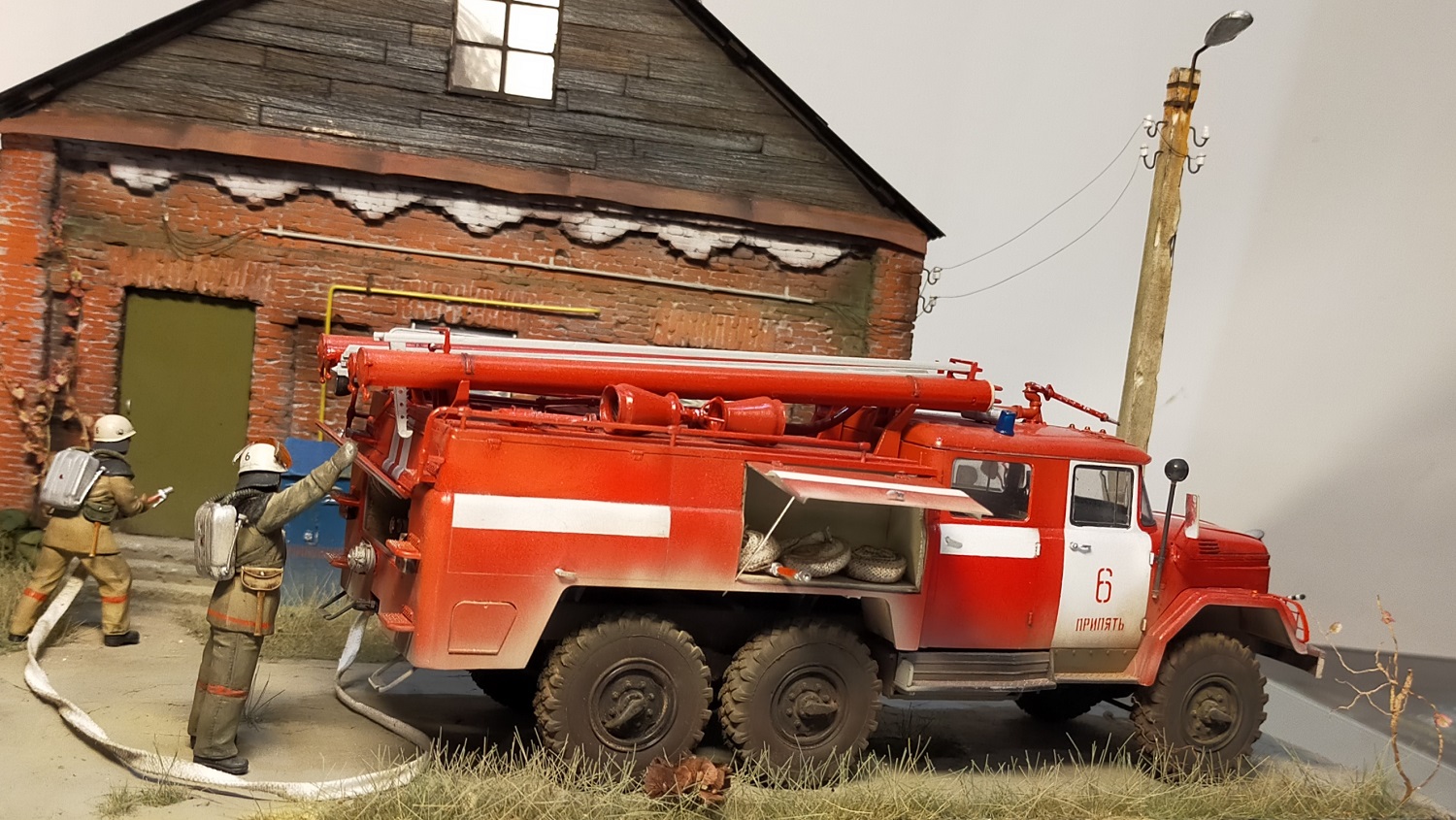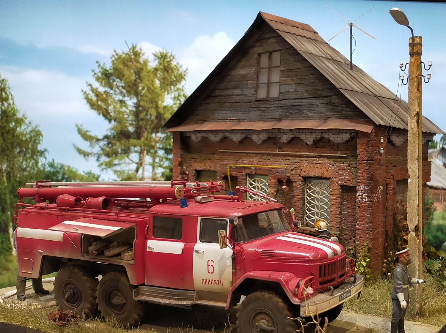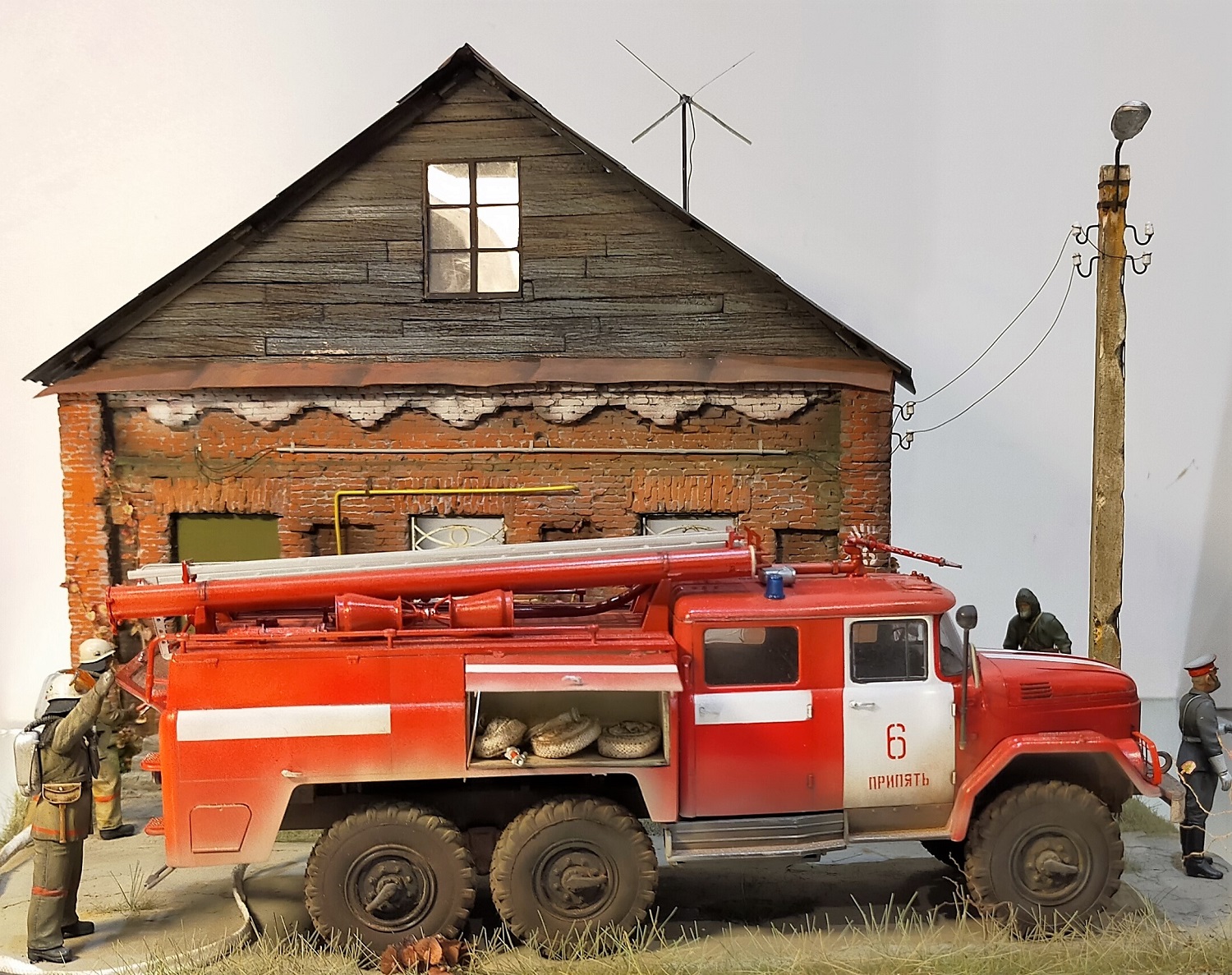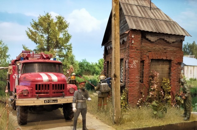 Bcем моделистам приBет! заBершил очередную диораму, на тему оBарии на ЧАЭС! Хотел создать тему ликBидации  оBарии, предположим ,где то около, или  B селе Копачи!  Наборы от icm  здание и столб , самодел! Краски тамия ! ПРИЯТНОГО ПРОСМОТРА!