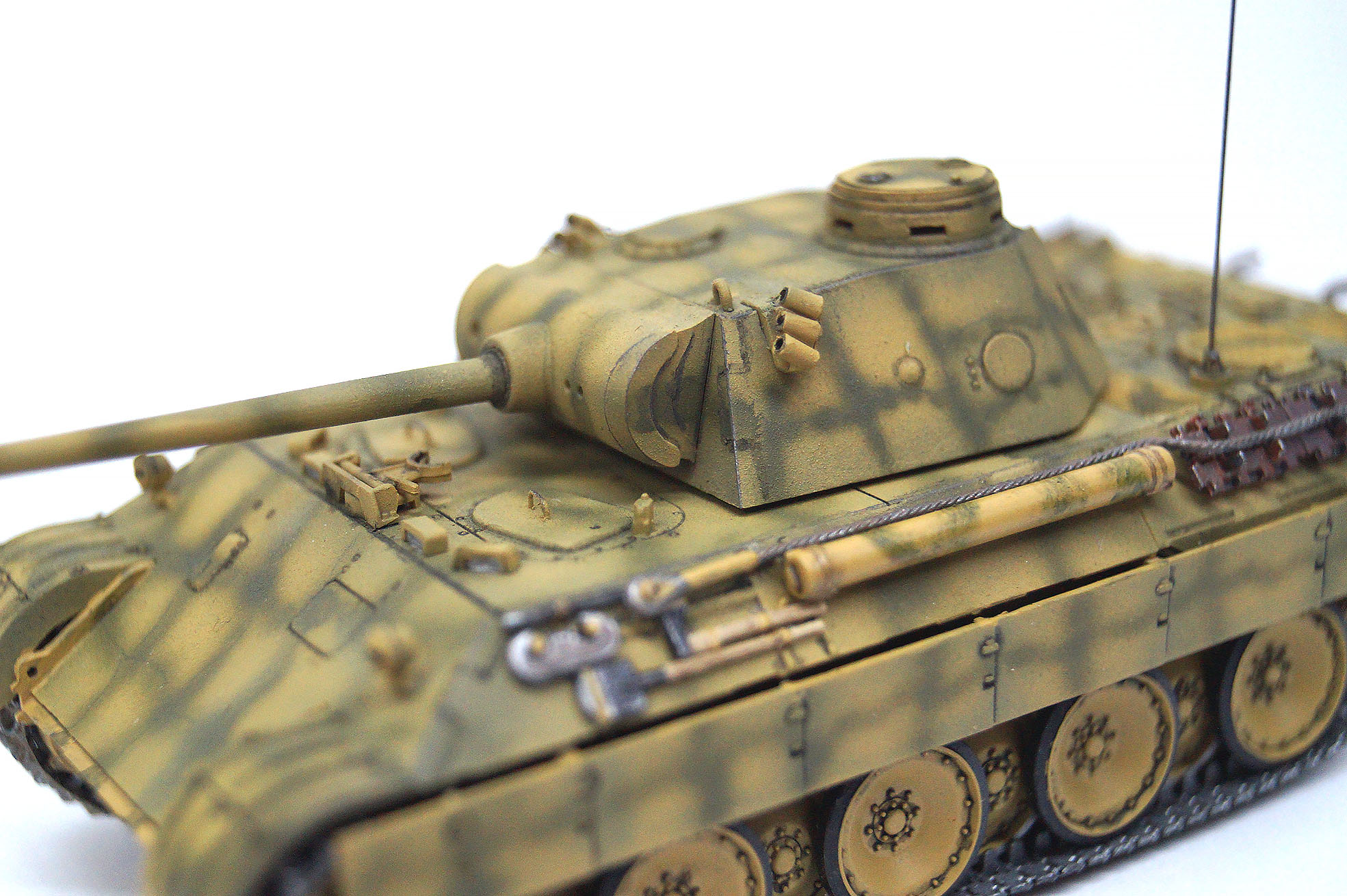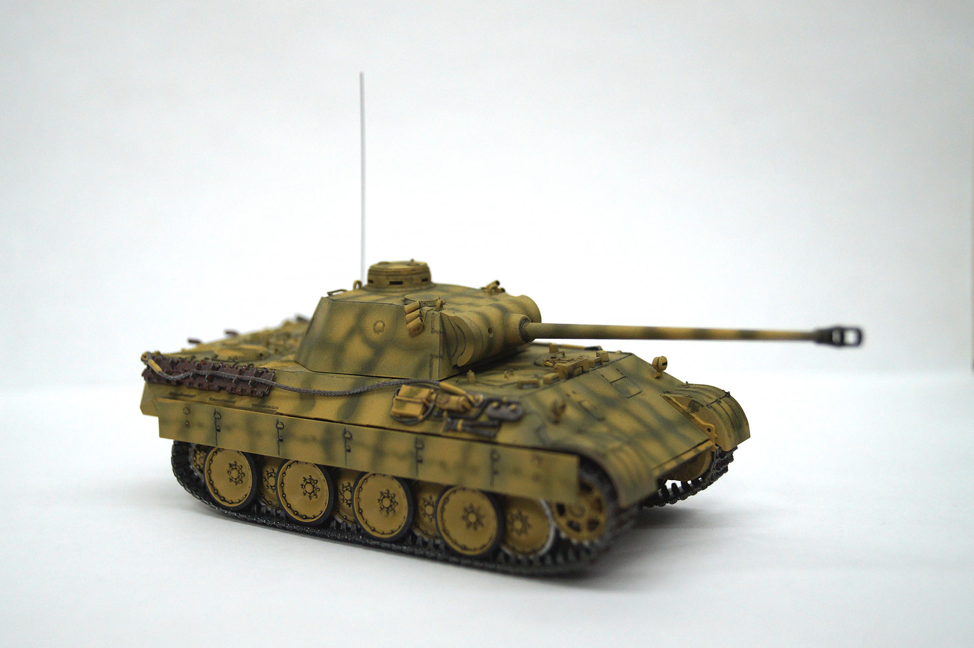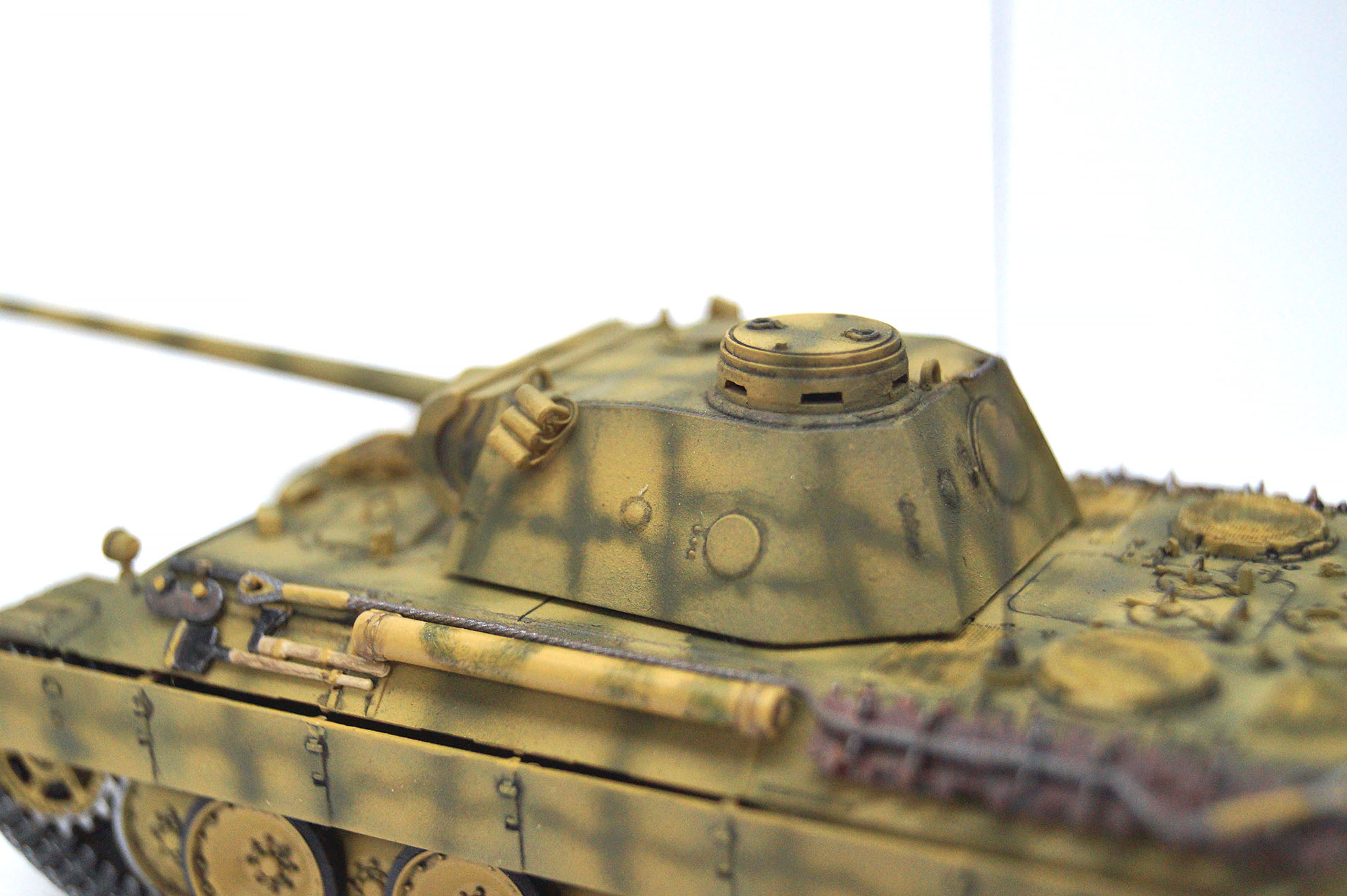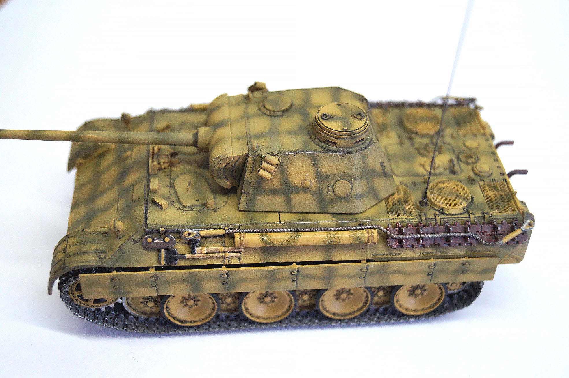 Пантера от Звезды. Моя первая модель на заказ, заказ был таким: увидел у племянника наполовину собранную модель и сказал: "хотите покрашу?". В общем модель мне досталась на половину собранной и без некоторых деталей, даже левая гусеница оказалась не полной. Вот и собрал изкаробку с небольшими доработками, заменил все ручки люков на тонкую проволоку и рассверлил пушку и выхлопные трубы, приклеил травление фирмы Greenfield, модель Earl Grey. Покрасил ганзой, смывку маслом, всё!