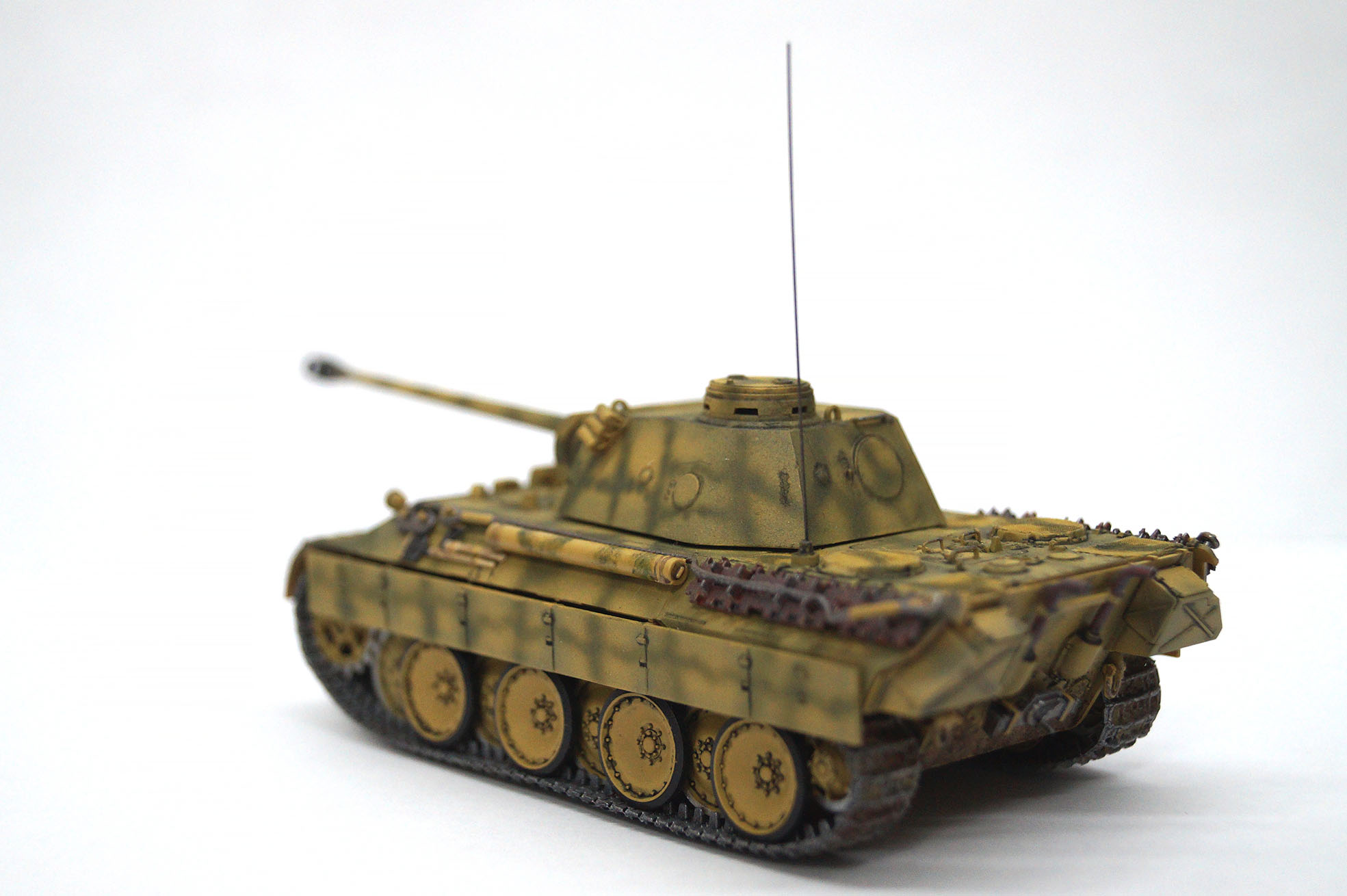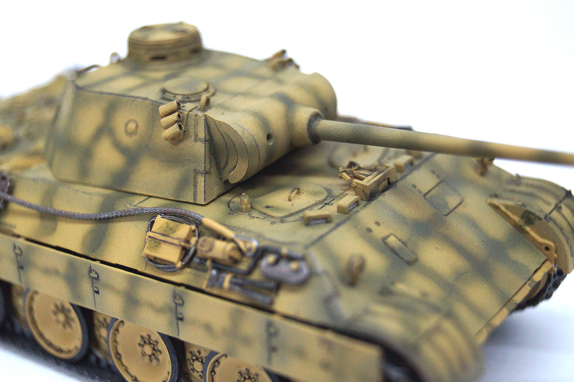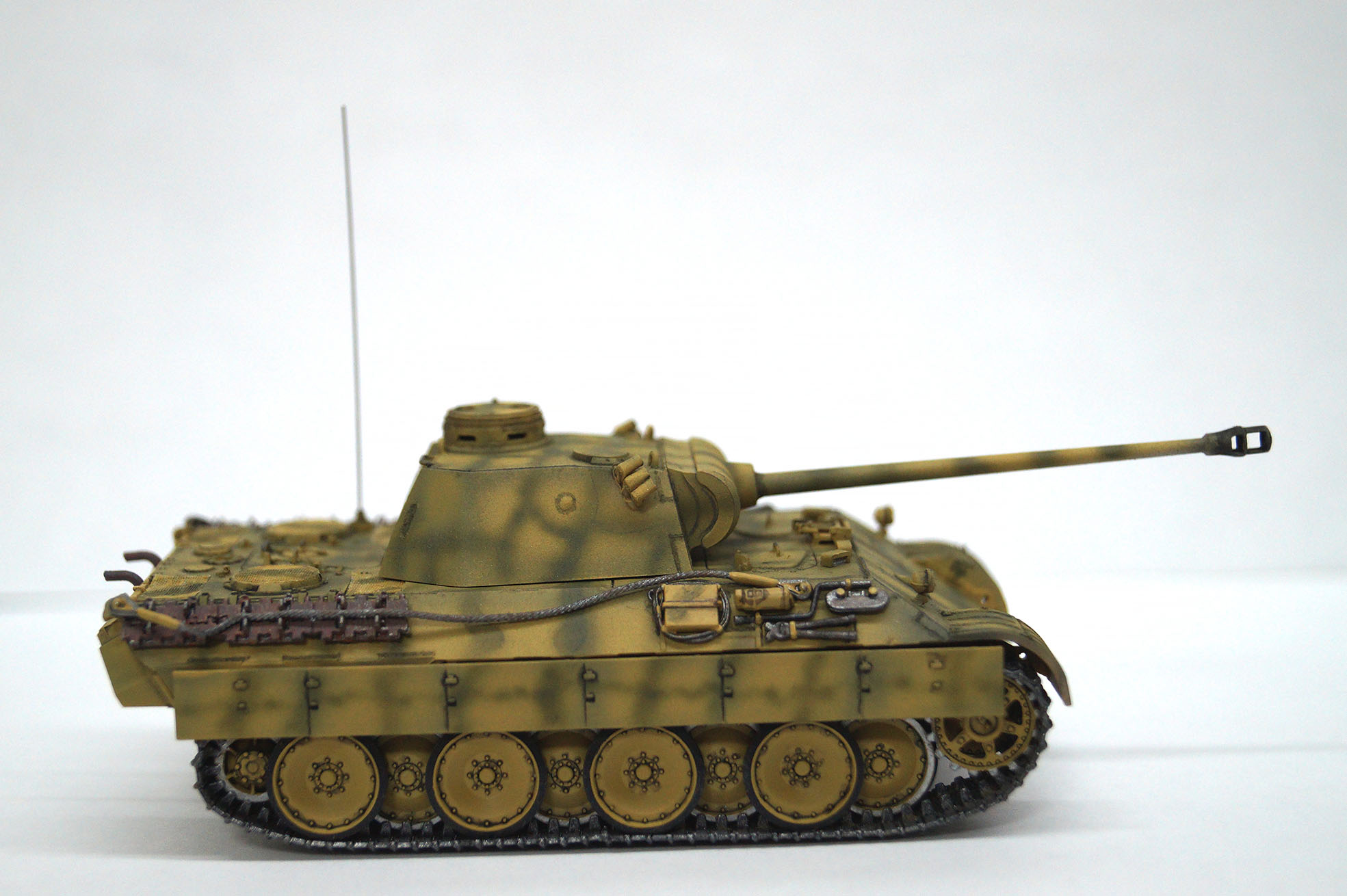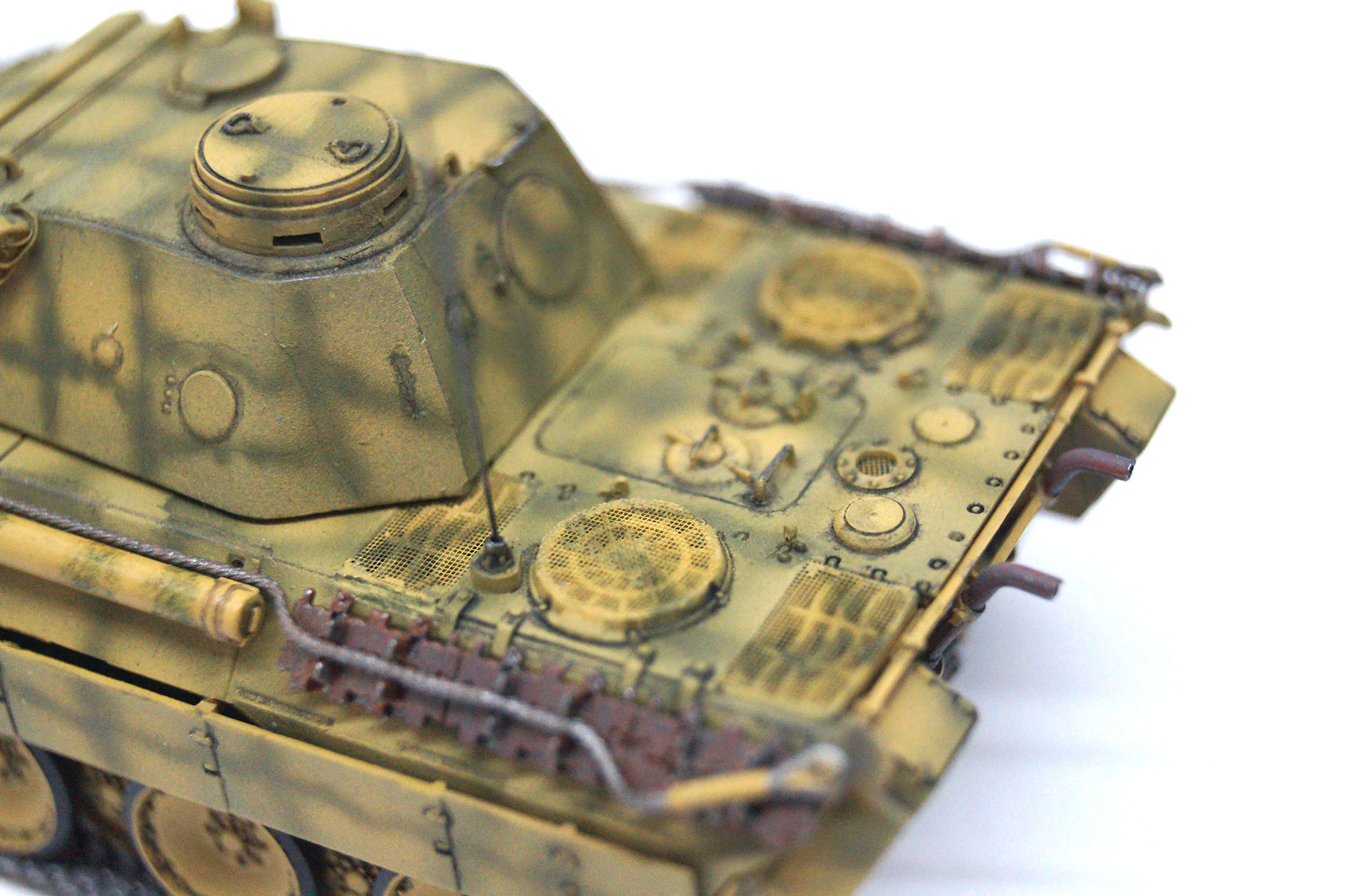 Пантера от Звезды. Моя первая модель на заказ, заказ был таким: увидел у племянника наполовину собранную модель и сказал: "хотите покрашу?". В общем модель мне досталась на половину собранной и без некоторых деталей, даже левая гусеница оказалась не полной. Вот и собрал изкаробку с небольшими доработками, заменил все ручки люков на тонкую проволоку и рассверлил пушку и выхлопные трубы, приклеил травление фирмы Greenfield, модель Earl Grey. Покрасил ганзой, смывку маслом, всё!