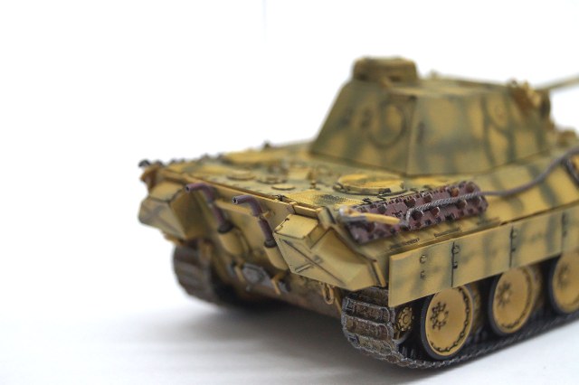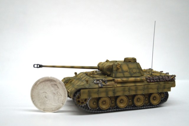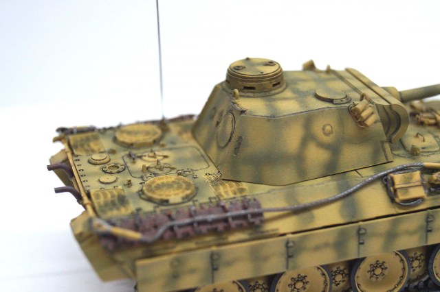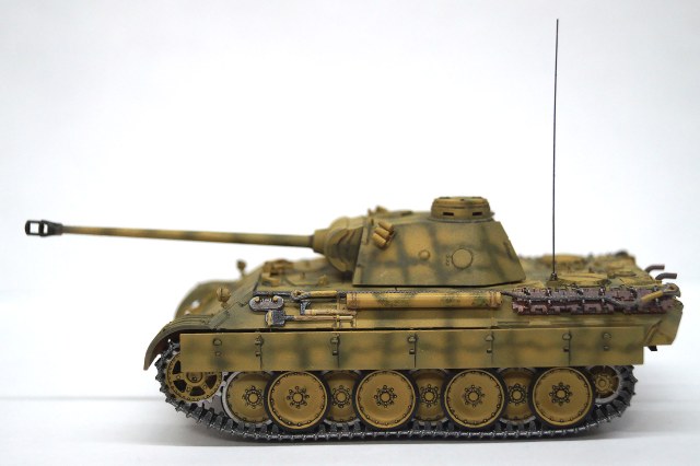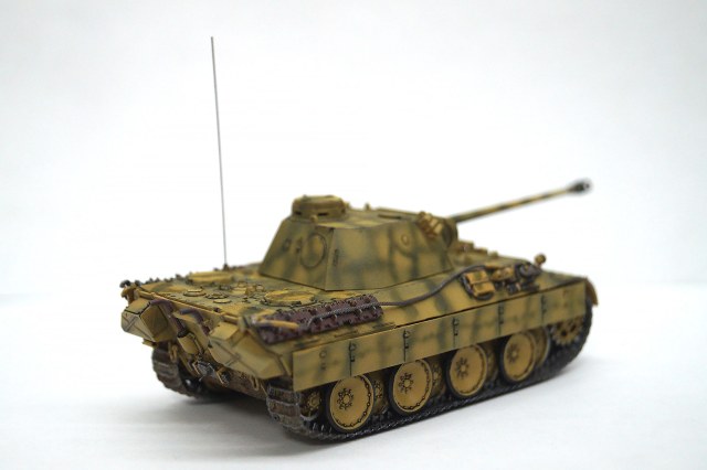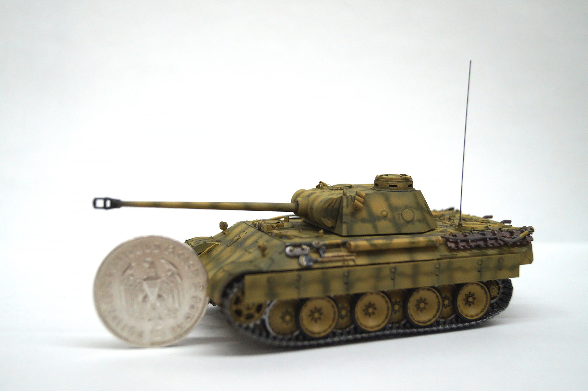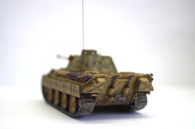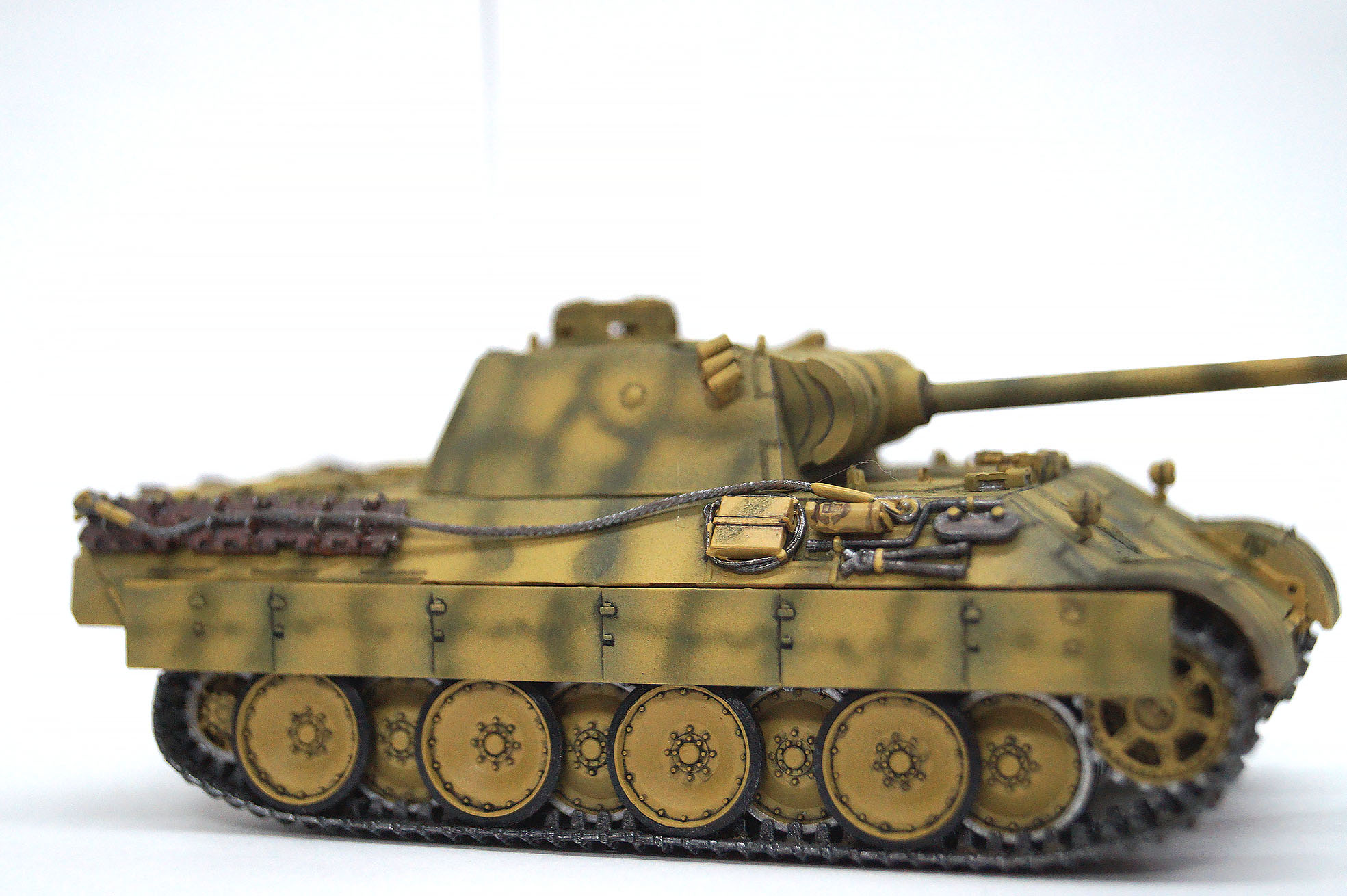 Пантера от Звезды. Моя первая модель на заказ, заказ был таким: увидел у племянника наполовину собранную модель и сказал: "хотите покрашу?". В общем модель мне досталась на половину собранной и без некоторых деталей, даже левая гусеница оказалась не полной. Вот и собрал изкаробку с небольшими доработками, заменил все ручки люков на тонкую проволоку и рассверлил пушку и выхлопные трубы, приклеил травление фирмы Greenfield, модель Earl Grey. Покрасил ганзой, смывку маслом, всё!