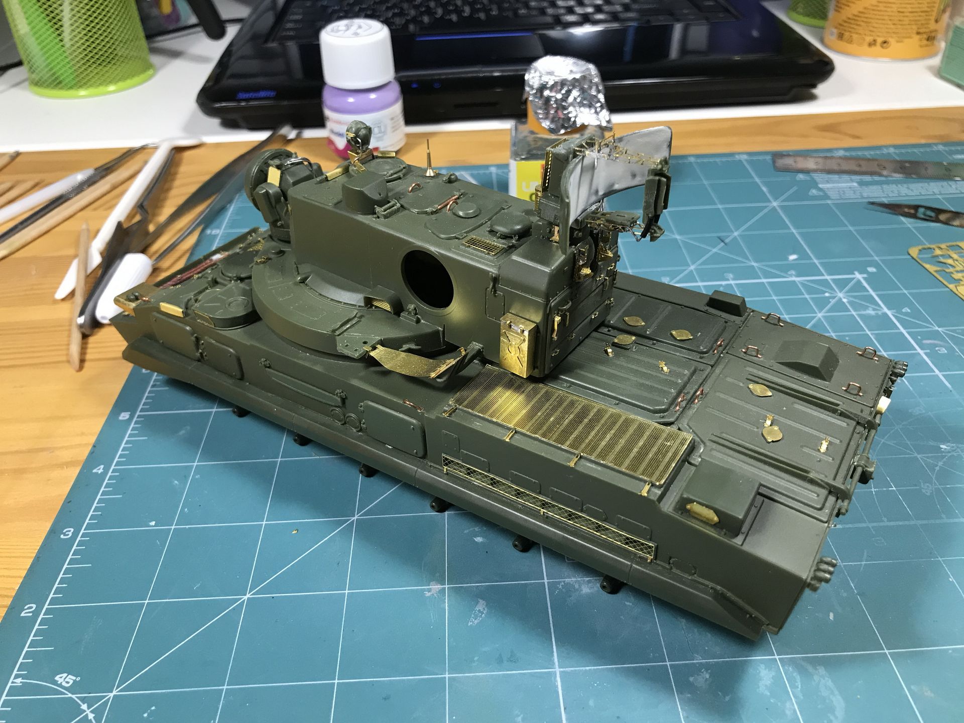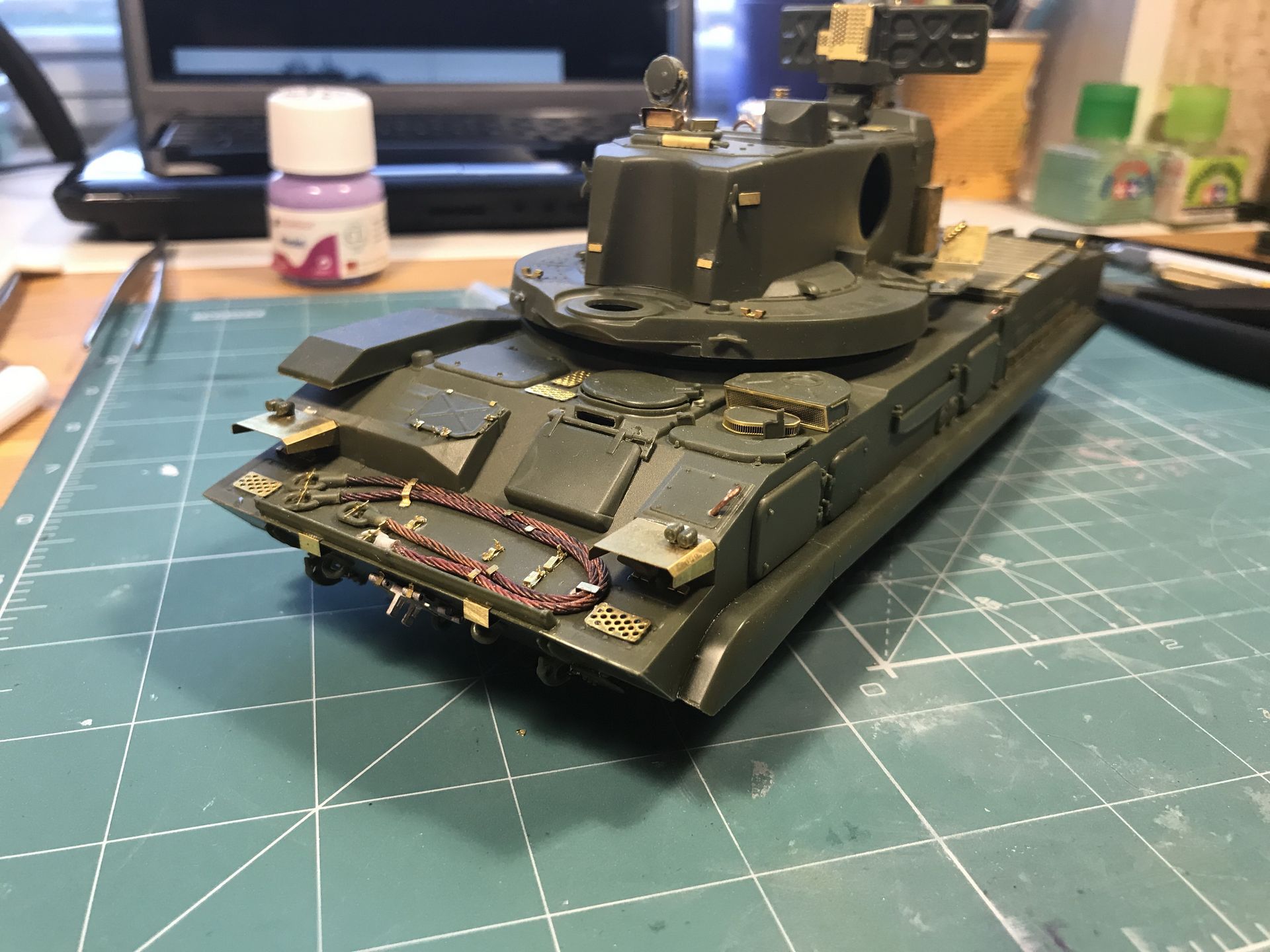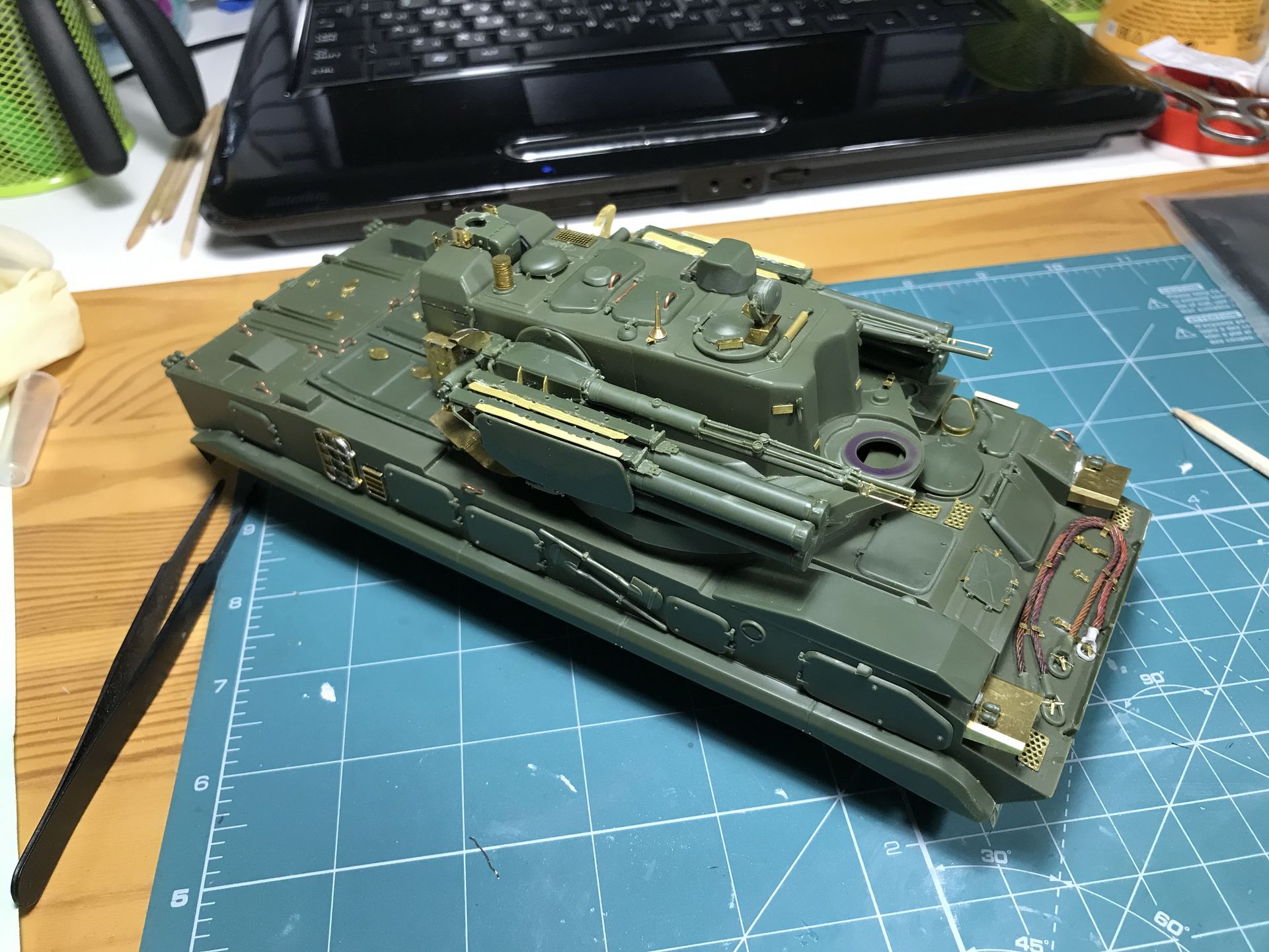 Из дополнительного сделано: проводка к радару обнаружения и целеуказателю, подножка впереди из троса, а так же большой объем фототравления. Мат.часть по картинкам из интернета. Окрашена красками Hobby color H309, сделана цветовая модуляция и разные эффекты масляными красками, и разной химией. Сильно пачкать не стал.