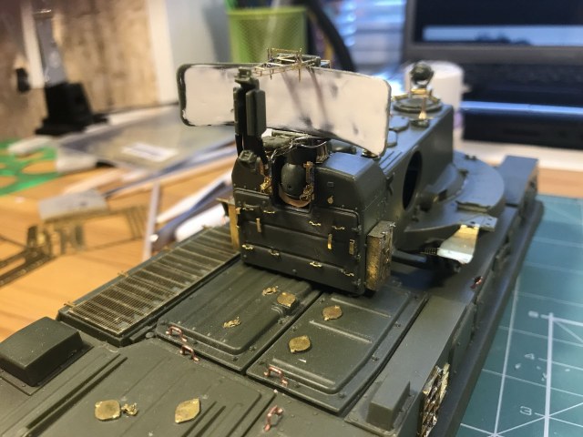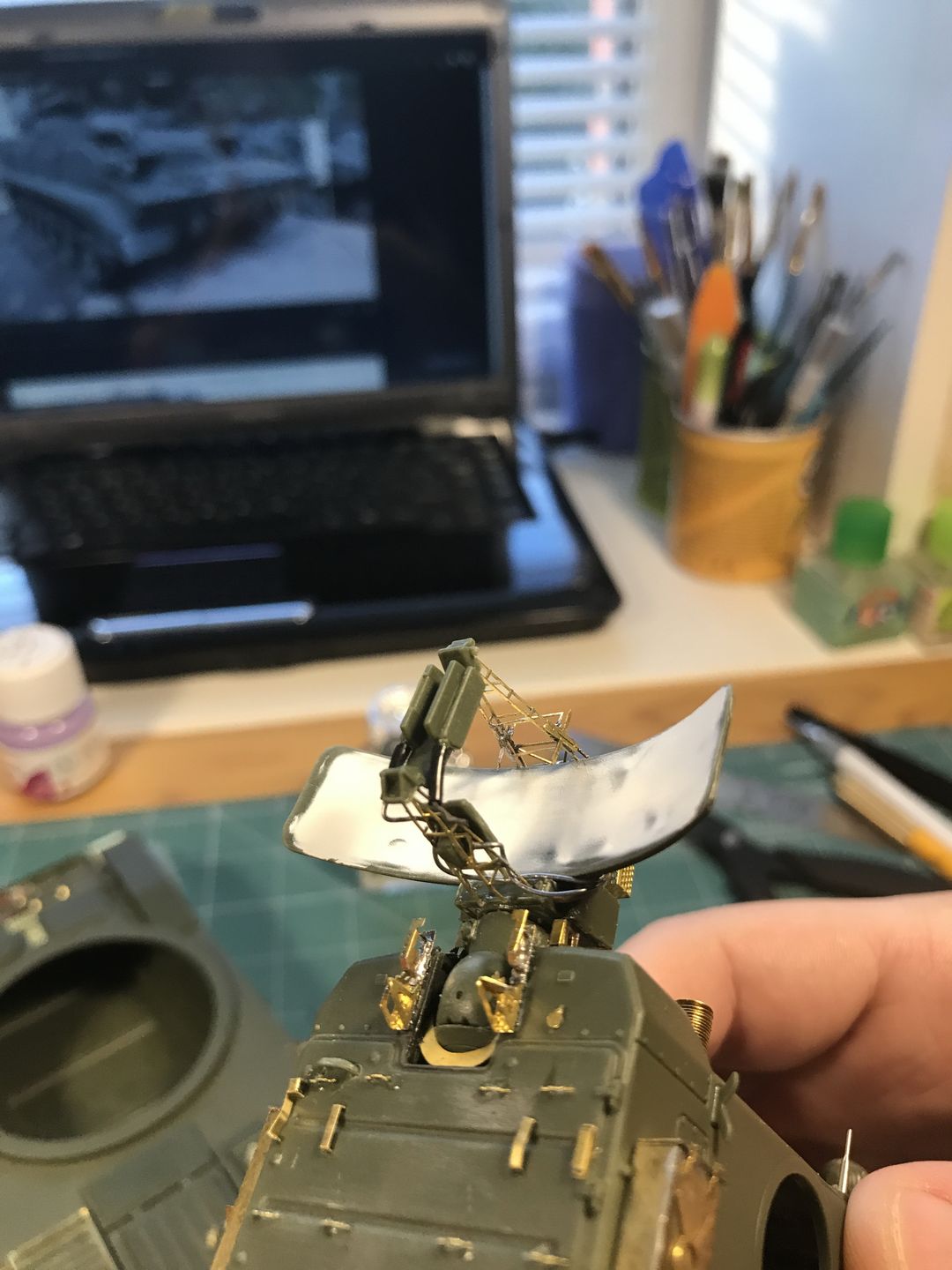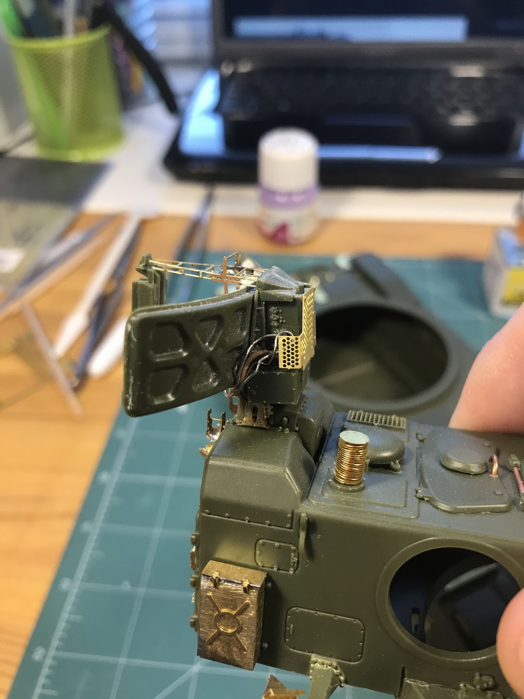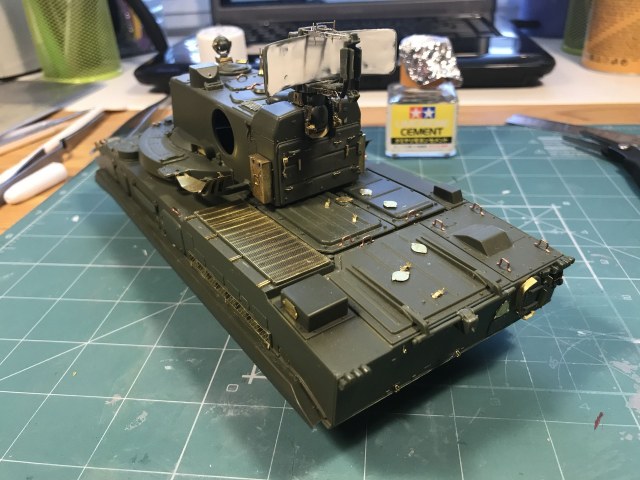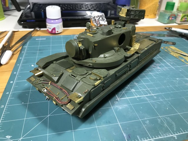 Из дополнительного сделано: проводка к радару обнаружения и целеуказателю, подножка впереди из троса, а так же большой объем фототравления. Мат.часть по картинкам из интернета. Окрашена красками Hobby color H309, сделана цветовая модуляция и разные эффекты масляными красками, и разной химией. Сильно пачкать не стал.
