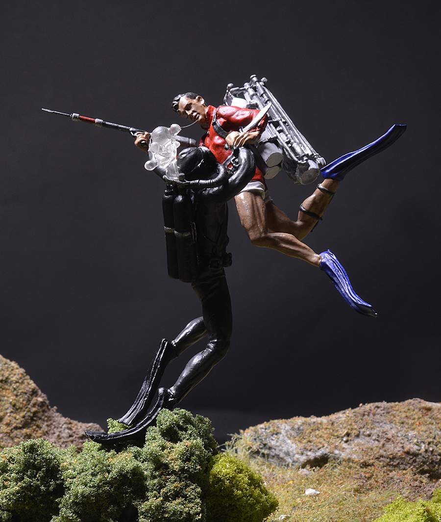 Фигурки сделаны из смолы и отличного качества, с превосходной стыкуемостью. Замена только гарпуна на подводном ружье Коннери. Из смолы гарпун очень тонкий и кривой. Заменён на пруток из латуни.