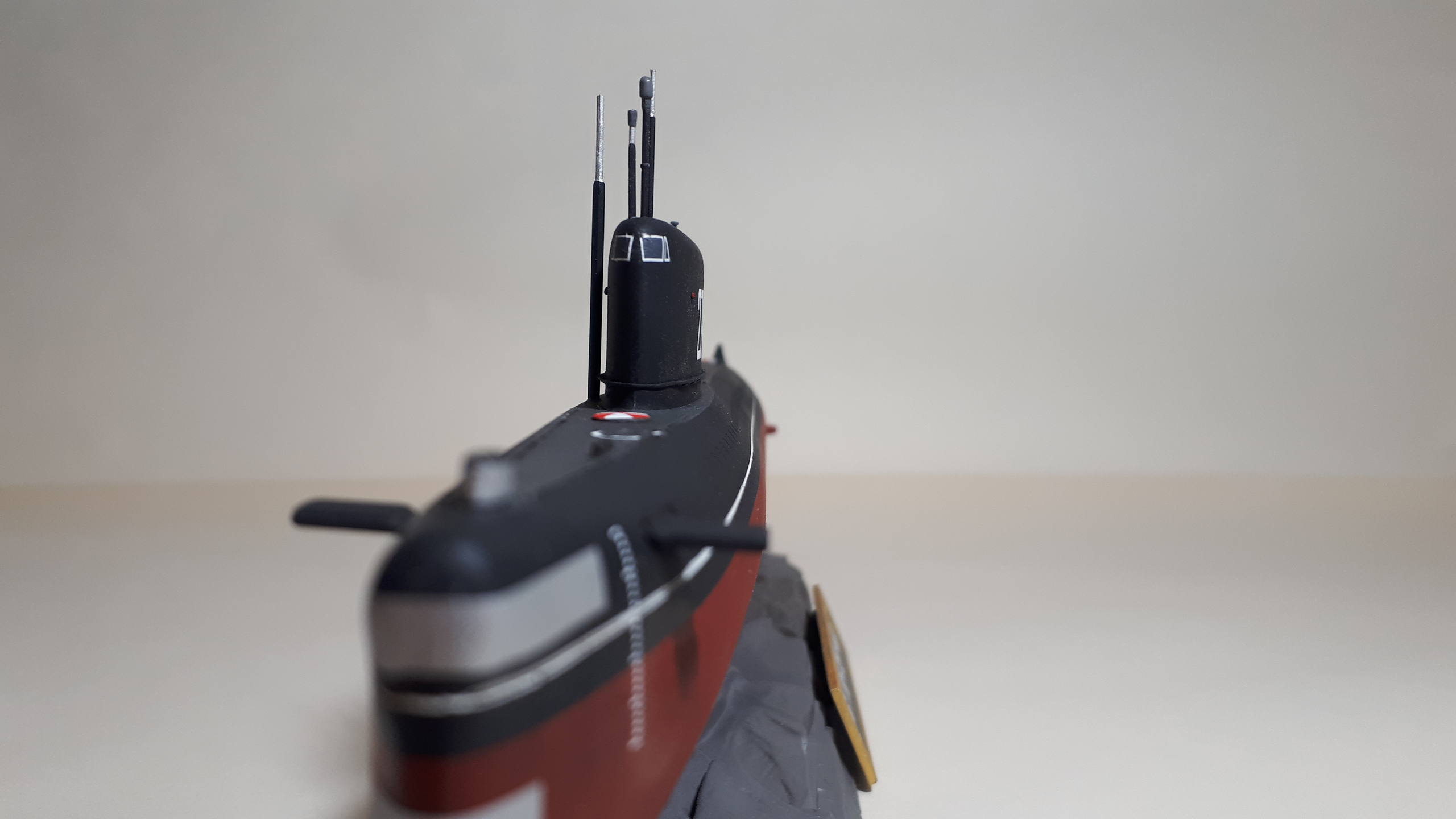 Да уж, не везёт нашим "учкудукам" от производителей. Я вот уже два месяца мучаю её "ближайшего родственника" пр. 629 от ARK, матчасть и литьё кошмарные. По Вашей работе: даже на "искаропке" не игнорируйте сигнально-отличительные огни. Обязательно определитесь, в каком положении лодка на данный момент - у Вас НГР завалены, а выдвижные и швартовые подняты - похоже что корабль у причала, выдвижные поднимают при проворачивании машин и механизмов. Тогда - где флаг и гюйс? И ещё: хоть и оговорено Вами, что сборка из коробки - модель очень оживил бы прорезанный сигнальный мостик и его ветроотбойник.