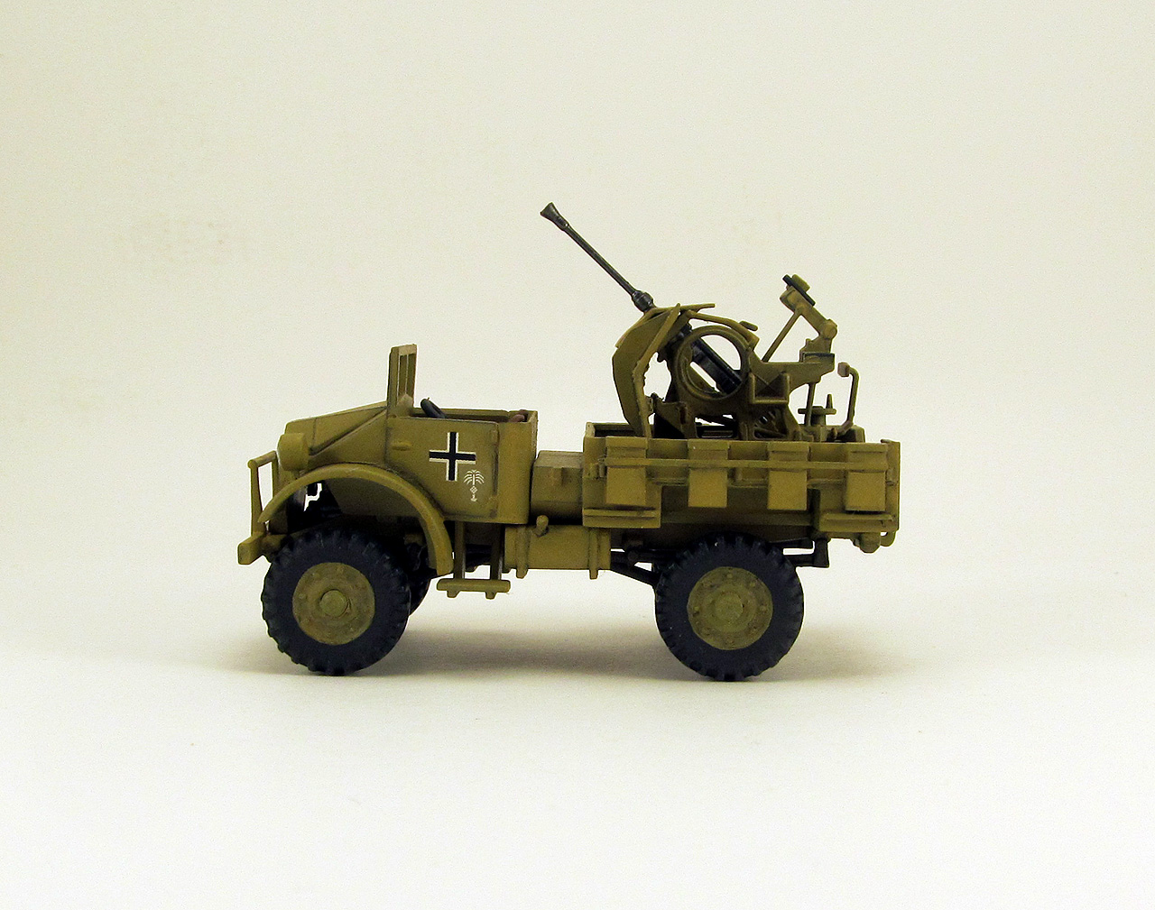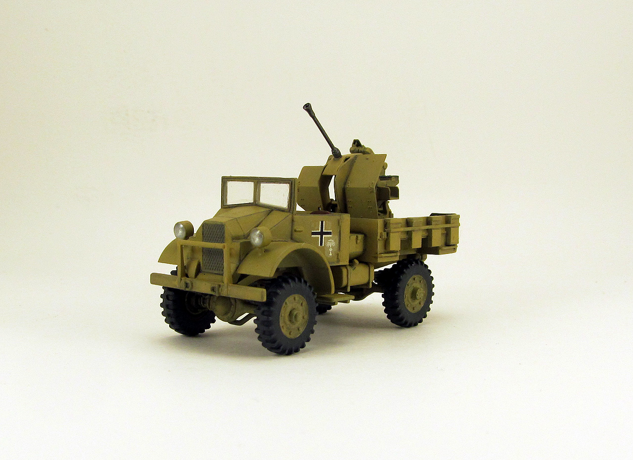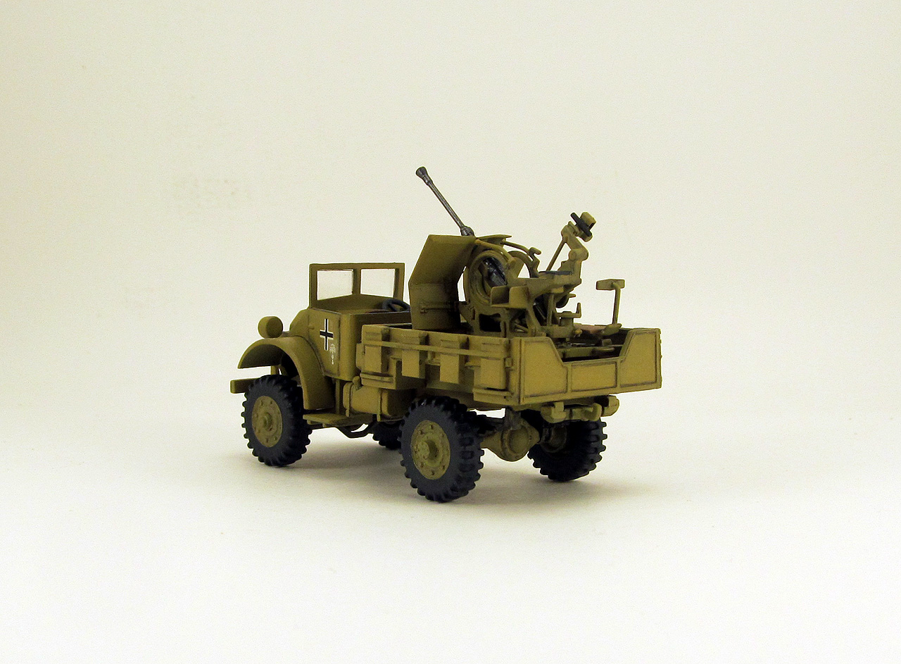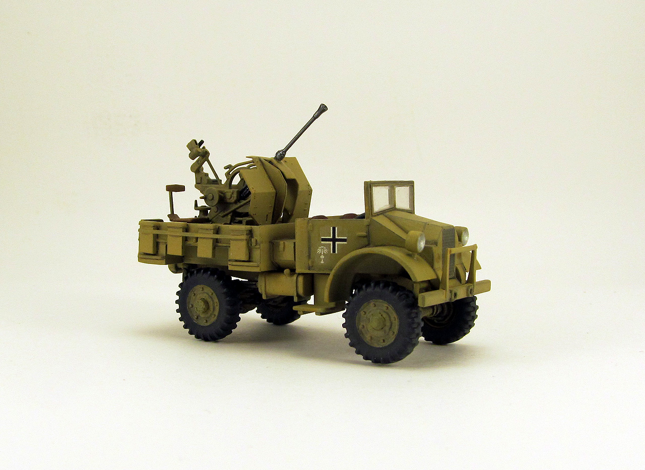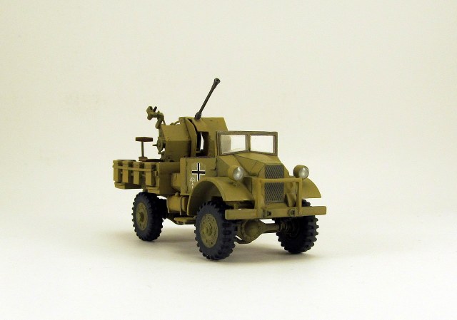 Накануне Нового года удалось мне наконец то собрать подарочек от Дедушки Мороза ещё за 2017 год. Ну а эта машинка получилась приятным бонусом от IBG models: в том наборе было две кабины, две рамы и два комплекта колёс. Недостающие детали ходовой я скопировал в герметик и отлил из эпоксидной смолы (использовал их в модели Light Reconaissance Car “Otter”, которую собрал чуть раньше). Фото прототипа нашёл в сети, когда собирал информацию по семейству СМР. Кузов пришлось делать с нуля из листового пластика, размерами поделился коллега RIBмастер. Зенитка flak38 от "Звезды". Красил кистью, звездовским же акрилом, честно попытался применить фильтр и смывку..., ну не знаю, вроде как что-то как-то получилось. Кресты и эмблемы DAK от ICMовского Sd.kfz 222, очень удачно подошли по размеру.