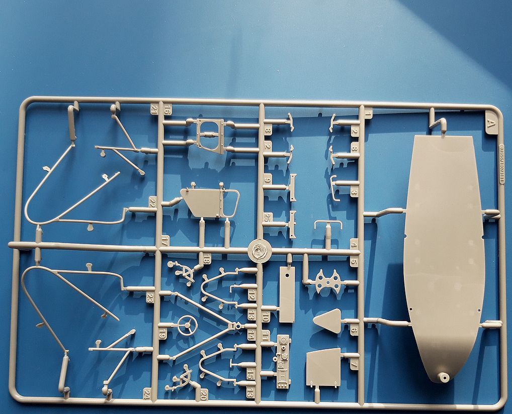 В наборе присутствует небольшой интерьер приборная панель, руль, сиденья топливный бак с горловиной.
