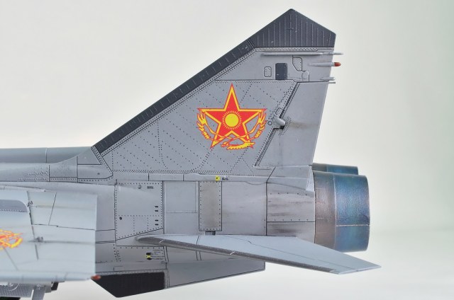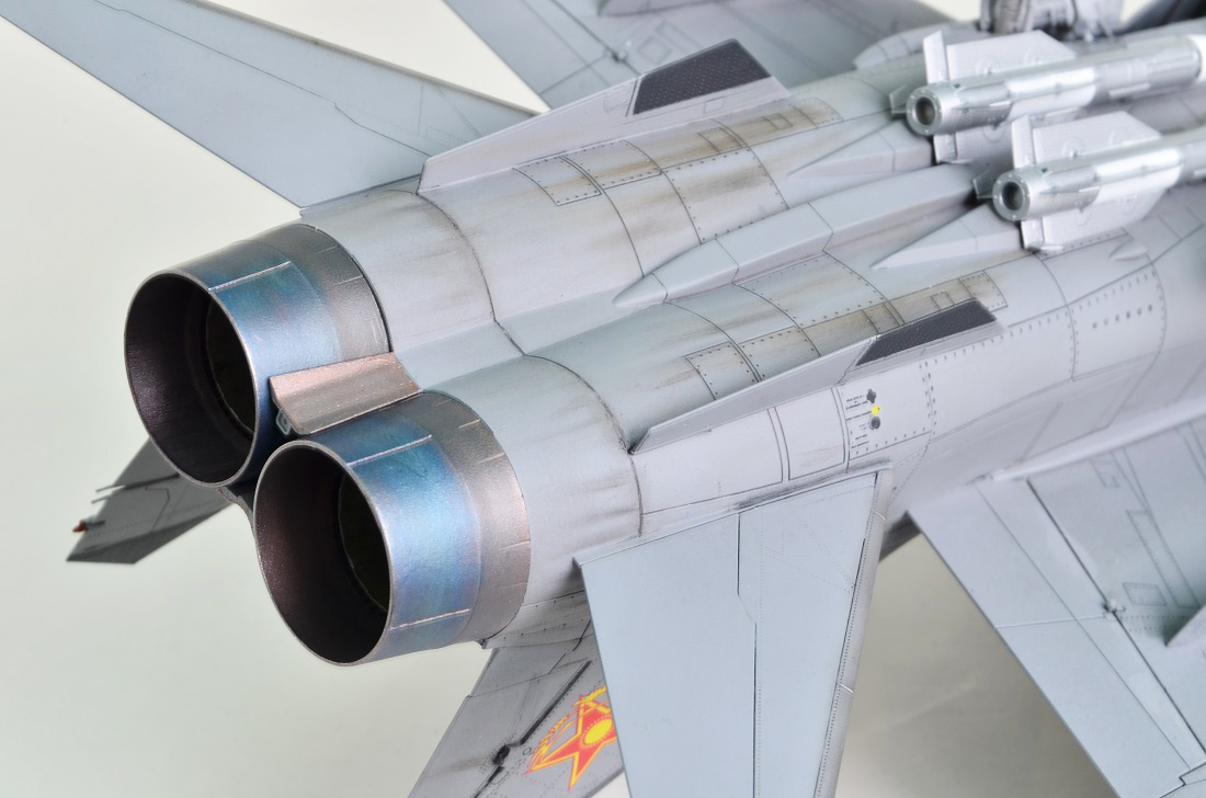 Окрашена модель нитро-краской ,разводил сам на глаз руководствуясь фотографиями из интернета, диски колес шасси Акан зеленый (выцветший ), шины звезда (черный), Сопла металлики Mr.Color затем тамиевские пудреницы. Радиопразрачные поверхности обтекателей темно серый нитра .