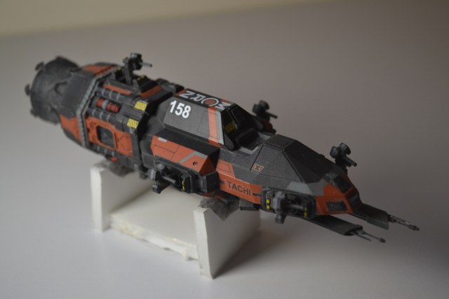 Представляю вам модель космического фрегата Tachi из книги/сериала Пространство (Expanse), большим фанатом которых являюсь. Прежде чем стать кораблём главных героев, фрегат состоял во флоте Марсианской Конгрессионной Республики, именно в их расцветке я и захотел его сделать. По книге, корабль имел двигатель Эпштейна, 2 торпедных аппарата, 6 пушек точечной обороны в скрытых нишах (на модели выпущены). Рассчитан на экипаж 20 человек, длина 46м.