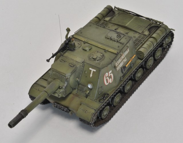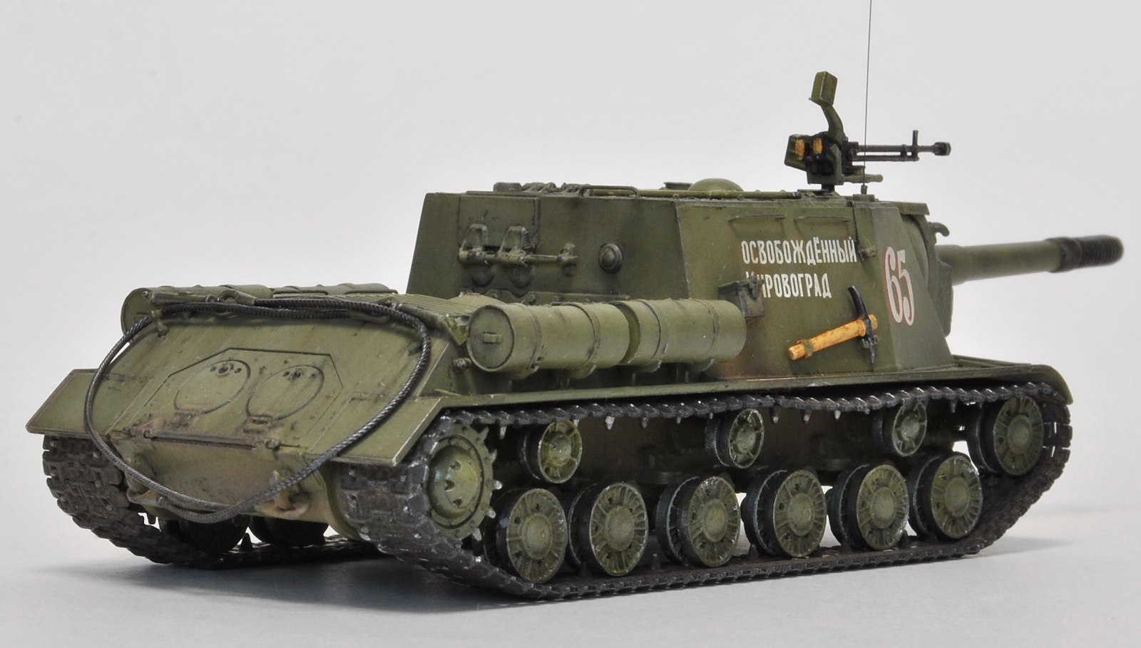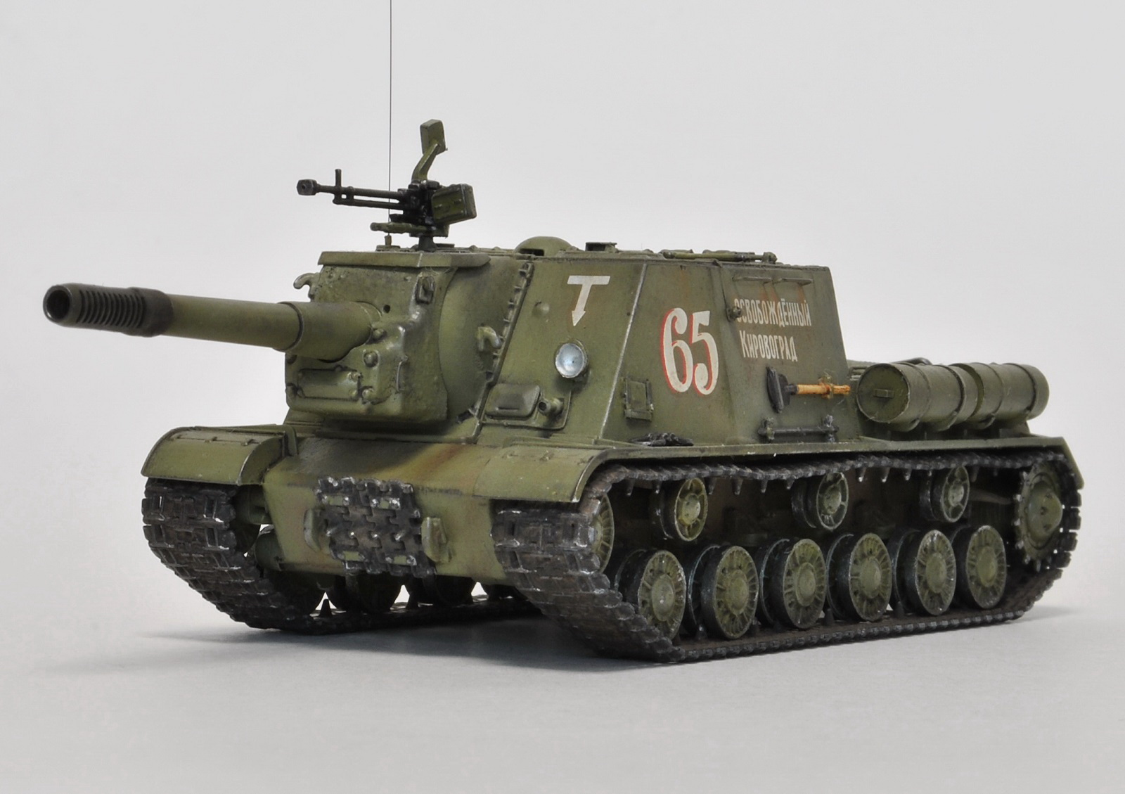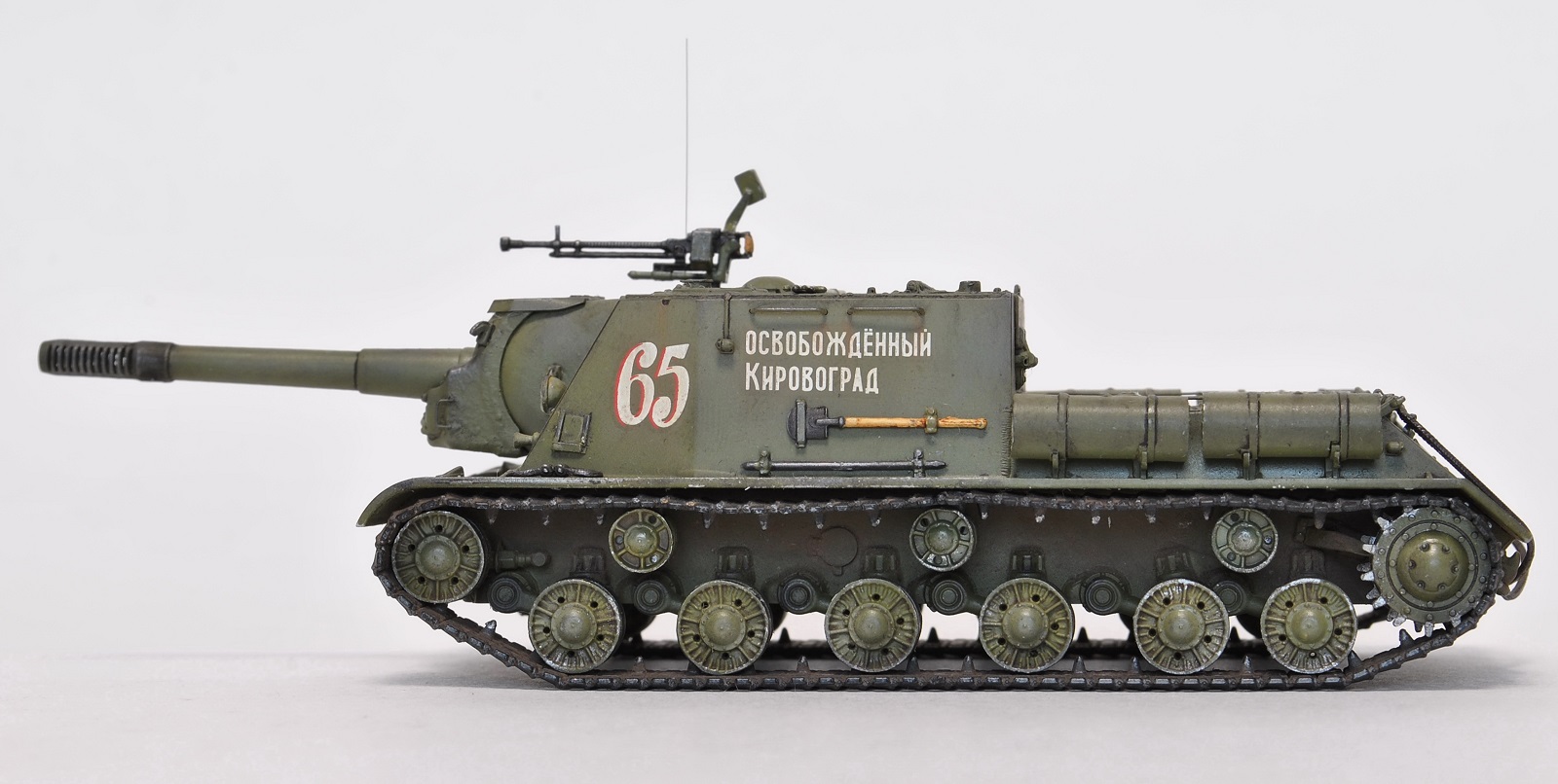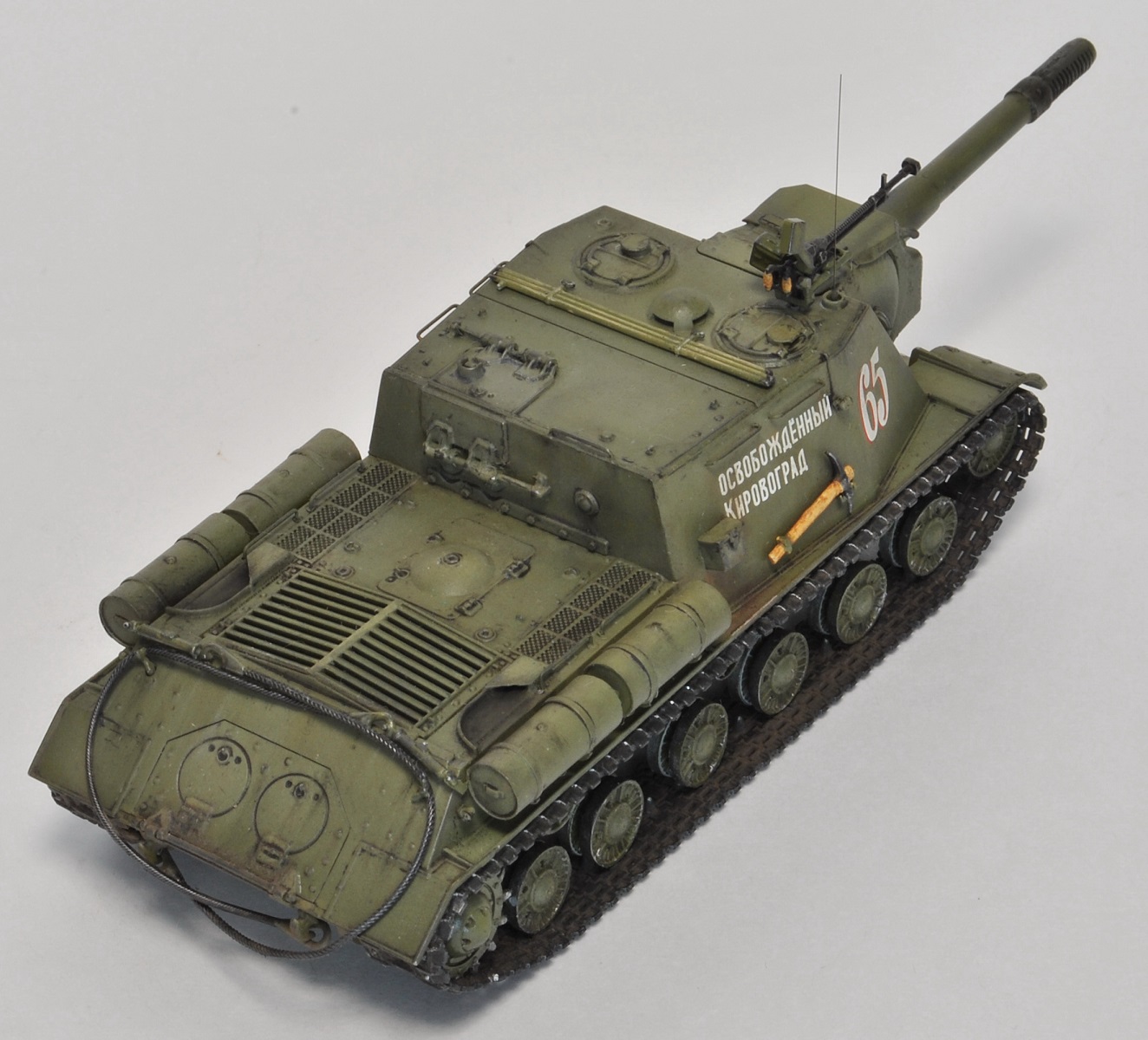 Декаль хорошего качества и соответствует прототипу (фото прилагаю), но предлагаемую надпись на ствол «вперед на разгром врага» наносить не стал, так как на фото прототипа она отсутствует (и вообще принадлежит ИСУ-122). Тем не менее, есть фото М. Барятинского (см. обложку Бронеколлекции 2/2006), где на музейной машине вот это фсе в наличии – и надпись на стволе, и послевоенные катки (совпадение?...(с))…