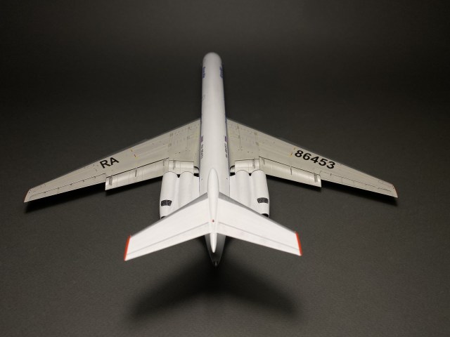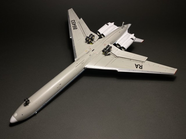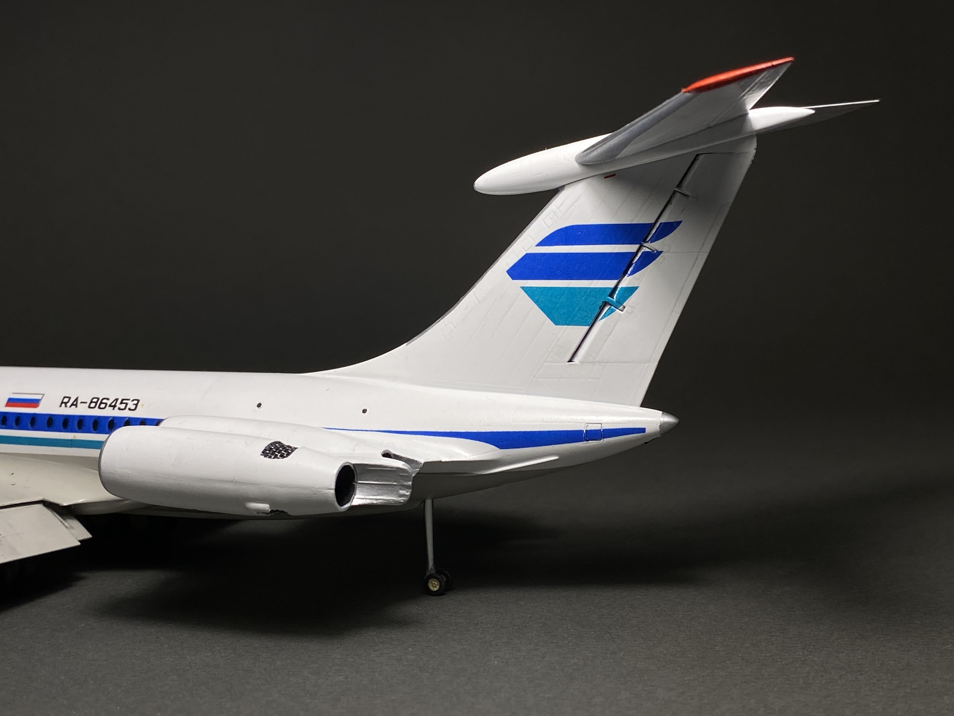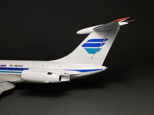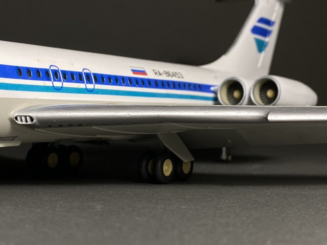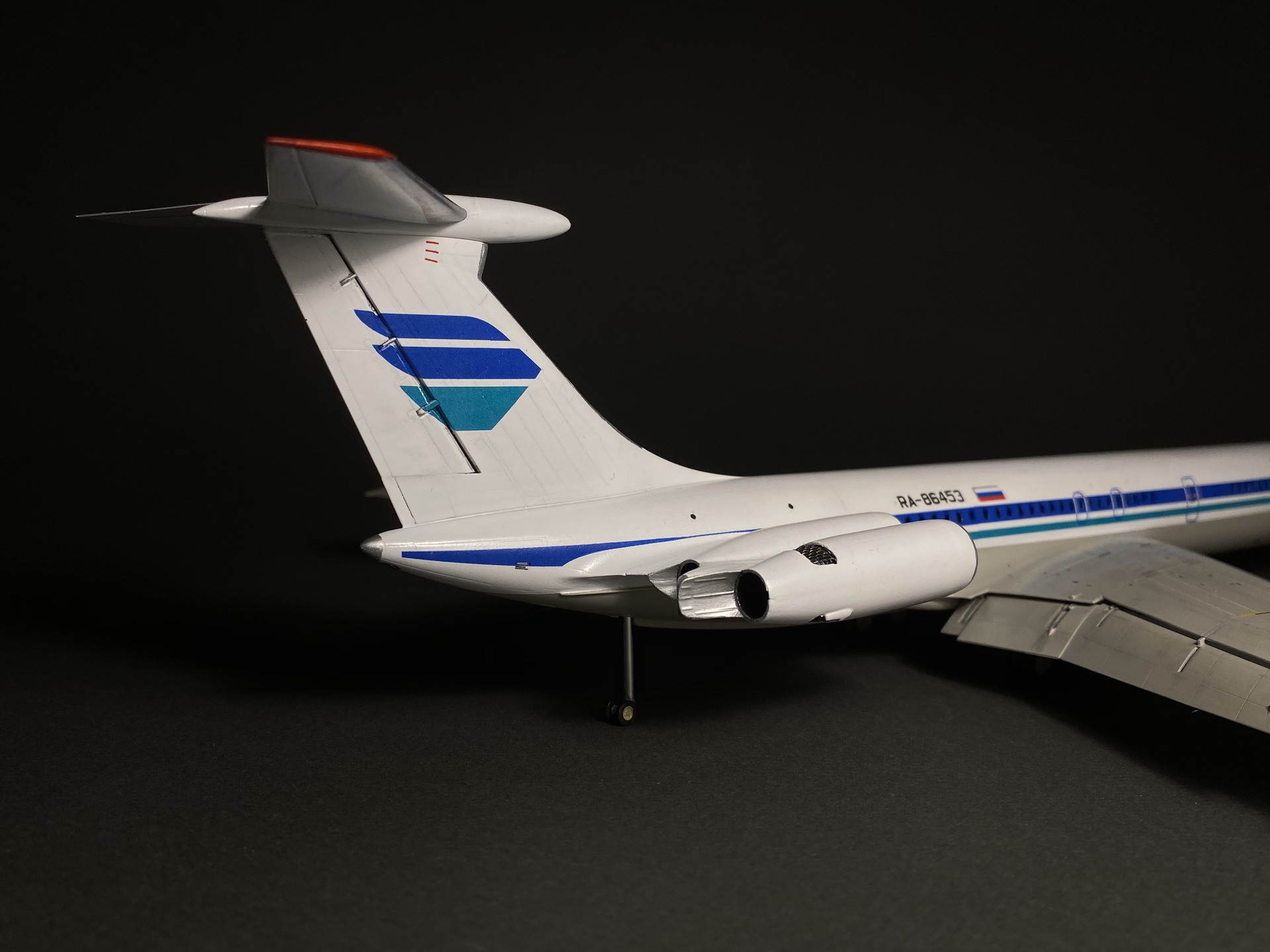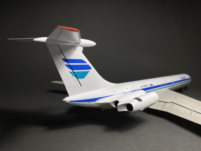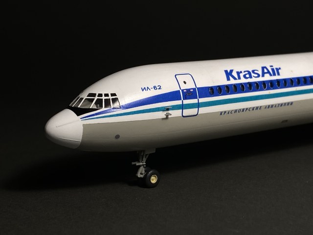 Не разделяю мнения админа, мне модель очень приглянулась. Аккуратная сборка, хорошо подобранные цвета. Правда смысла делать кабину не вижу, так как за остеклением ее было бы видно лишь при наличии подсветки изнутри и то совсем чуть-чуть. Сам собирал как-то давно на заказ 62й, но в ливрее СССР. Кстати, движки бы очень оживил набор травления от микродизайн, они вроде делают дополнение к Ил-62. Там и створки шасси есть, и элементы двигателей, и прочие мелочи.