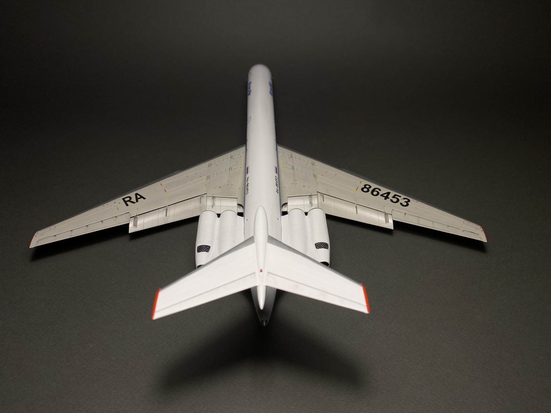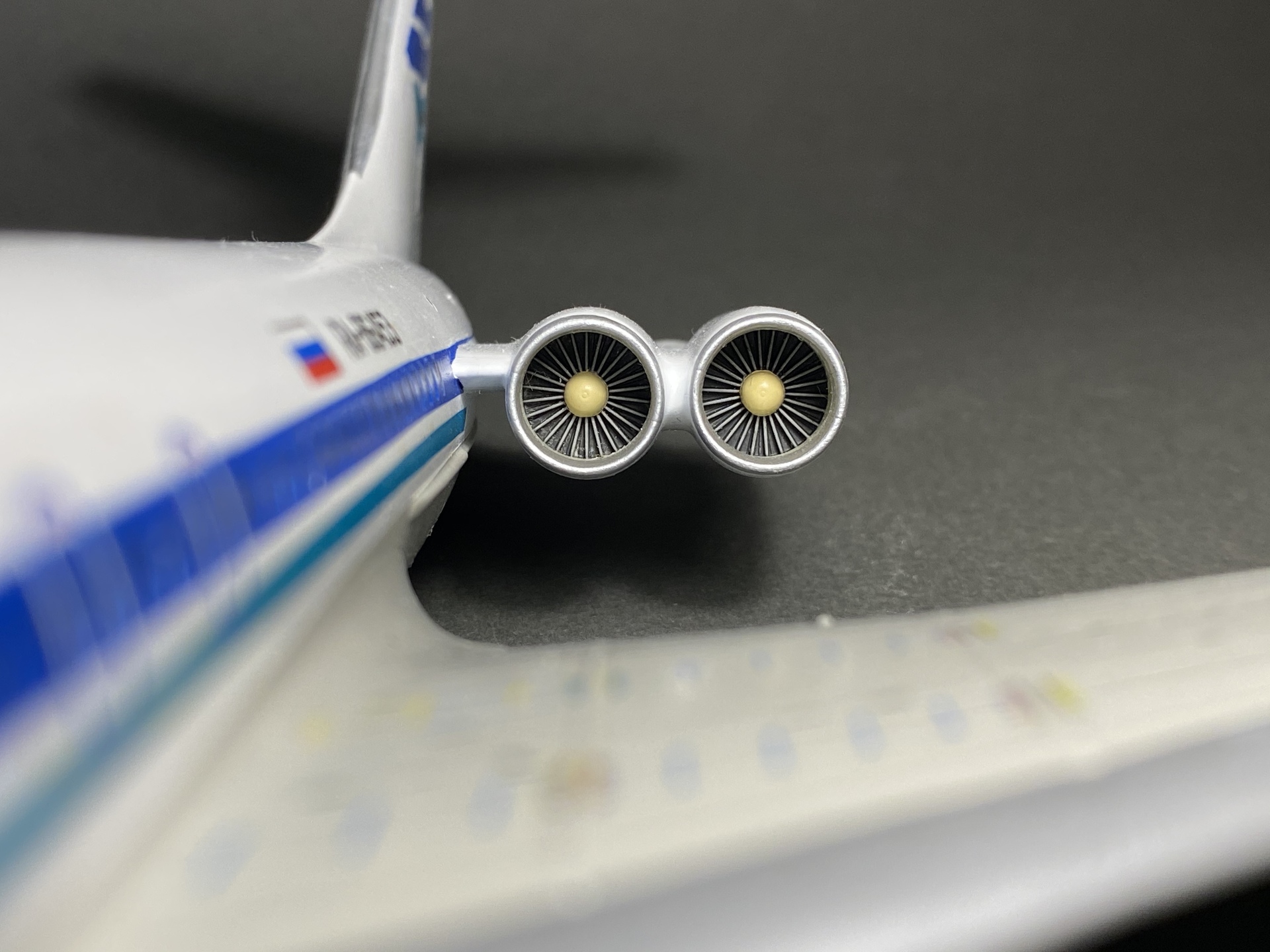 Если честно, то именно движки смотрятся совсем не в кассу и чужеродными из-за отсутствия проработки по крою и тонировке. Сетка реверса совсем немасштабная и лучше её было делать декалью. Границы покраски надо сносить нулёвкой на воде - на модели они слишком выпуклы и даже тени отбрасывают. По правому борту не хватает одного датчика угла атаки. По кромке крыльев нет выделения кроя, что очень характерно для этого типа. Читлайн залез на остекление - это неправильно.