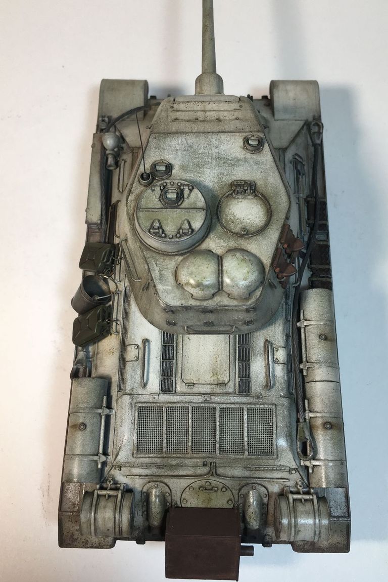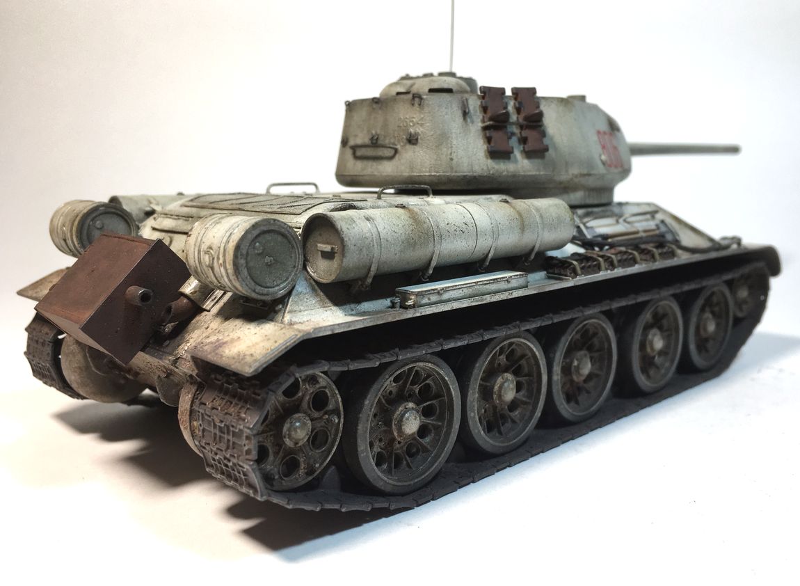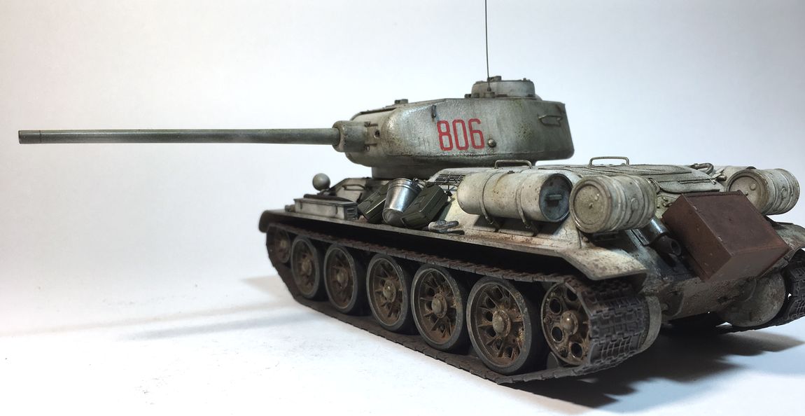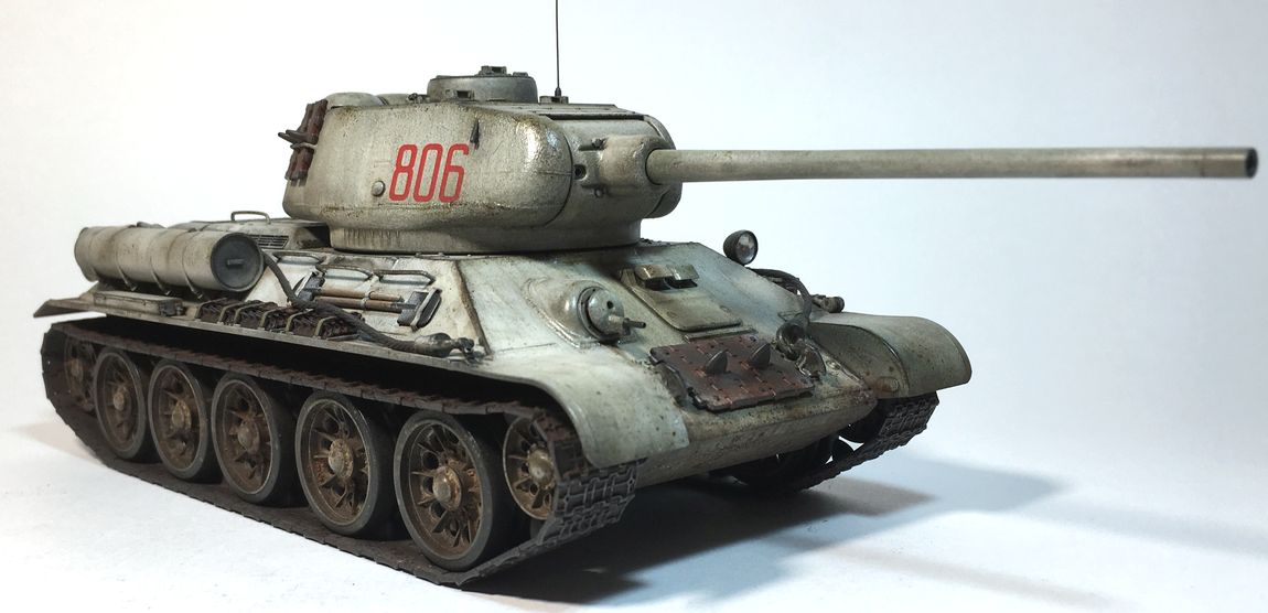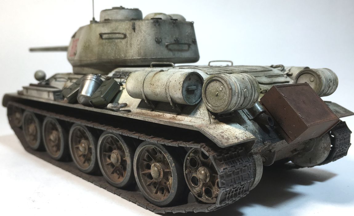 Доброго времени уважаемые моделисты.Хочу представить модель танка Т-34 85. Модель от Звезды при сборке проблем не вызвала. Заменил сетку мто на металлическую, тросы,ведро- Микродизайн, канистры от Тамии,из проволоки добавил антенну поручни заменил на проволоку, изменил крепление шанцевого инструмента. Зимний камуфляж делал с помощью известки от Арма моделс. Декали из остатков от набора су 122. Модель никакой исторической привязки не имеет-собирательный образ. При создании погодных эффектов и следов эксплуатации использовал пигменты Зип макет и жидкости Аммо миг. На фото получилось как будто модель глянцевая,но это не так, на финише покрывал матовым лаком.