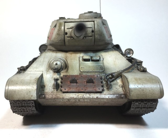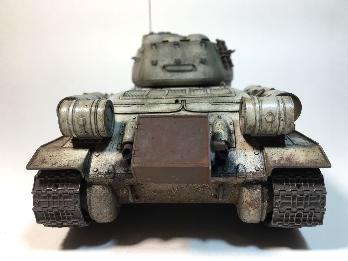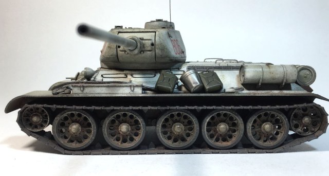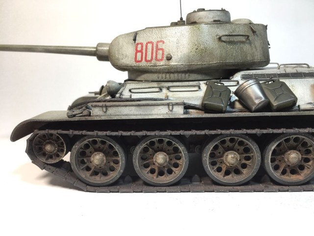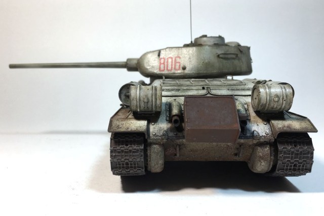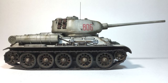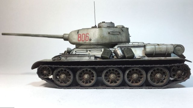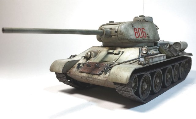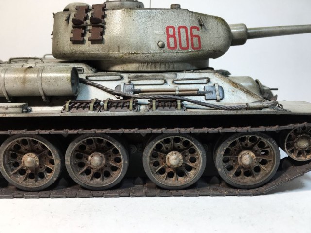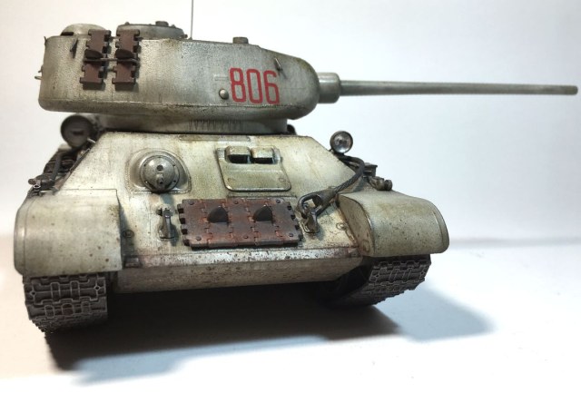 Доброго времени уважаемые моделисты.Хочу представить модель танка Т-34 85. Модель от Звезды при сборке проблем не вызвала. Заменил сетку мто на металлическую, тросы,ведро- Микродизайн, канистры от Тамии,из проволоки добавил антенну поручни заменил на проволоку, изменил крепление шанцевого инструмента. Зимний камуфляж делал с помощью известки от Арма моделс. Декали из остатков от набора су 122. Модель никакой исторической привязки не имеет-собирательный образ. При создании погодных эффектов и следов эксплуатации использовал пигменты Зип макет и жидкости Аммо миг. На фото получилось как будто модель глянцевая,но это не так, на финише покрывал матовым лаком.