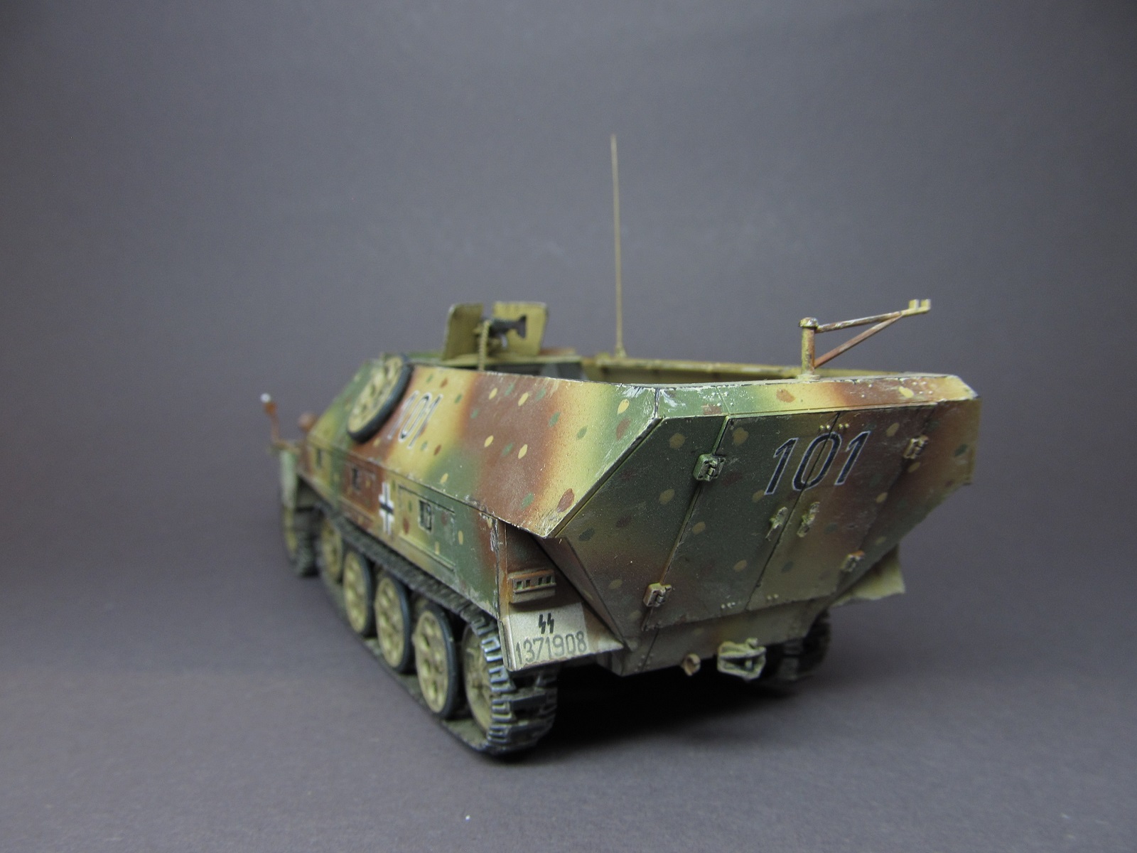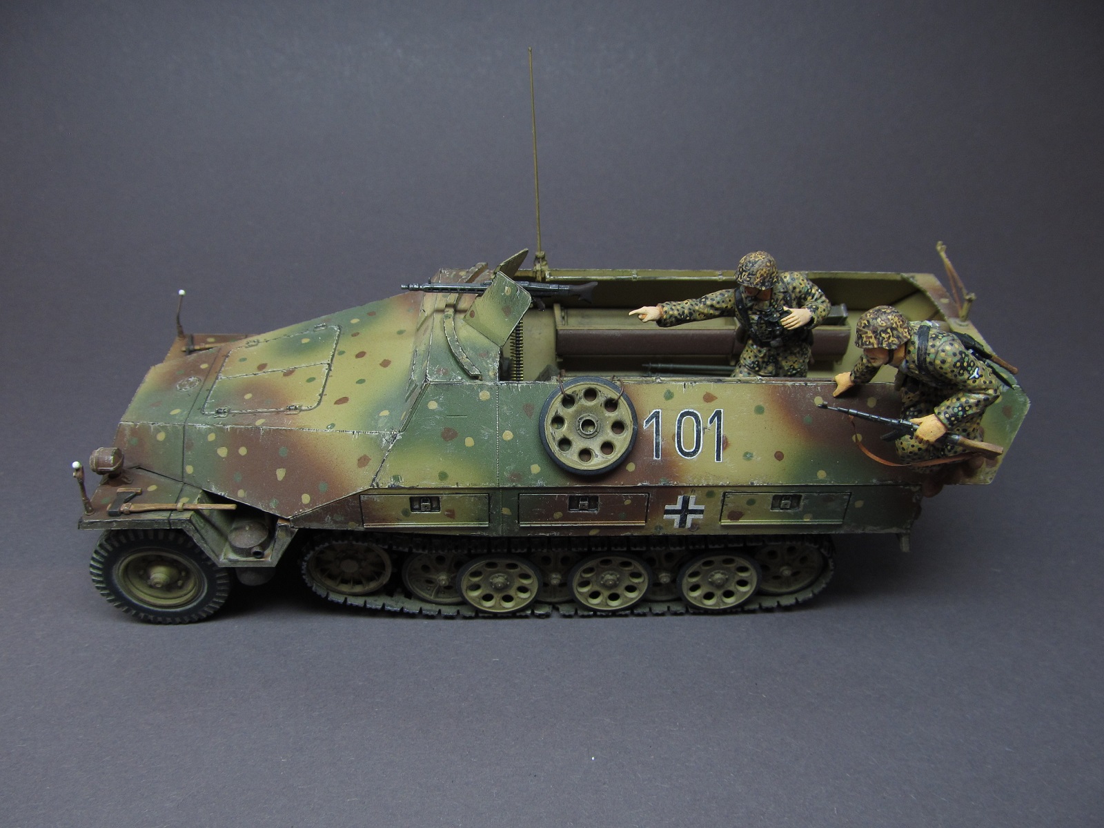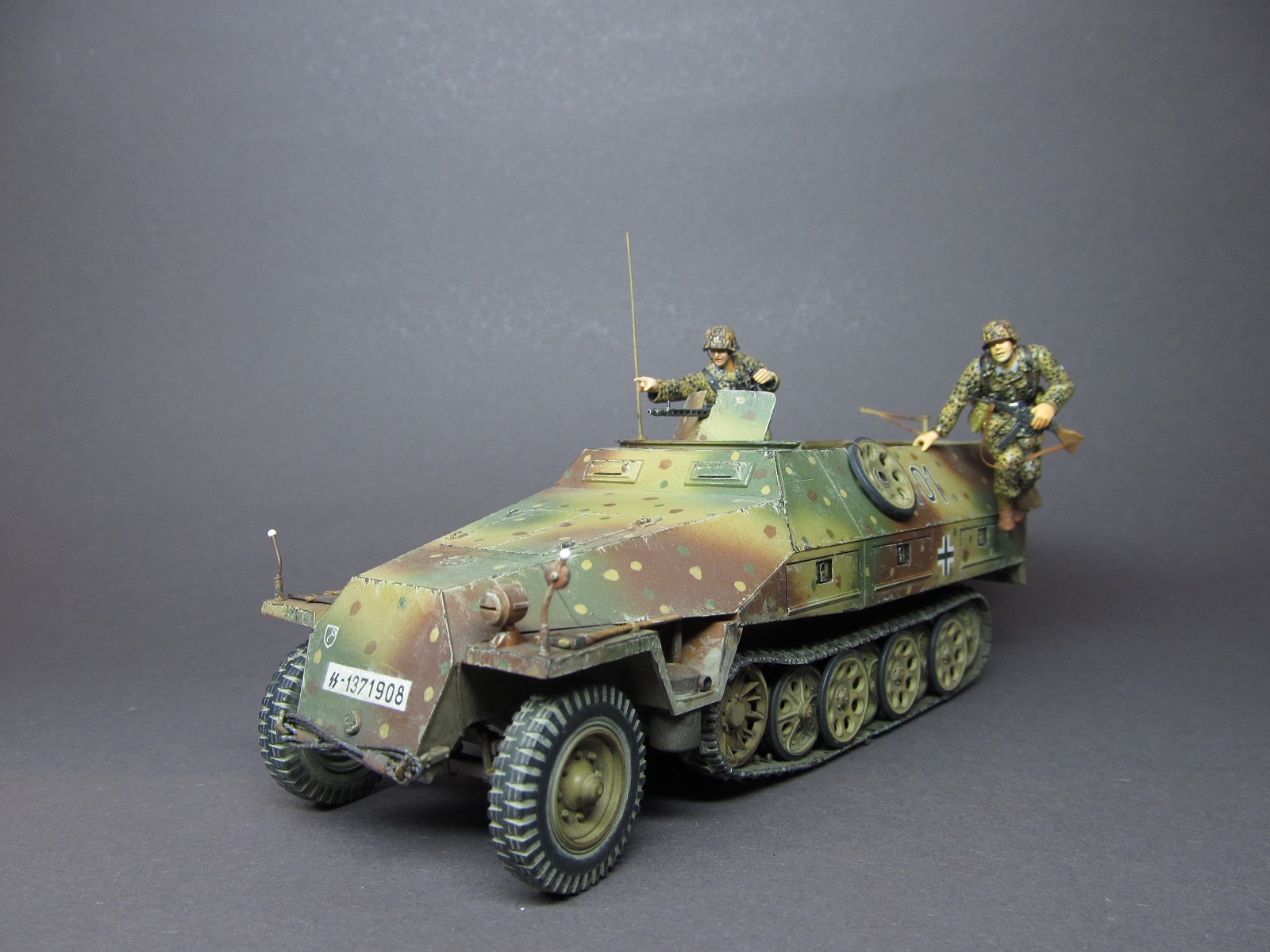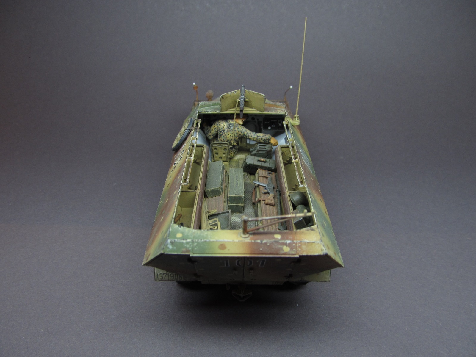 Окрашивал модель акриловыми красками от "Акан" и "Звезды". За основу брал вариант засадного камуфляжа. Знаки-номера- кресты традиционно рисовал кистью. Как обычно и огнетушитель не обойден вниманием)). На проработку камуфляжного обмундирования экипажа времени ушло в пять раз больше, чем на саму машину, но результат меня порадовал)).