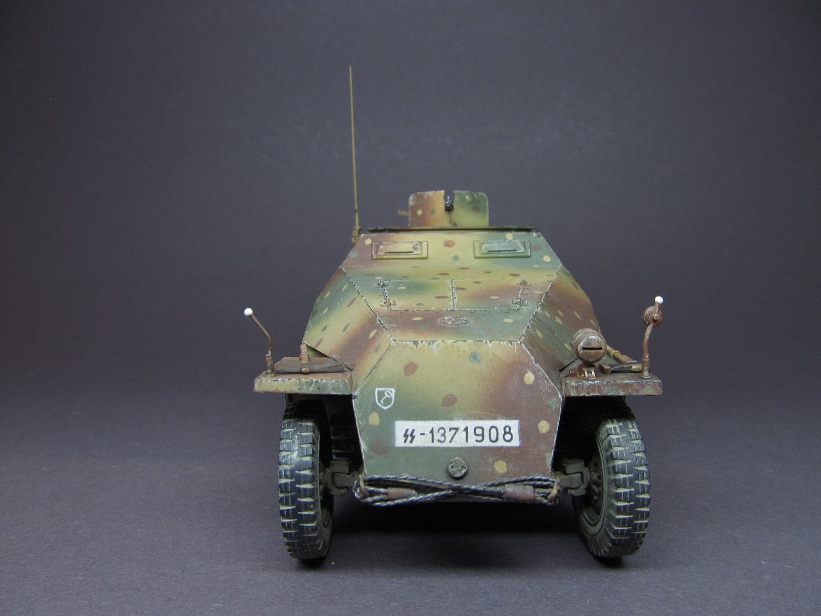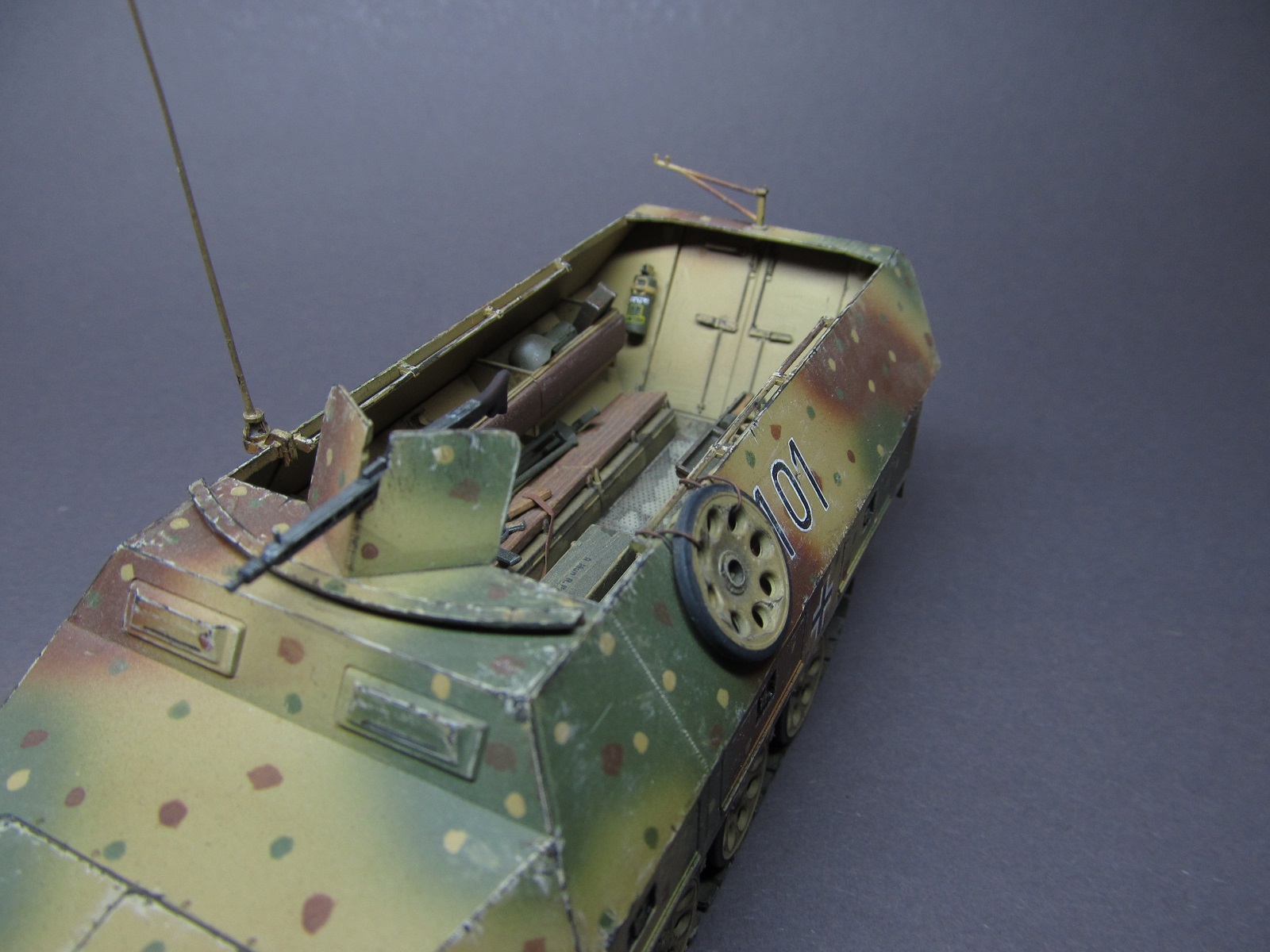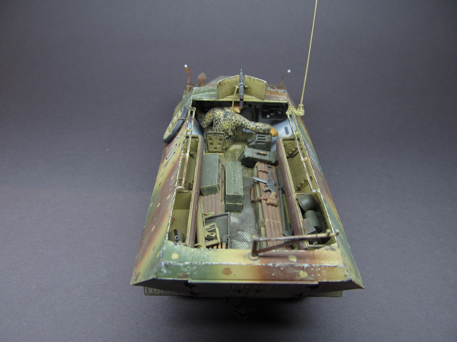 Сбора изкоробочная, с малюсенькими дополнениями от себя: рассверлил выхлопную трубу, стволы пулеметов, доработал ручки открывания дверей десантного отделения, примастырил самодельный трос, добавил проводку к фаре и фидер от радиостанции к антенне(хотя его и не видно вообще)))). За мат. частью не гнался в то время, собирал в кайф))).
