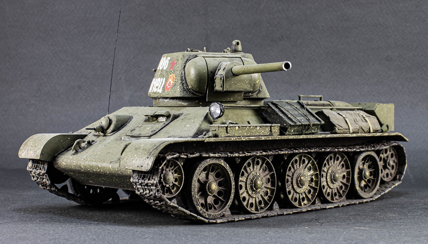 Если бы не модельный баттл, в группе в В Контакте, отложил бы я стройку этой модели на следующий год, По участвовать в баттле стало интересно, соревновательский дух и интрига кто победит. Участники этого баттла конечно моделисты серьезные, применяют много фототравления, смоляные допы, металлические траки, не то что я (собрал из коробки), в моем наборе по умолчанию лежали допы от производителя Model GUN - алюминевый ствол, медный трос, смоляные скатка с ящиками, антенный ввод и антенна. Но из всего этого великолепия я установил только точеный ствол, антенну заменил на струну, торсы поставил свои, металлические, доработал бумагой скатку из набора, накрасил отражатель фары маркером Молотов, ствол пулемета заменил на мед.иглу.