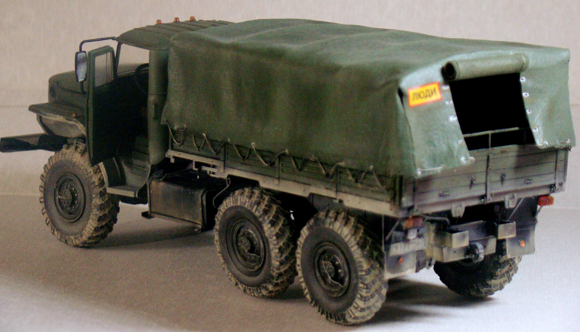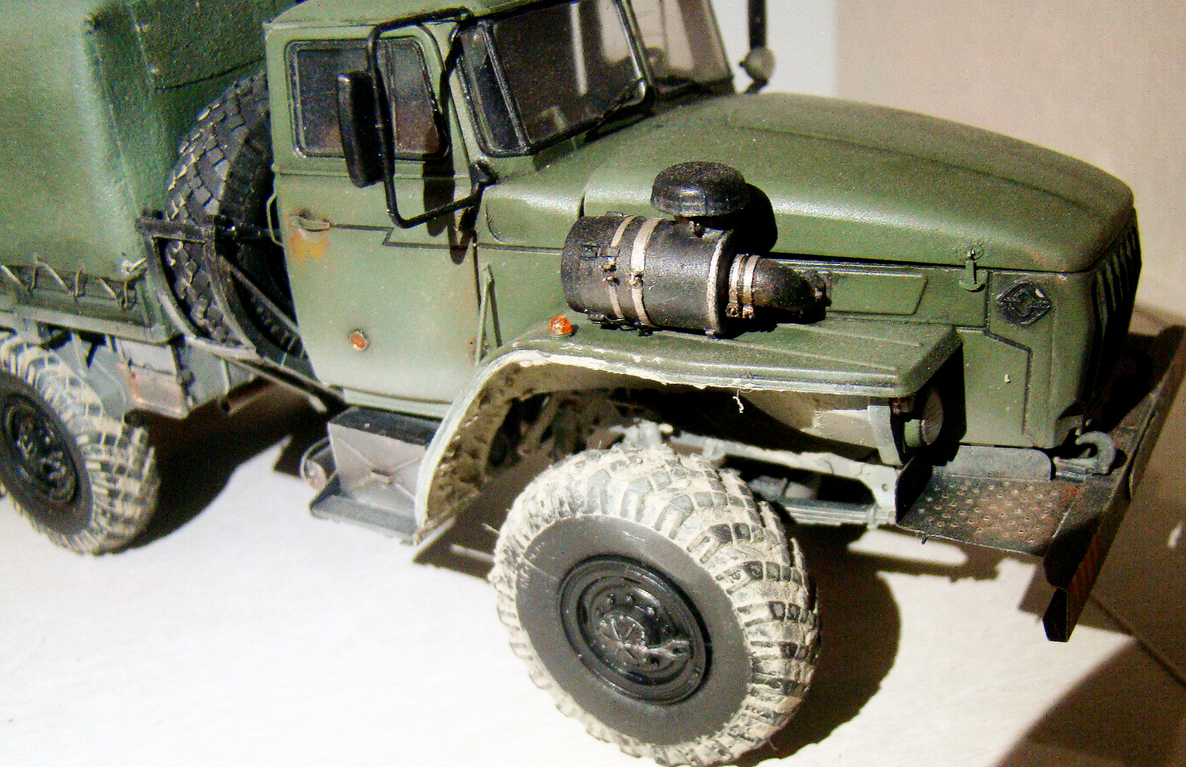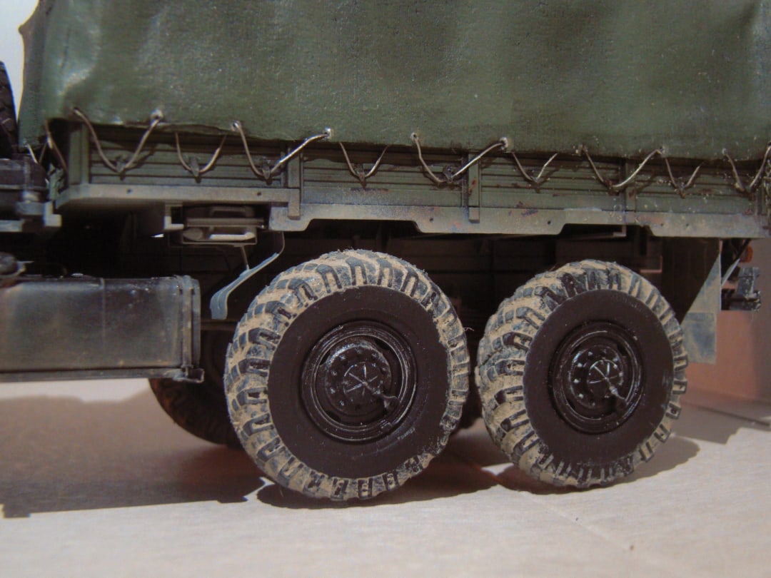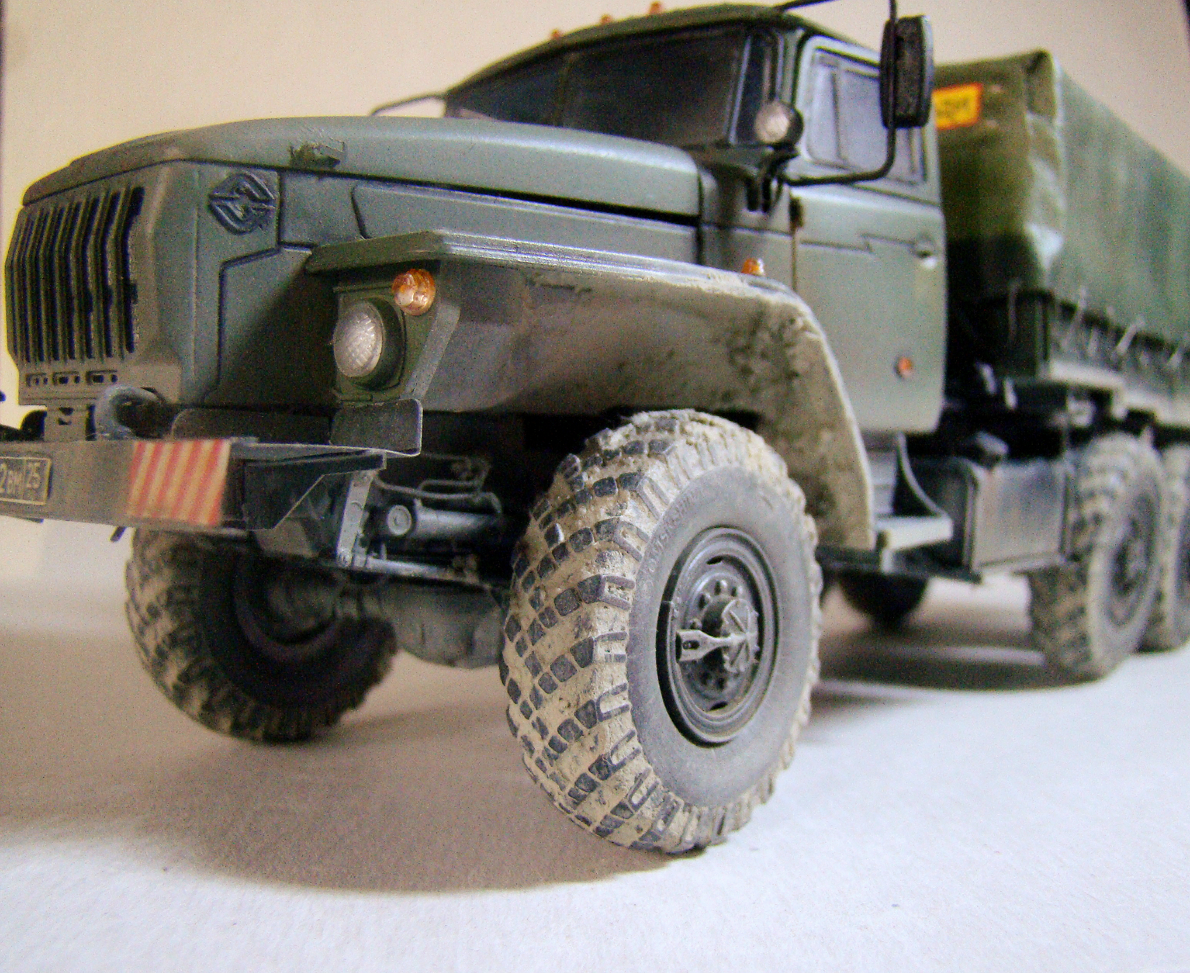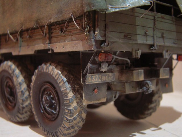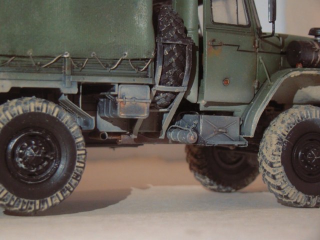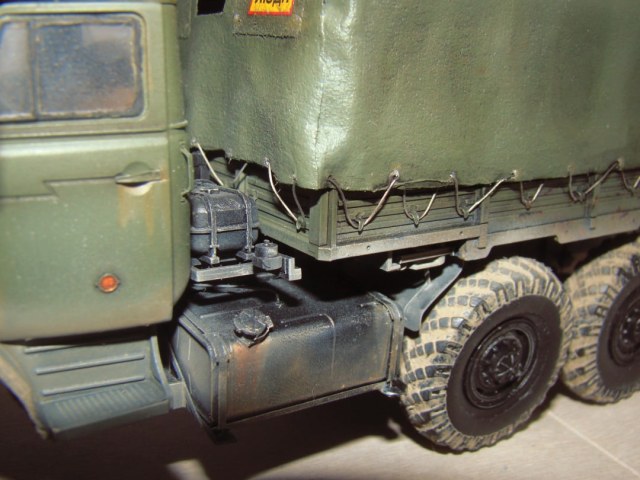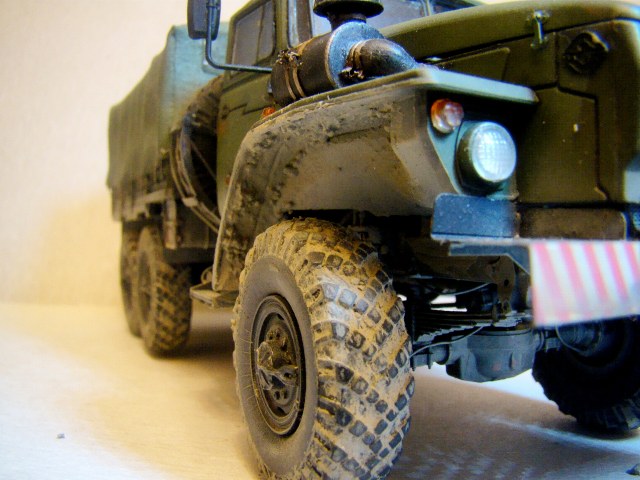 Обгадинг не соответсвует. Если Урал акунулся в грязь с таки ляпушками в арках, то и гряз в дисках должна быть. колеса в танец. верх чистый- не порядок. в целом норм, но... в армии капот не гниет а умело краситься водителем, обтяжка тента толстовато и грубовато.