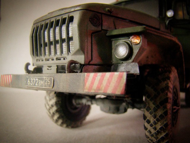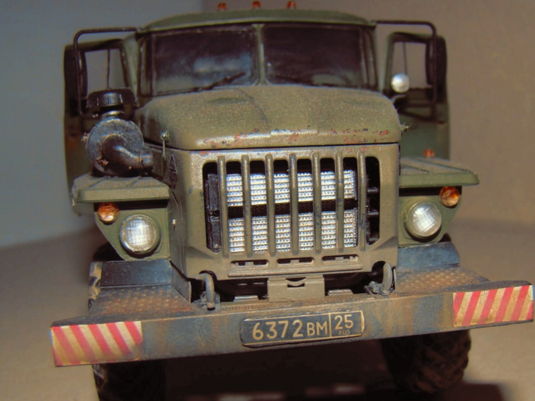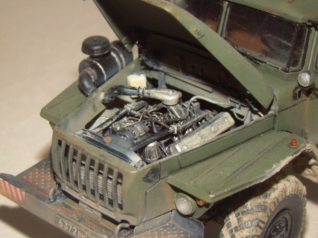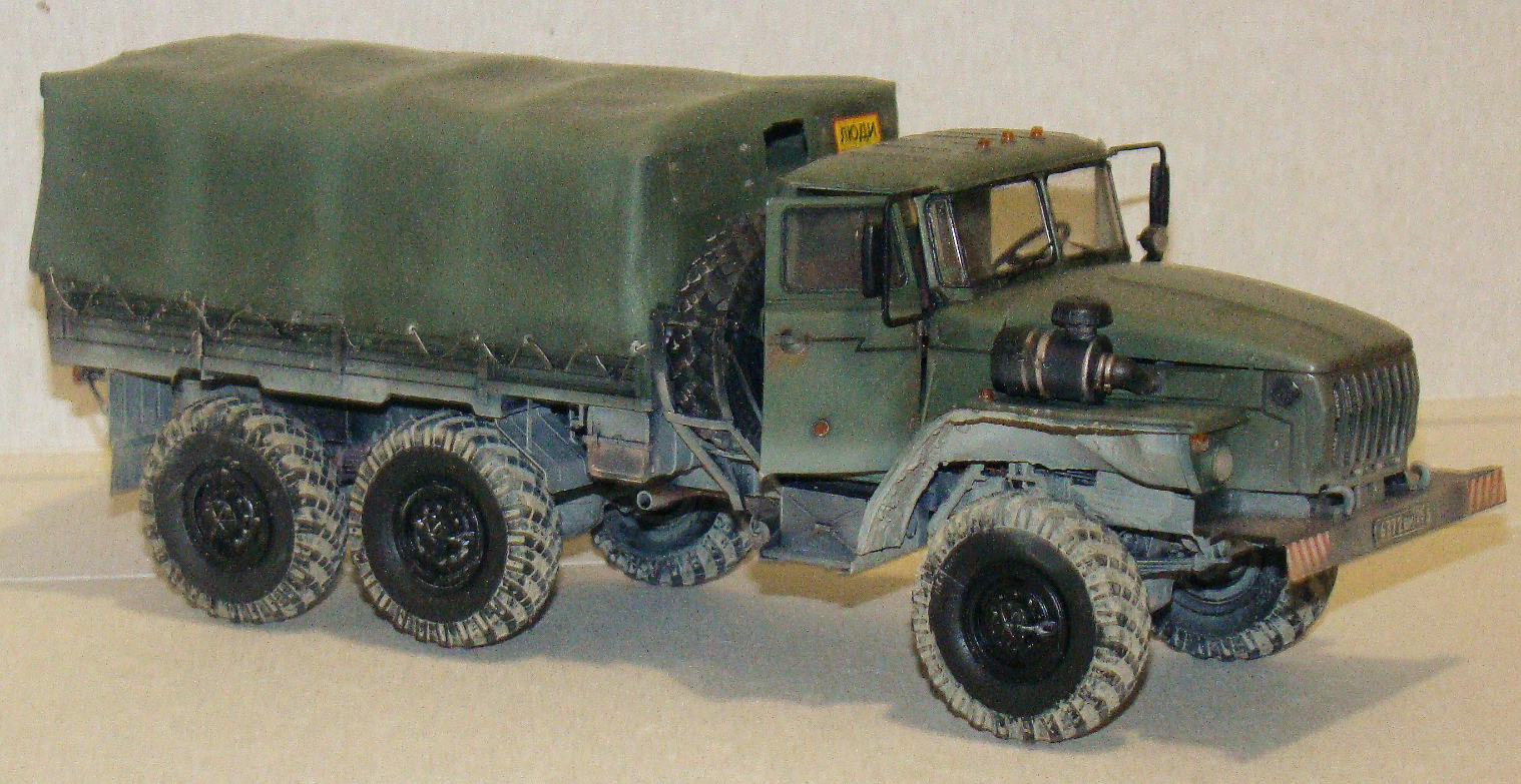 Модель грузовика Урал 4320 от Звезды. Особых проблем со сборкой не возникало, использовал фототравление от «Микродизайн», тент самодельный из салфетки и ПВА. красил аэрографом, основной цвет краска от «Arma Colors», остальное красками «Тamiya», смывка «Тamiya», пигменты Wilber. В двигателе добавил проводку и шланги из проволоки.