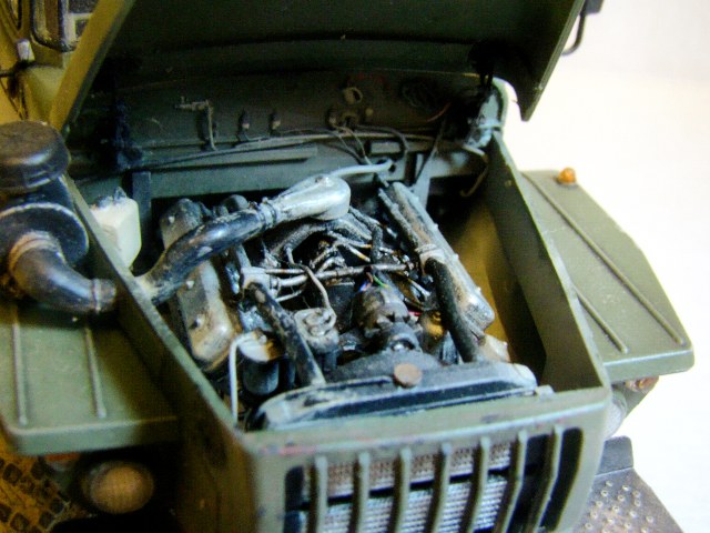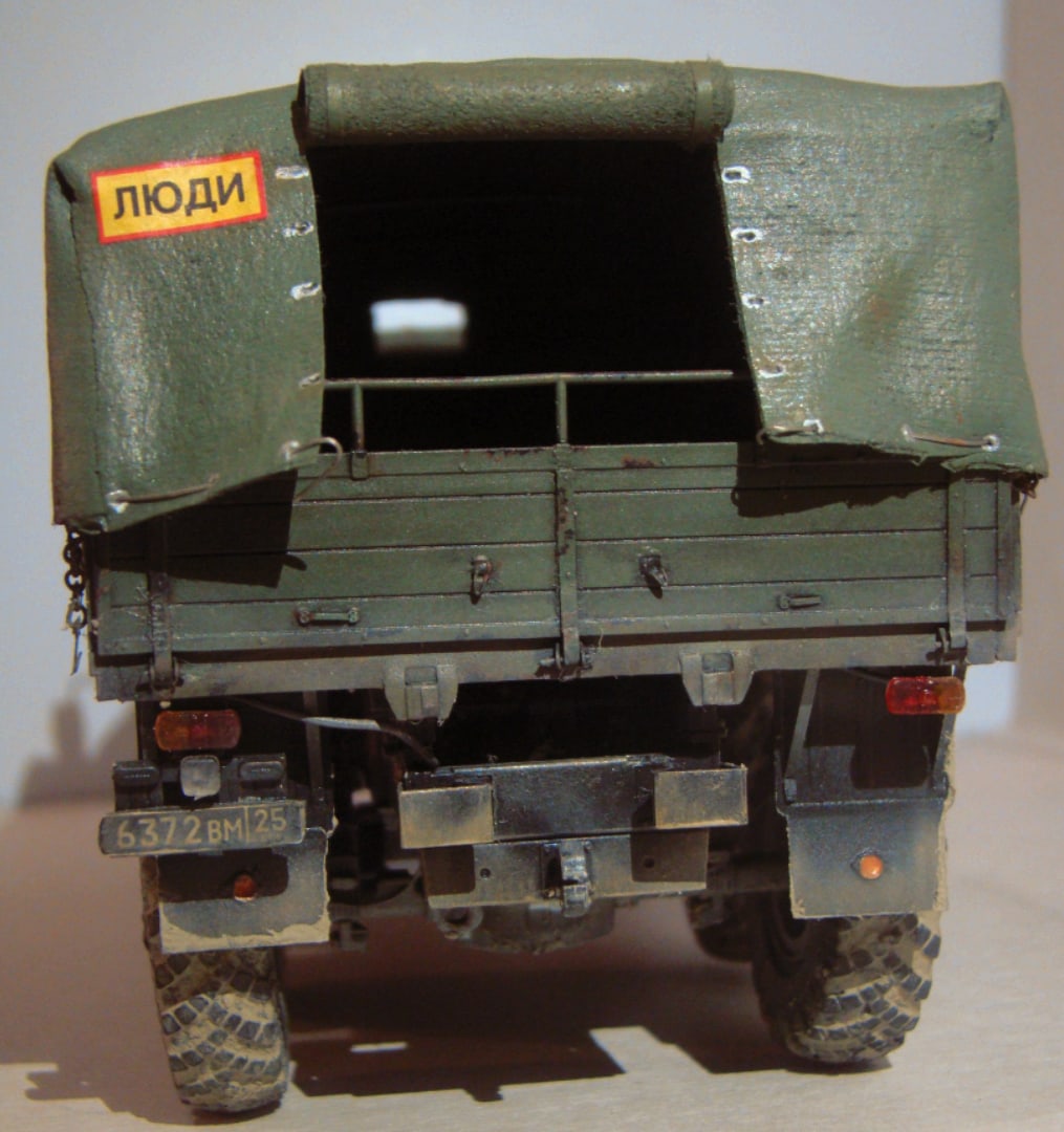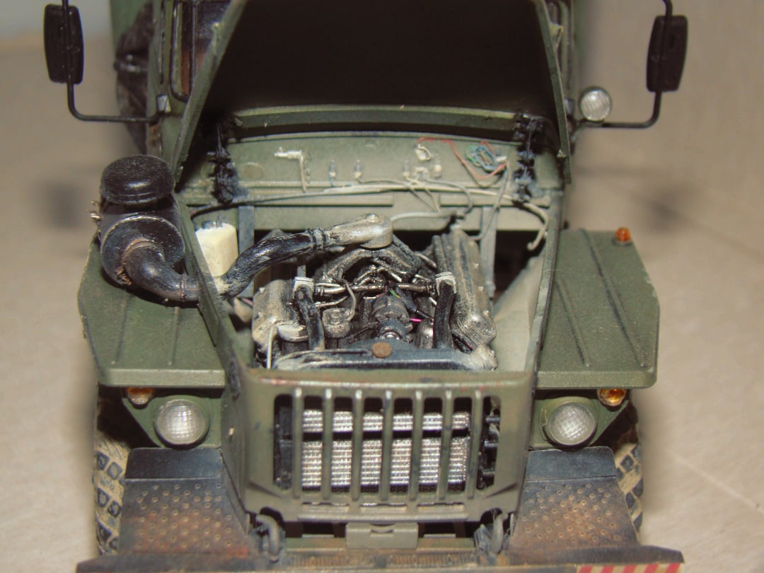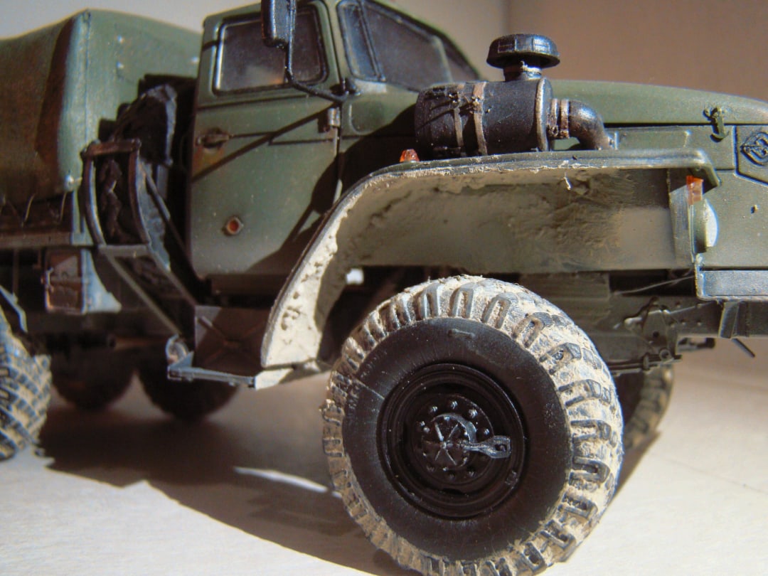 Модель грузовика Урал 4320 от Звезды. Особых проблем со сборкой не возникало, использовал фототравление от «Микродизайн», тент самодельный из салфетки и ПВА. красил аэрографом, основной цвет краска от «Arma Colors», остальное красками «Тamiya», смывка «Тamiya», пигменты Wilber. В двигателе добавил проводку и шланги из проволоки.