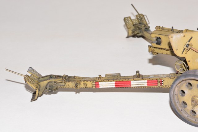 Представляю Вашему вниманию модель немецкой 88-мм противотанковой пушки периода Второй Мировой войны - Pak.43/41. Данное орудие появилось в результате реализации проекта по оптимизации производства, упрощению конструкции и уменьшению размеров обычной Pak.43. В частности, был произведен отказ от тяжелого и сложного в производстве крестового лафета данной арт.системы, в пользу обычного лафета с раздвижными станинами (был использован лафет от опытной 105-мм пушки leK.41, установленный на колеса от 150-мм гаубицы sFH.18). В части боевого применения результат такой модернизации оказался не очень хорош. Пушка осталась быть очень тяжелой и требовала для транспортировки мощного тягача. Была громоздкой и высокой (значительно выше нашего аналога - 100-мм БС-3, да и исходной Pak.43 на крестовом лафете в ее боевом положении, тоже), что затрудняло ее маскировку. И кроме того, в отличии от Pak.43 имела значительно более узкий угол горизонтальной наводки. Все это делало ее очень уязвимой от фланговых атак, что частично нивелировалось высокой эффективностью и дальностью стрельбы. Тем не менее, в плане упрощения конструкции орудия и, как следствие, его производства, цель была достигнута. Орудие в данной модификации производилось до конца войны.