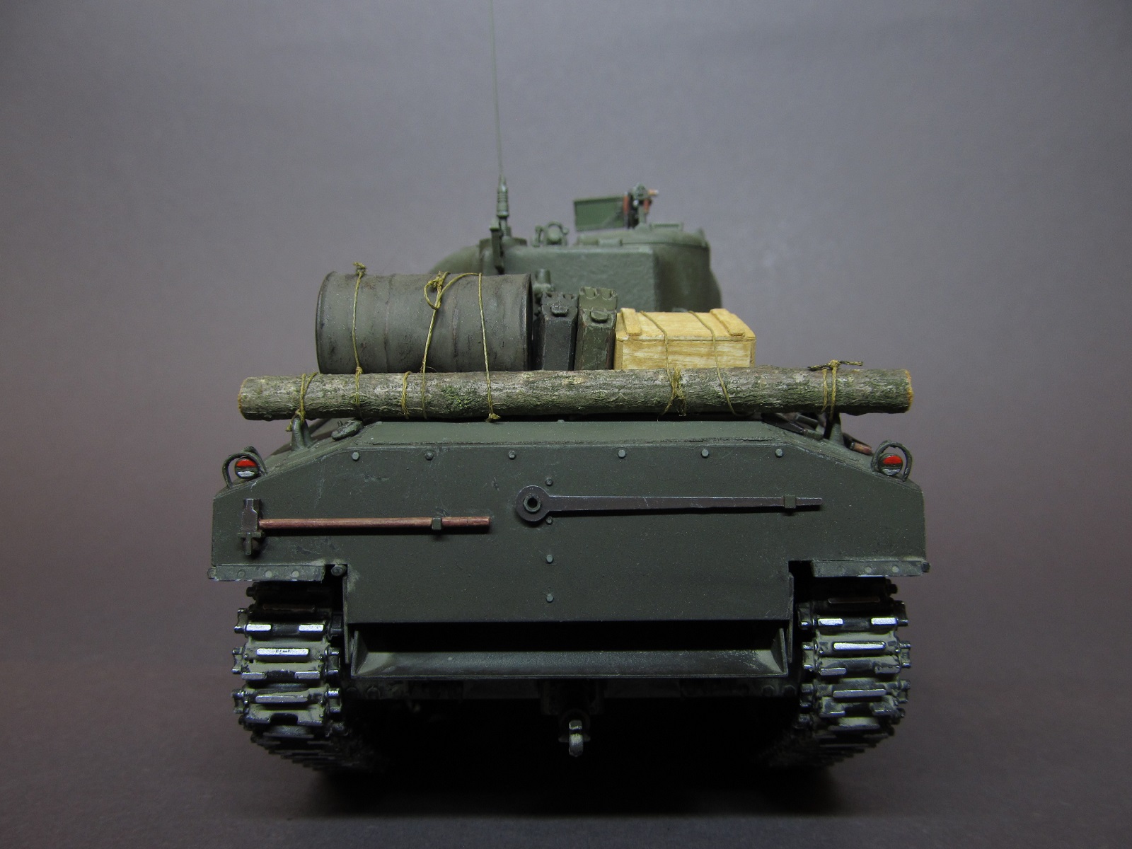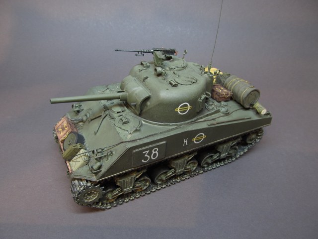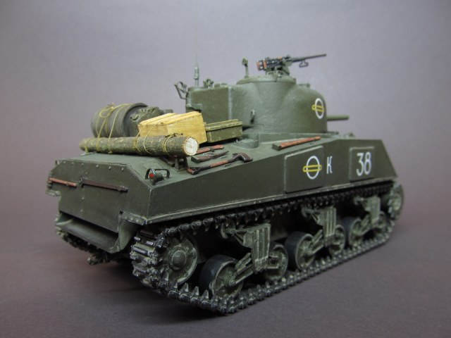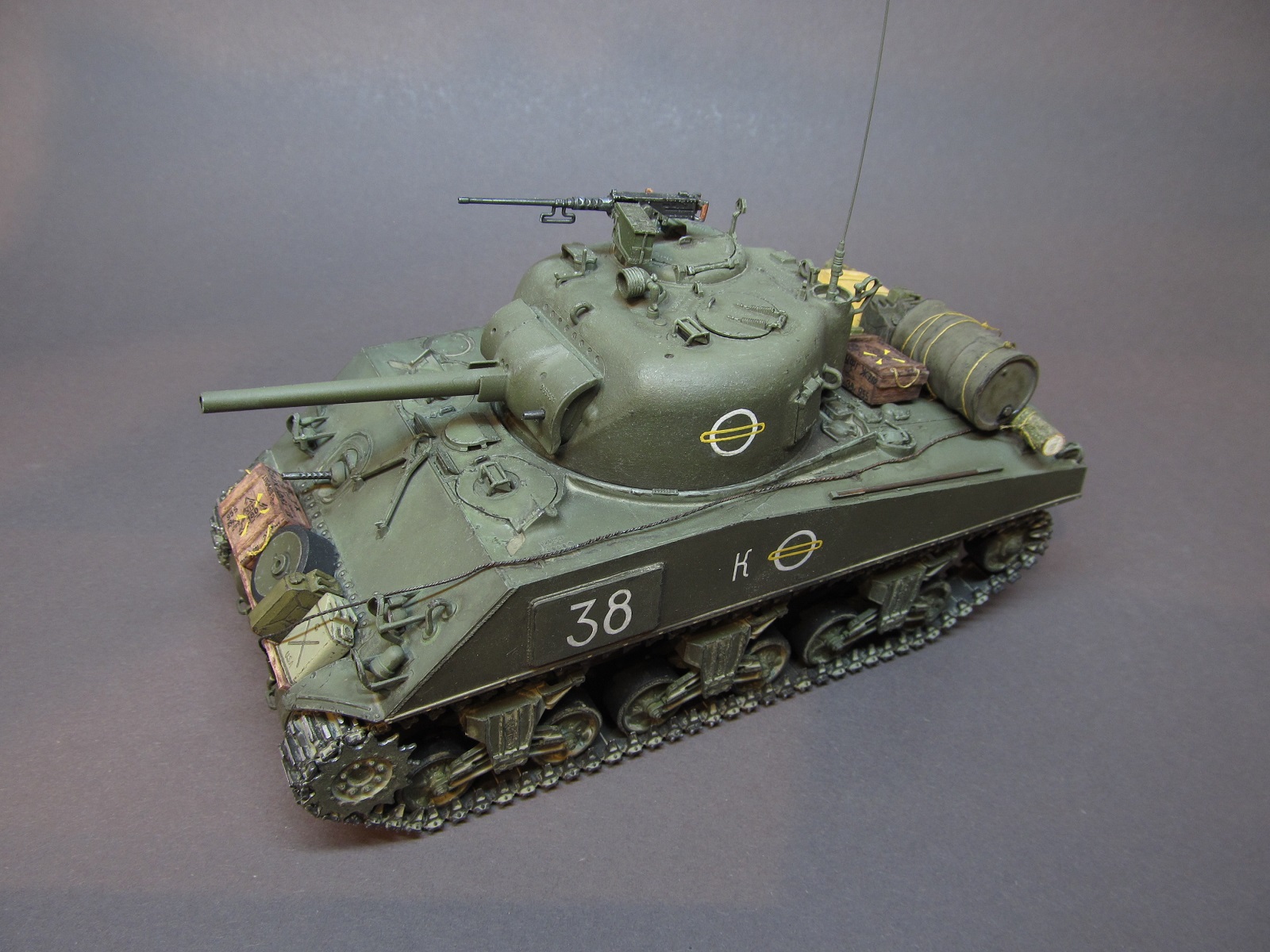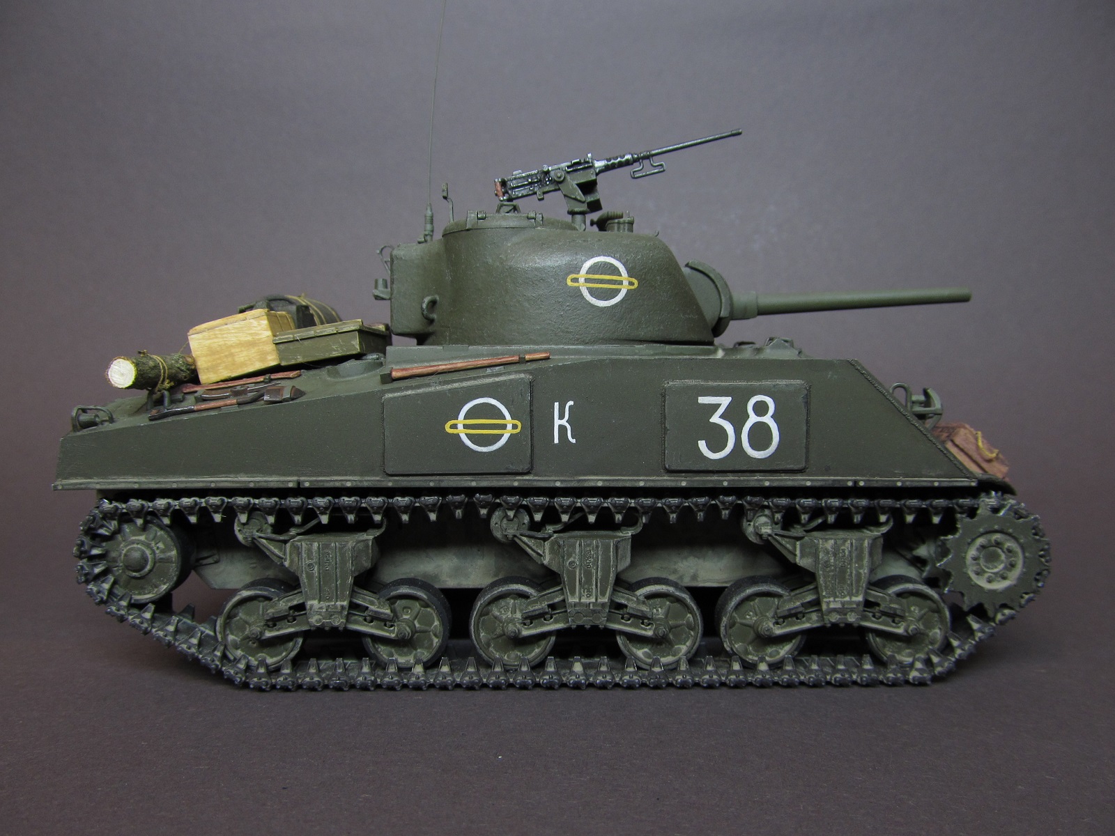 По поводу "обвеса": с ним танк (а тем паче- "Шерман") смотрится куда как интереснее. Опять же, основываясь на архивных фотографиях, можно увидеть, что экипажи данных машин при совершении маршей крепили на броню все необходимое, что могли закрепить и увезти: и доп. боеприпасы, и горючку, и прочий скарб. Пусть никого не смущает наличие на лобовой части танка канистр с топливом и ящика с патронами- для марша это вполне уместно.