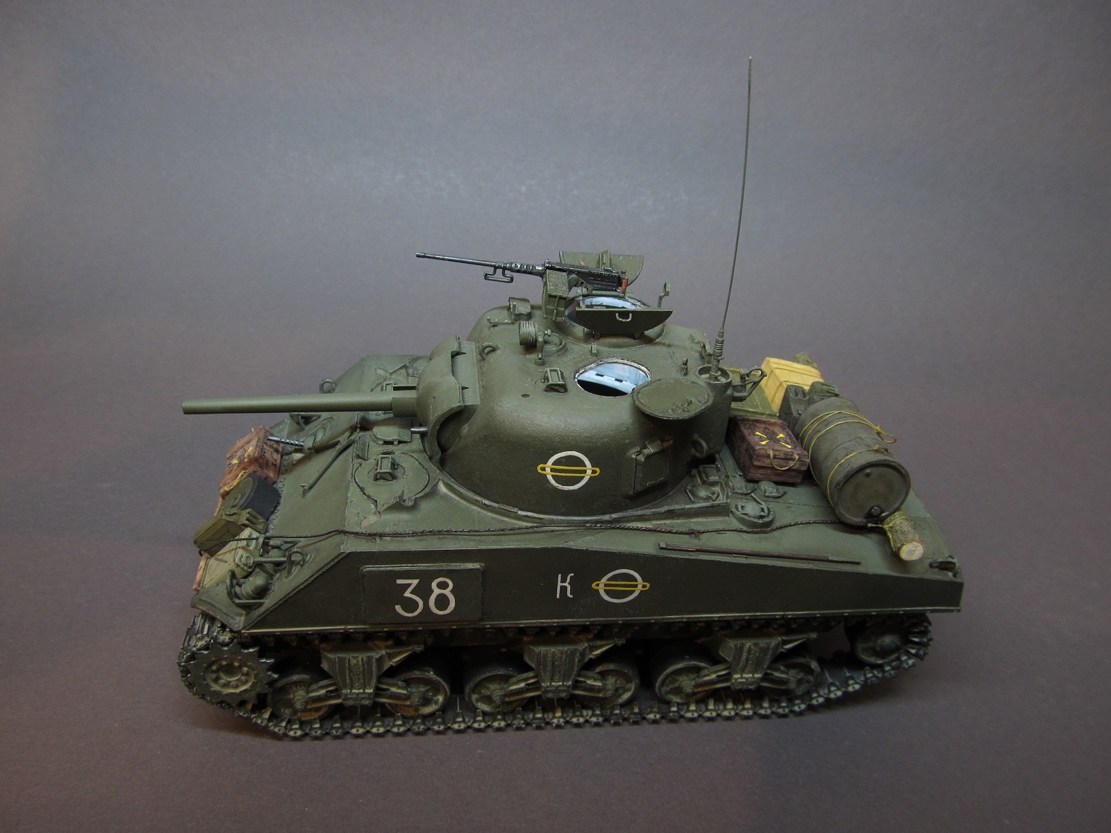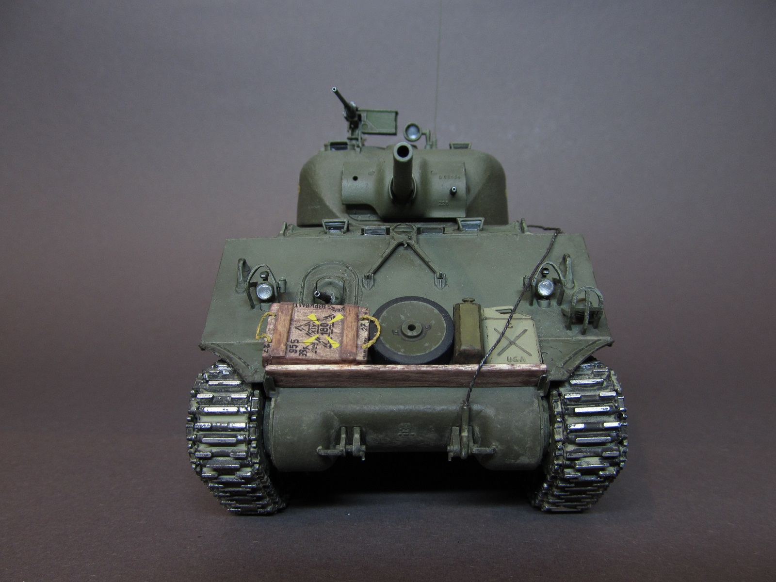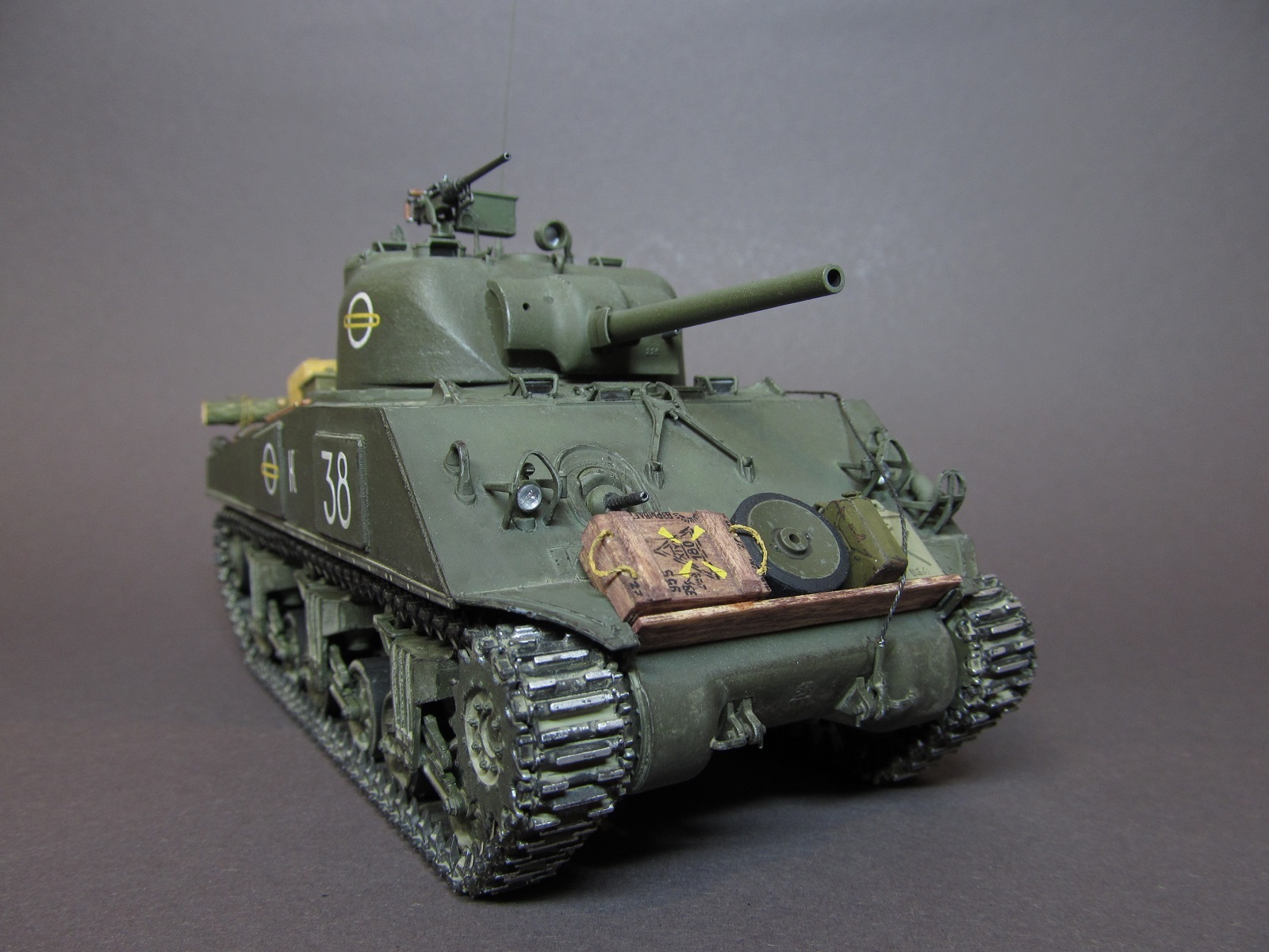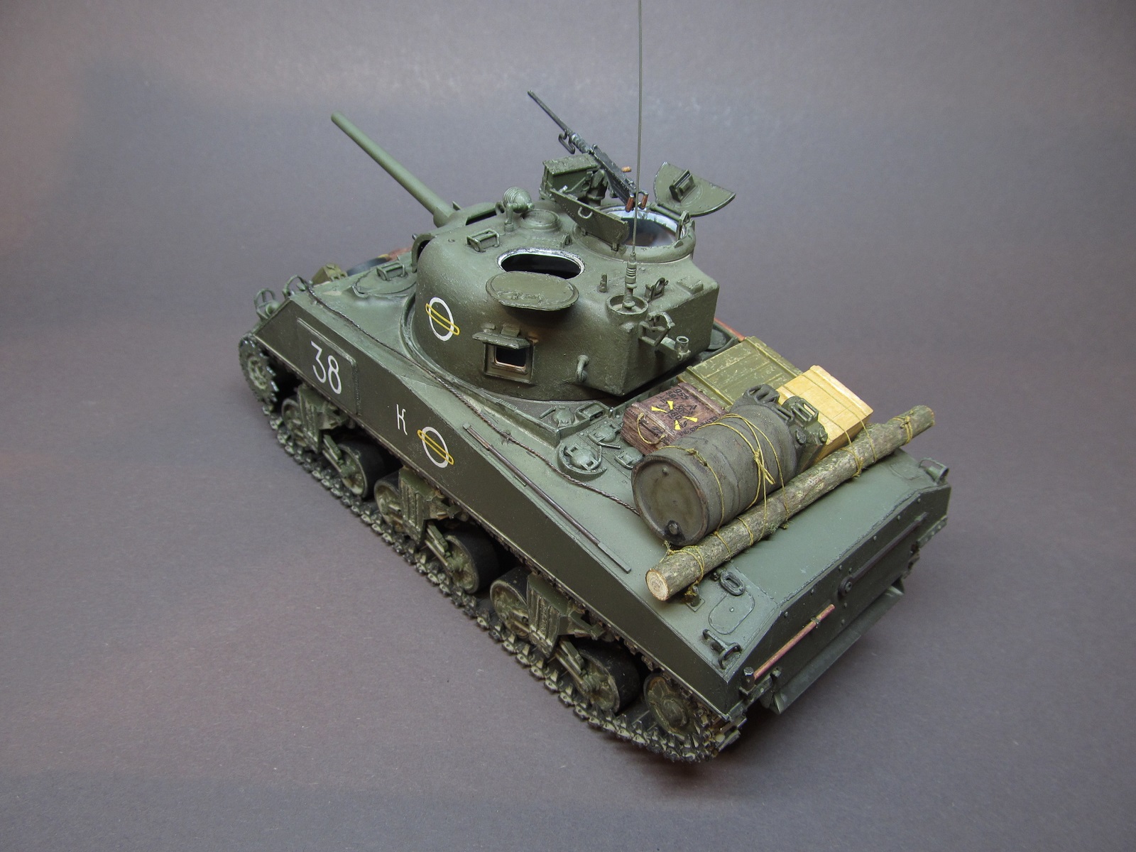 По поводу "обвеса": с ним танк (а тем паче- "Шерман") смотрится куда как интереснее. Опять же, основываясь на архивных фотографиях, можно увидеть, что экипажи данных машин при совершении маршей крепили на броню все необходимое, что могли закрепить и увезти: и доп. боеприпасы, и горючку, и прочий скарб. Пусть никого не смущает наличие на лобовой части танка канистр с топливом и ящика с патронами- для марша это вполне уместно.