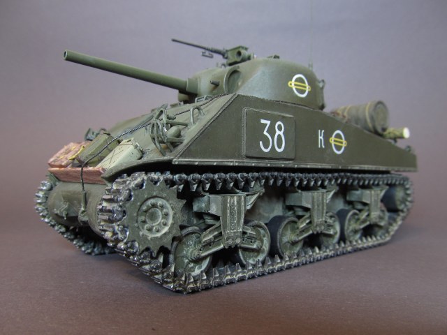По модели. Цвет такой, как на модели, скорее был характерен для британского танкового корпуса. Очень понравились швы, прямо, как на родной машине. Чутка покритикую, но это с наилучшими пожеланиями автору. Правая задняя фара окрашена не верно. Не было на ней верхнего красного стекла. Шанцевый инструмент не закреплен ремнями, с ними здорово смотряться модели. Зап. каток такого типа уместен, если это танк воевал уже после 44го года. К сожалению, автор модели не указал для какого фронта и времени характерны декали на броне. Что в ящиках, снаряды? Тогда веревочные руки к ним....? Не просверлены сливы воды на корпусе. Внутренняя сторона крышки люка заряжающего была с подбоем из кожзама коричнегого, реже черного цвета, у вас - зеленая. Хорошо было бы "обварить" буксировочные петли, просто гуще посадочные места этих петель, залить клеем и вылезут остатки имитируя сварочные швы. Возможно, на машине должны стоять аналогичные тележки, но с горизонтальным кронштейном поддерживающего катка. Но здесь у меня уверенности нет, т.к. еще раз скажу, что автор не указал год боевой службы машины. Конечно, просяться травленые ограждения фар и гудка. Но в целом, это все придиризмы. И если автор ставил цель собрать изкоробку, то его цель достигнута. С уважением!