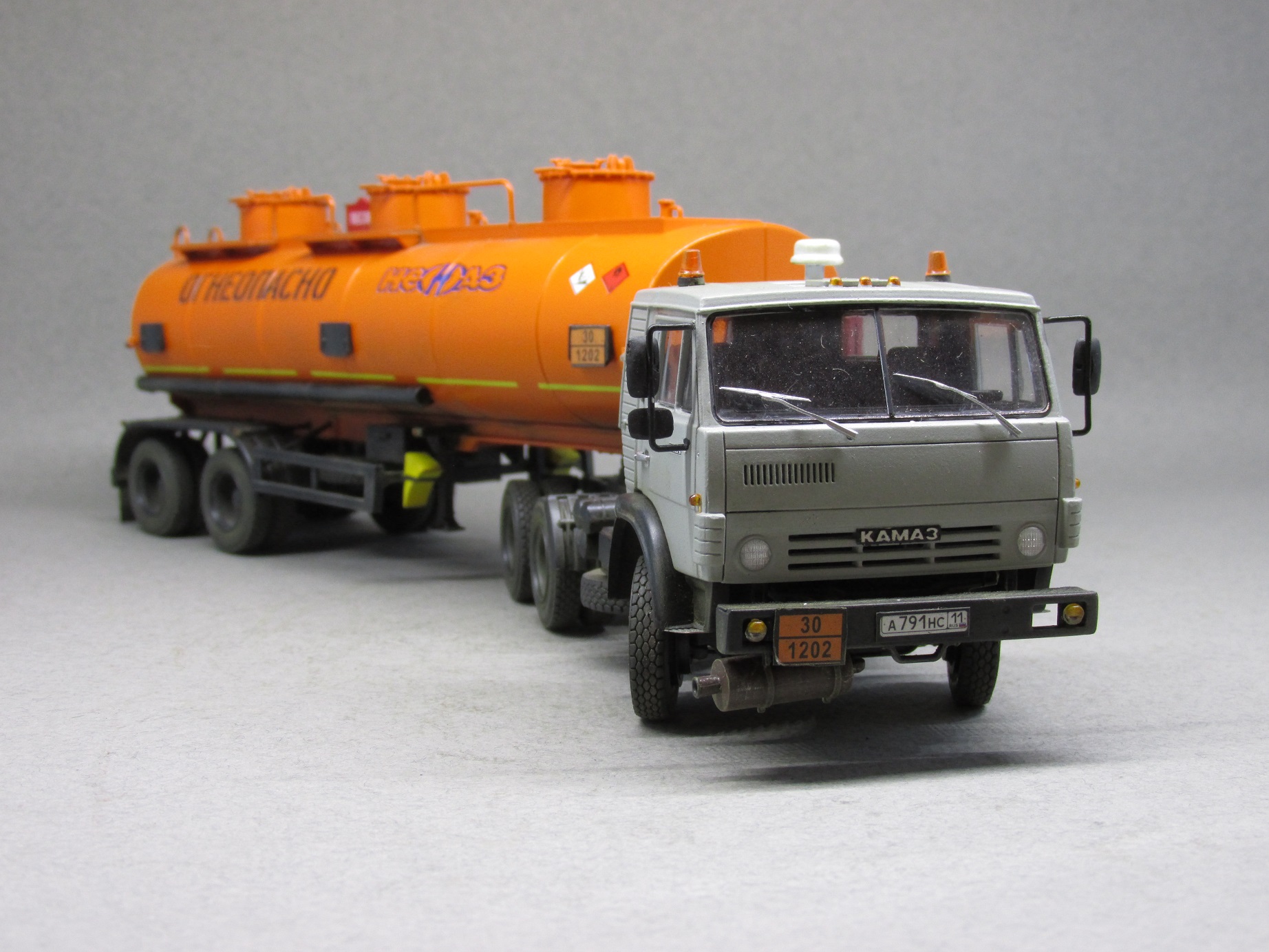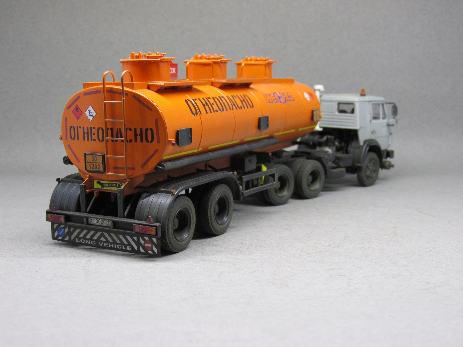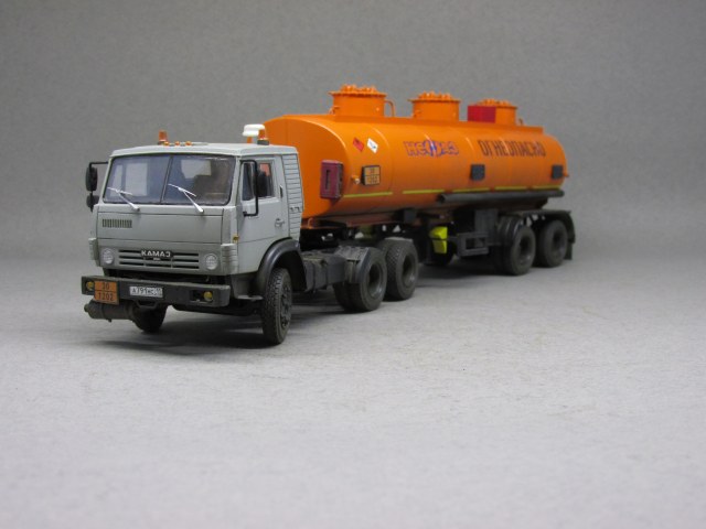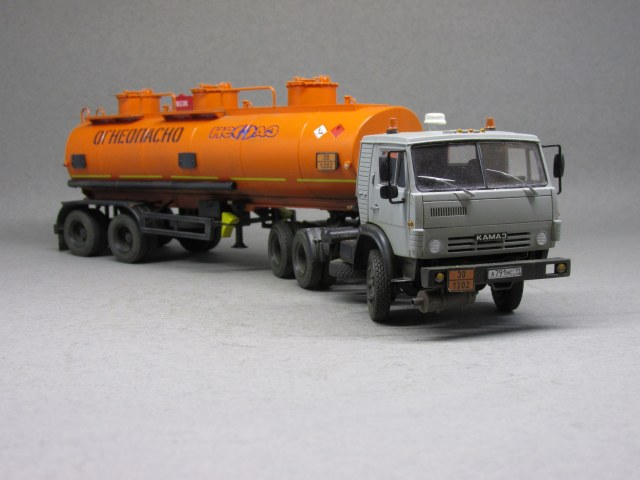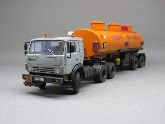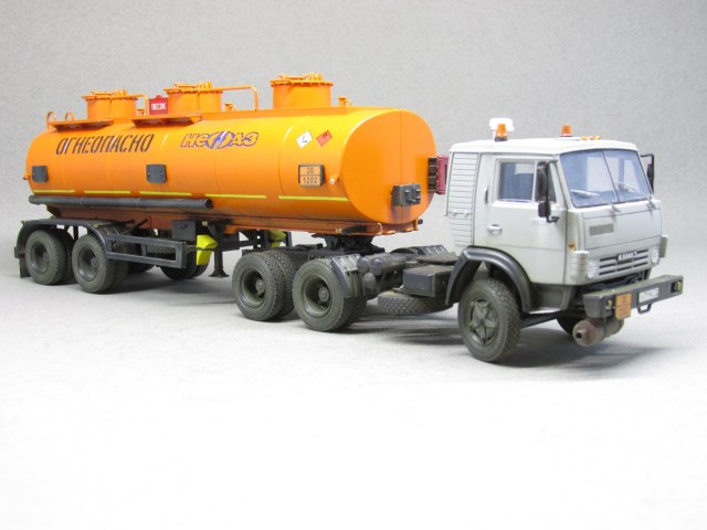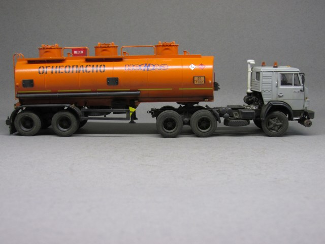 Немного о масштабной копии. Для сборки данной модели AVD-models выбран собирательный образ сцепки-наливника нулевых годов нового века. В связи с этим в модель внесено несколько мелких, но характерных изменений. Во первых глушитель. На бензовозах от вынесен вперед. На модели помимо разворота глушителя пришлось еще и бампер передний переделывать. Во вторых кабина. Удалены раздельно стоящие буквы КАМАЗ, вместо этого установлена эмблема от более свежей модели. Также переделаны зеркала наболее современные. В целом, мне кажется, получился образ видавшего виды тягача в руках заботливого владельца.