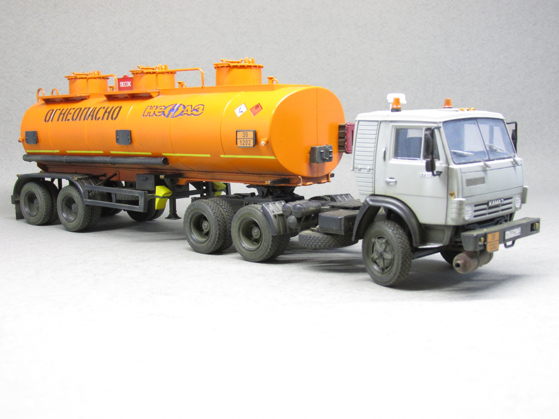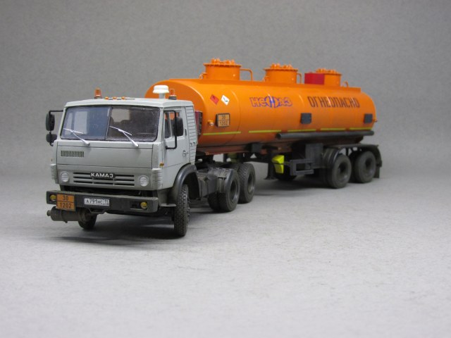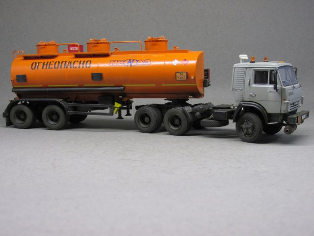 При сборке модели установлен передний мост и резина от Маэстро-моделс и фототравление от Петрограда и АЕМ. Кабина тягача окрашена Тамией, а бочка — апельсин от Мотип. Модель в основном по низу обработана сухими пигментами от Тамии и Ревелл.