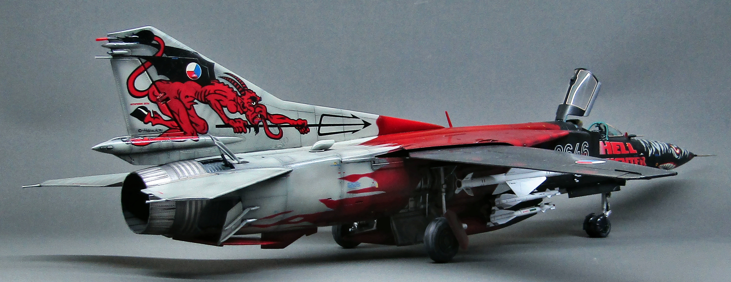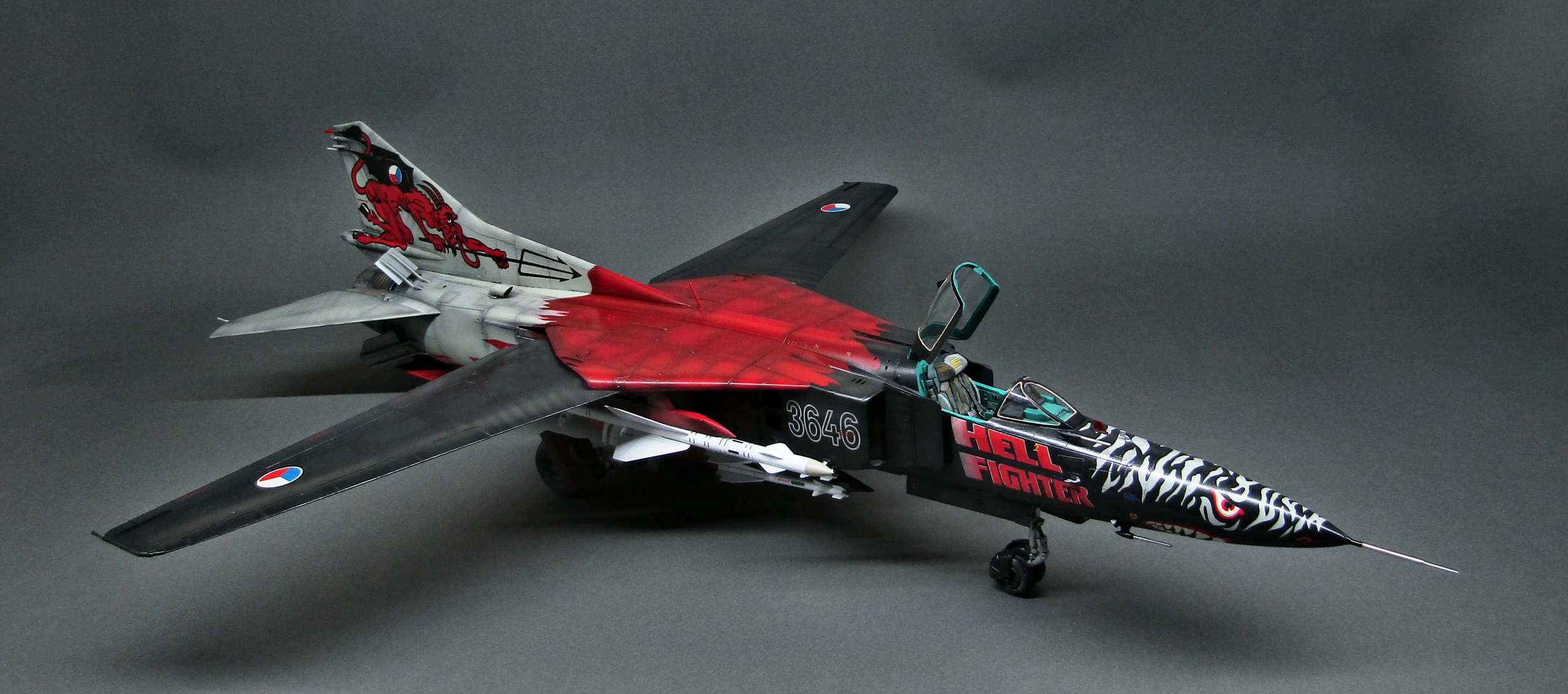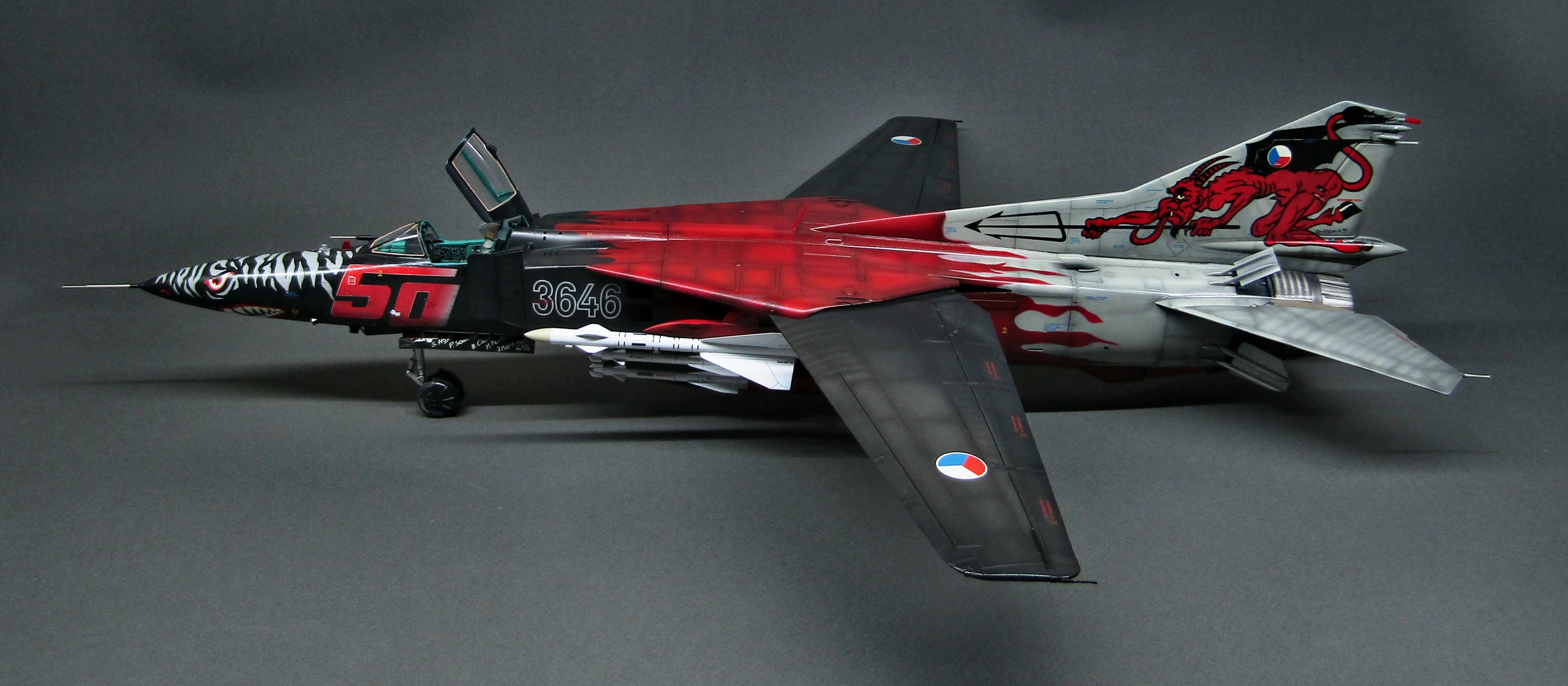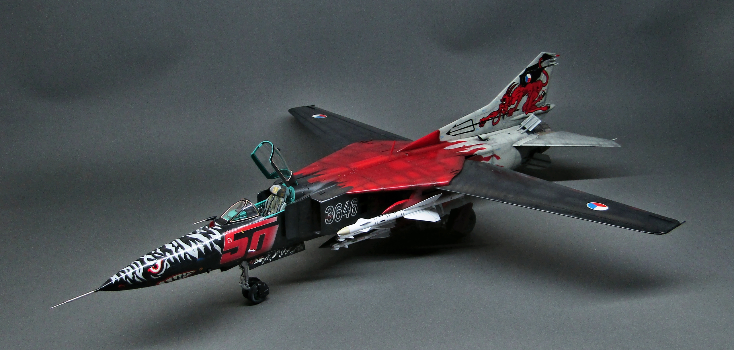 Приветствую коллеги! Представляю один из своих долгостроев. Работу над этим "монстром" закончил давно, но выложить дошли руки только сейчас. Авиация в 32-м масштабе для меня в новинку, набор (trumpeter 03210) в представлении не нуждается и лично мне очень понравился. В качестве прототипа был выбран Чешский борт 1994 года, базировавшийся на авиабазе Č. Budějovic в честь празднования 50-летия со дня создания первого самостоятельного чехословацкого истребительного полка, сформированного в годы Второй мировой войны в СССР. Для воплощения задуманного с Украины были заказаны декали от Authentic decals (32-01). В процессе стройки был к сожалению установлен факт того, что модификация прототипа МиГ-23 МФ, а набор