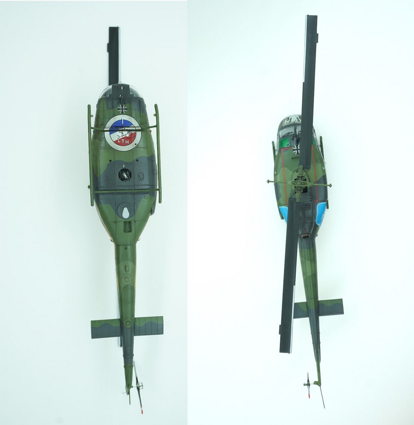 Проблема пластика от Italeri заключается в том, что он имитирует американский ирокез, в то время как вертолёты немецкой сборки отличались капотом двигателя и рядом других черт. В результате пришлось переделывать капот двигателя в соответствии с германским вариантом (жалюзи вентиляции, воздухозаборники). Самое неприятное это двери грузового отсека. Они имеют неверные проёмы остекления, и до кучи ПОЧТИ ВСЁ ОСТАЛЬНОЕ остекление так или иначе неправильное (нижние носовые блистеры имеют неверную форму, лобовое стекло имеет внутренние грани и нуждается в шлифовке/полировке, стёкла дверей пилотов имеют неправильное членение). Я, вообще не любитель прикладывать модель к чертежам, но данные косяки настолько налицо, что просто портят визуальное восприятие вертолёта, поэтому почти всё остекление подверглось замене или доработке (оставил без доработки только зелёные блистеры на крыше).