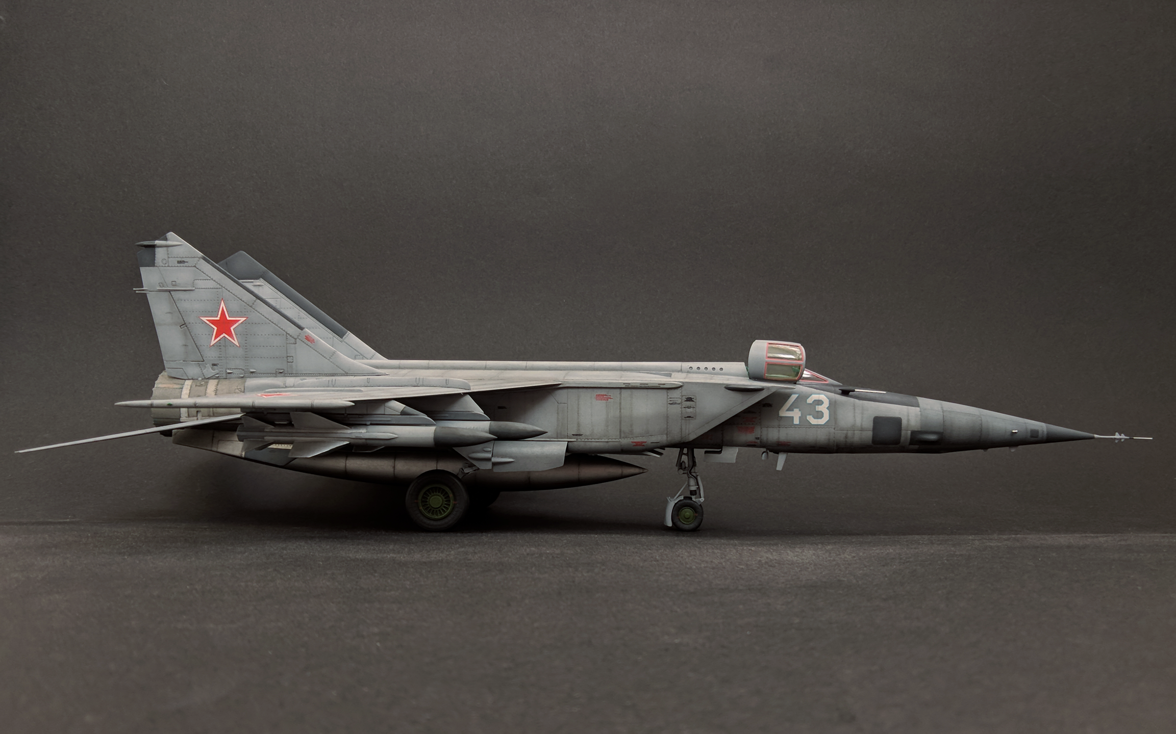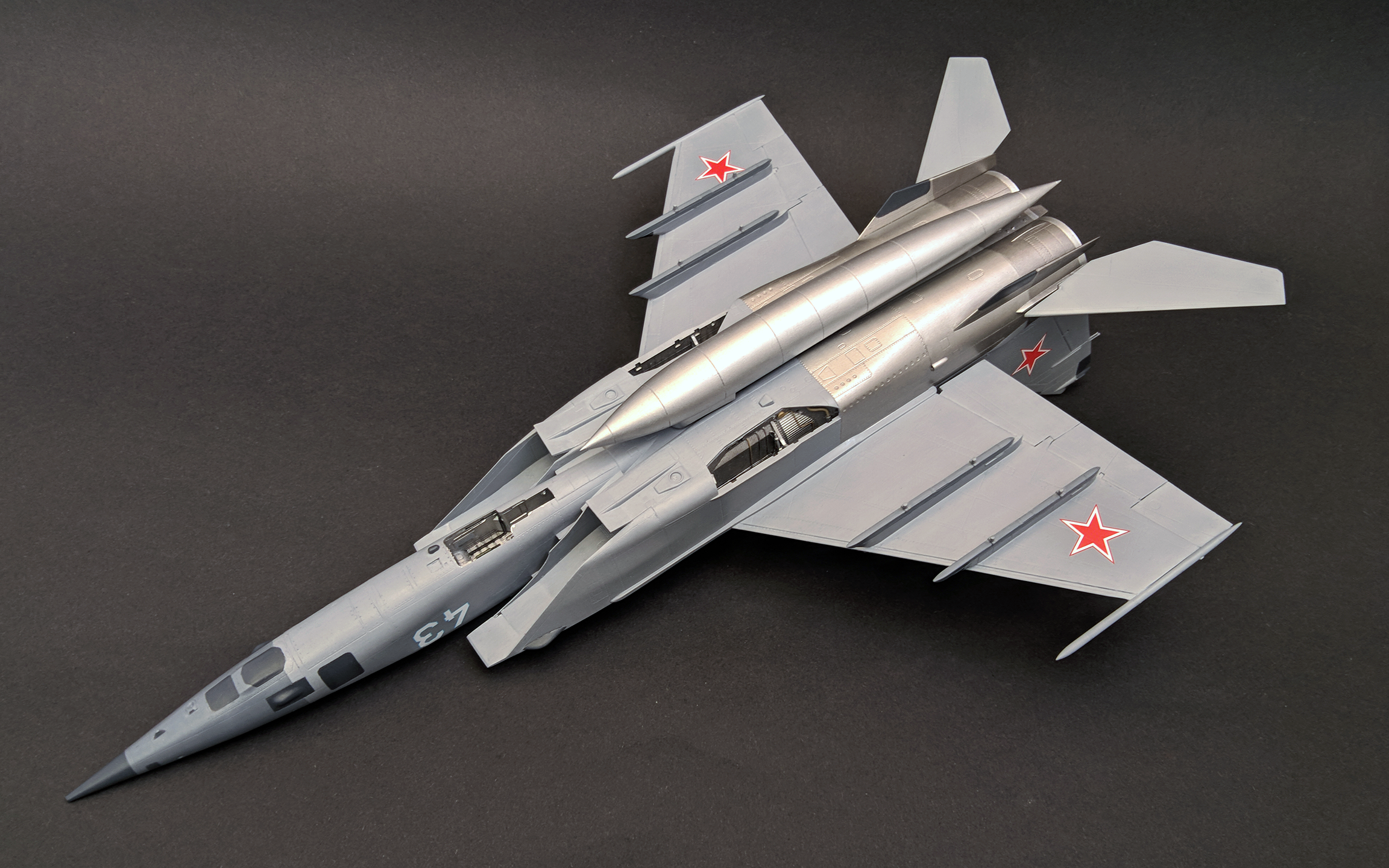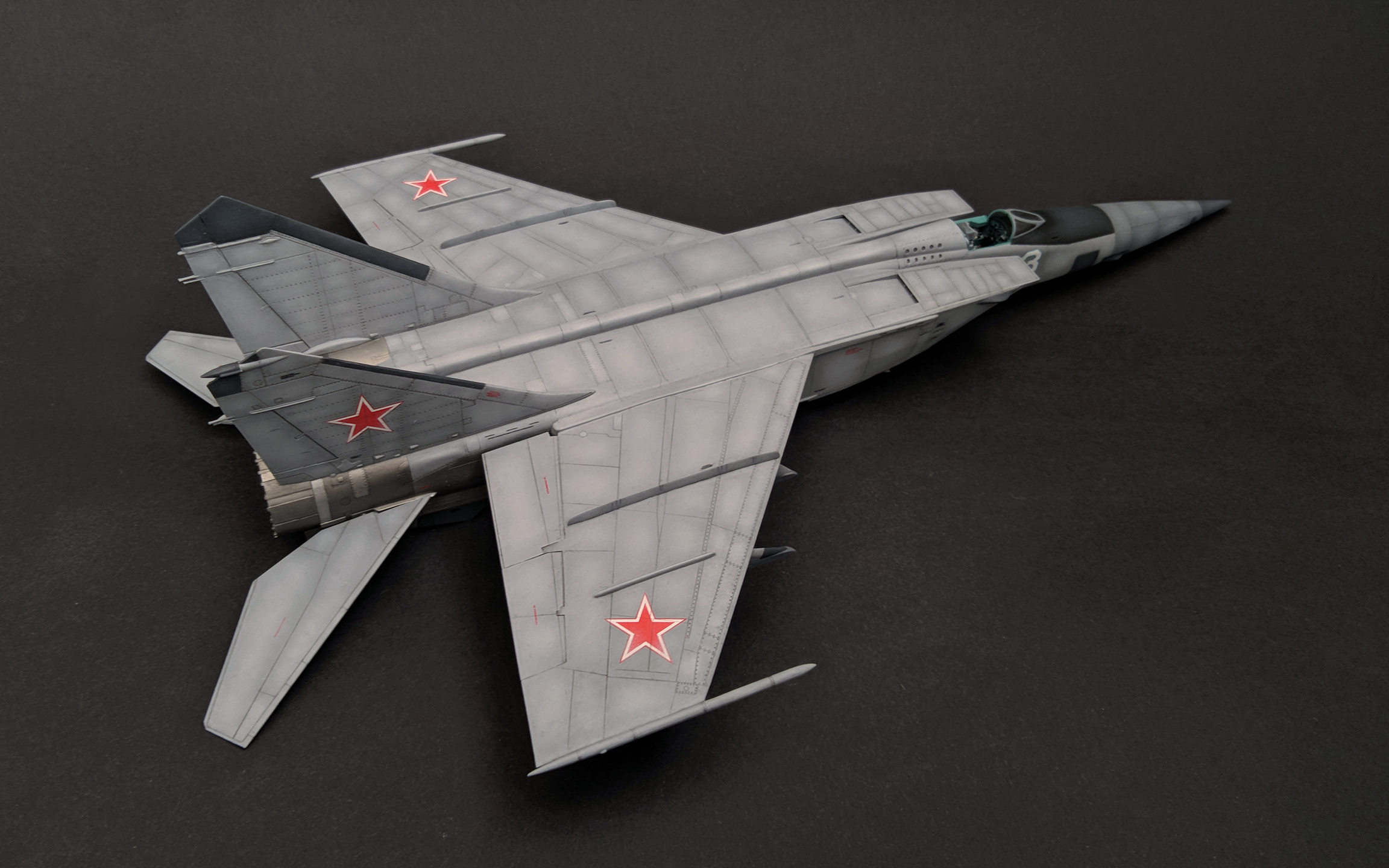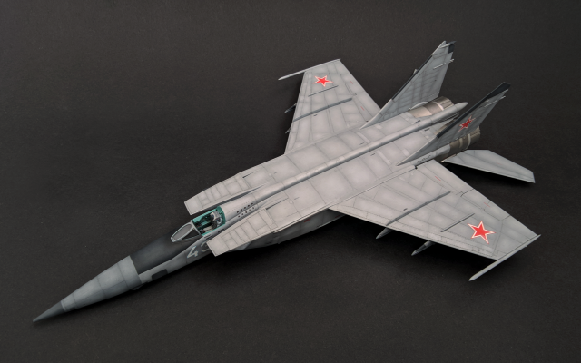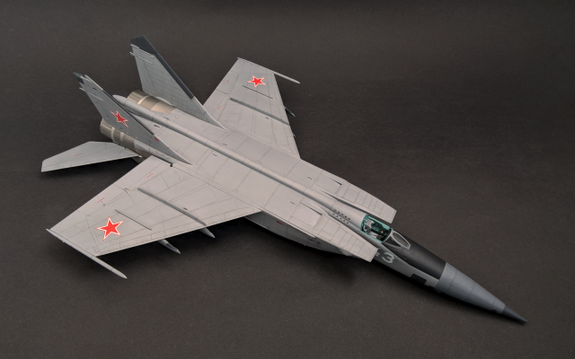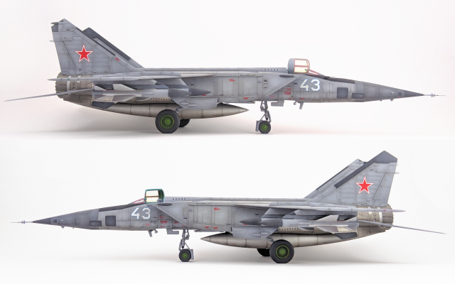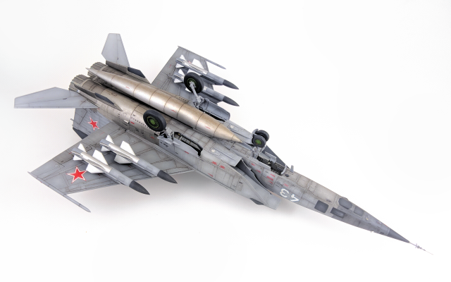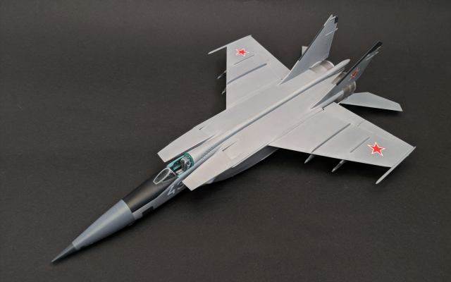 Уже хорошо знакомый мне набор МиГ-25 от ICM, теперь в варианте самолета прорыва ПВО, отличается от предыдущих другим носом и наличием ракет Х-58У с пилонами. Членение ракет несколько неудобное, под стать всему набору. Но в целом модель собралась без серьёзных проблем.