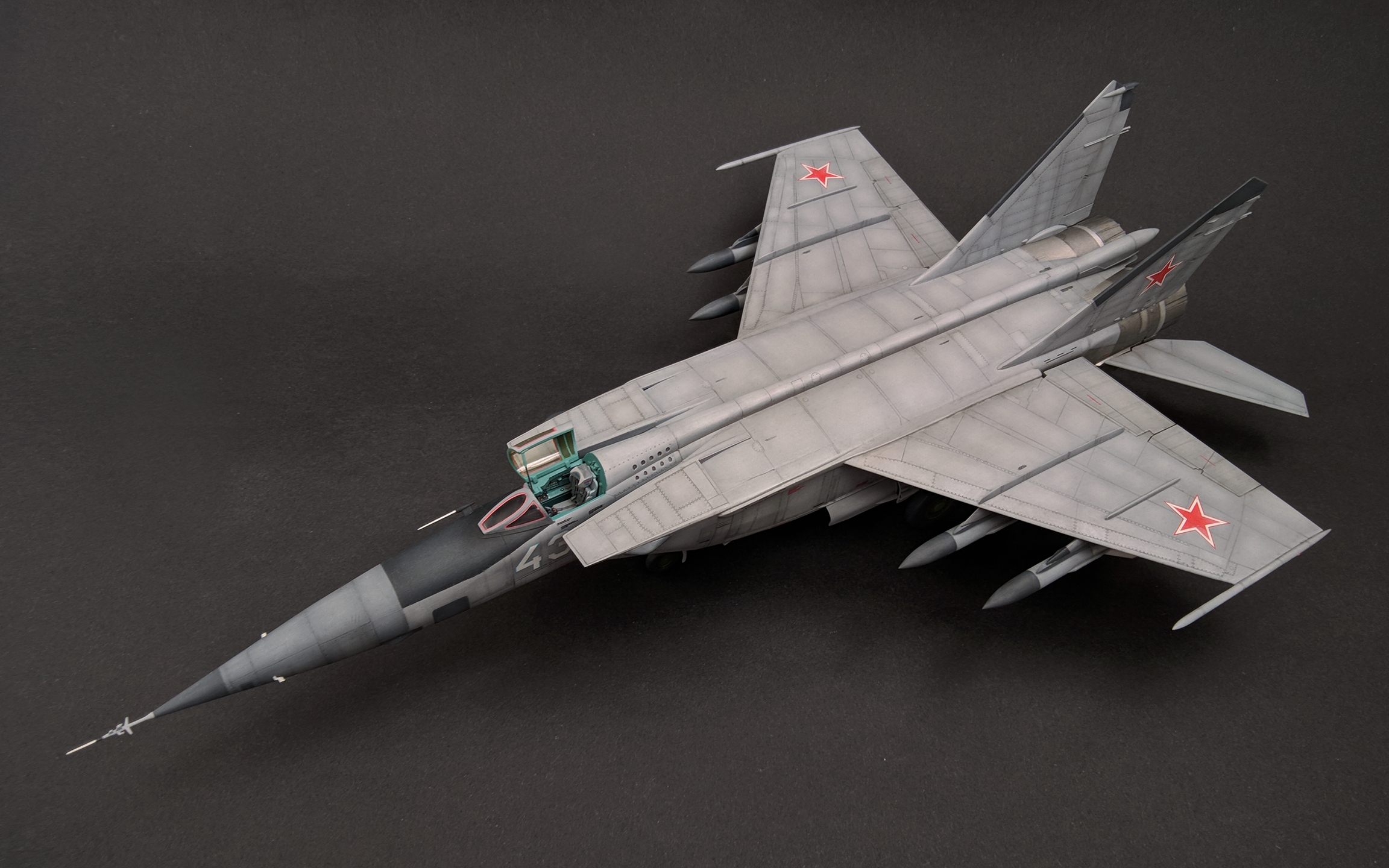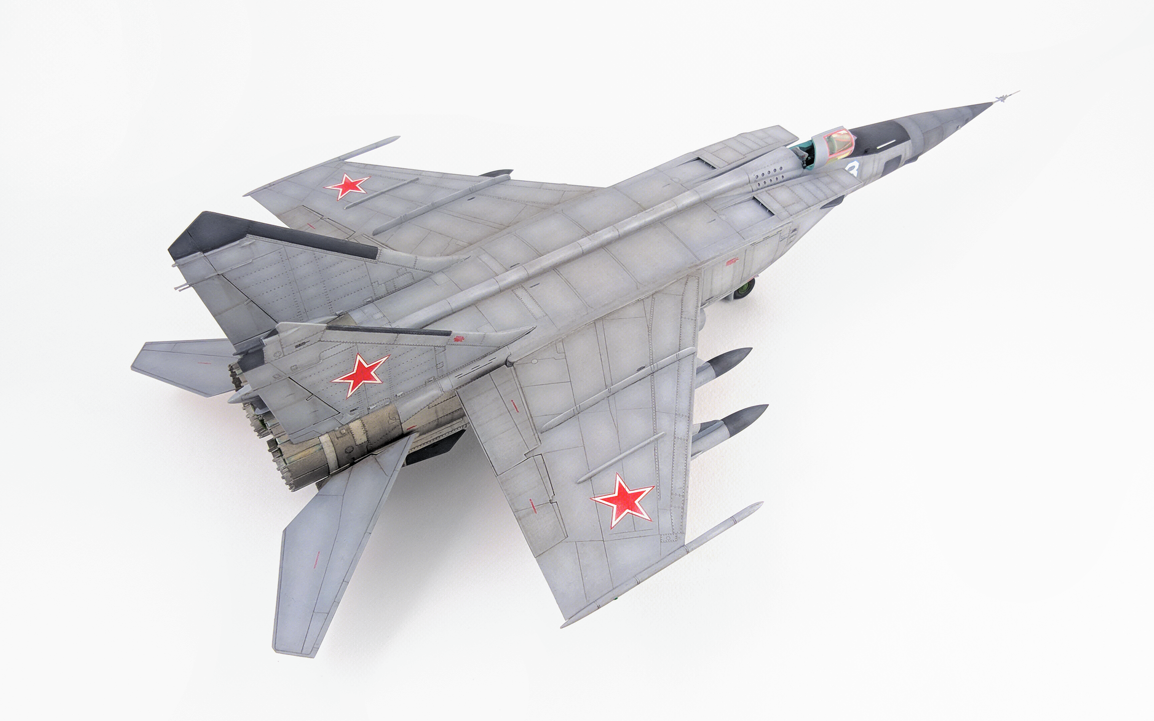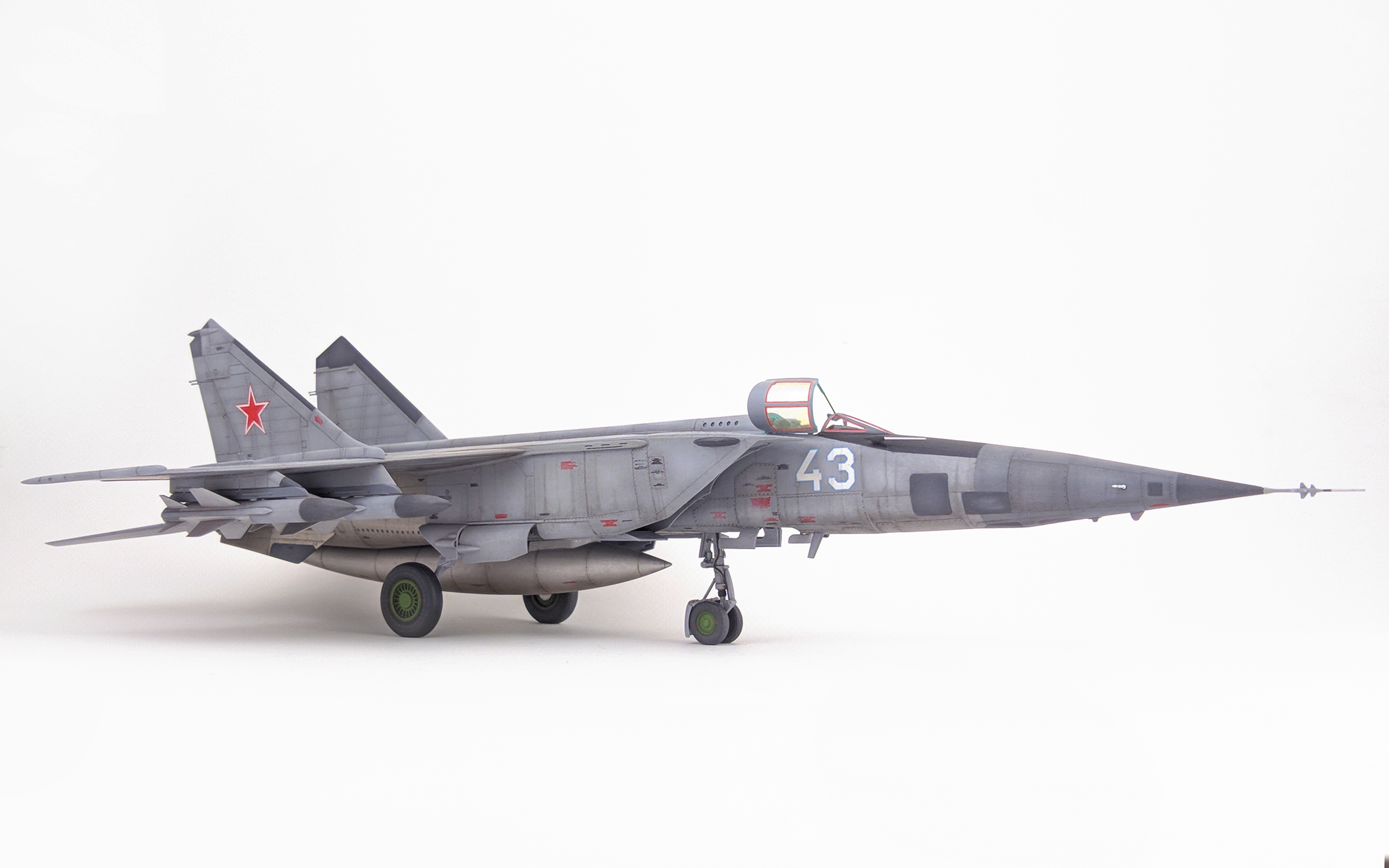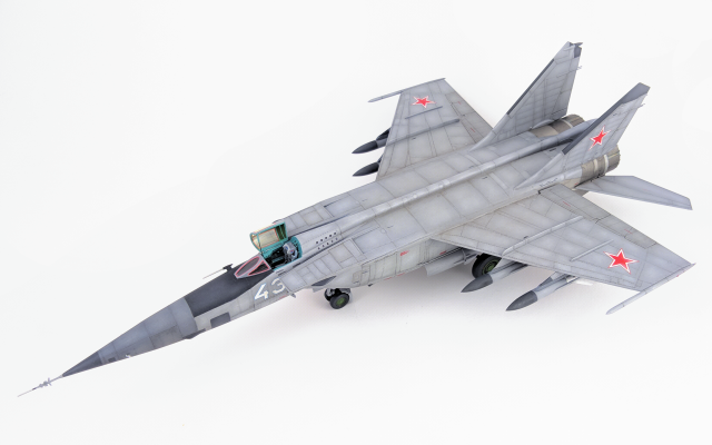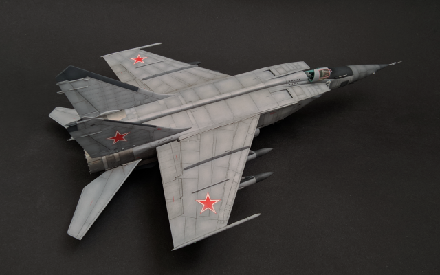 Уже хорошо знакомый мне набор МиГ-25 от ICM, теперь в варианте самолета прорыва ПВО, отличается от предыдущих другим носом и наличием ракет Х-58У с пилонами. Членение ракет несколько неудобное, под стать всему набору. Но в целом модель собралась без серьёзных проблем.