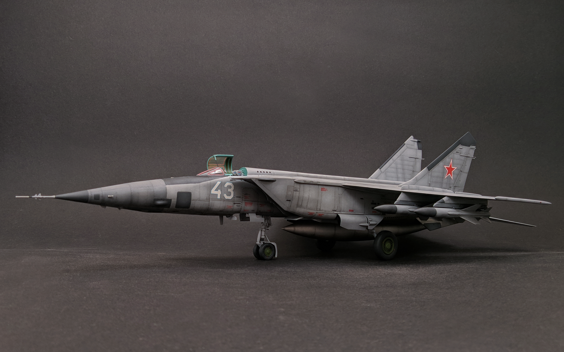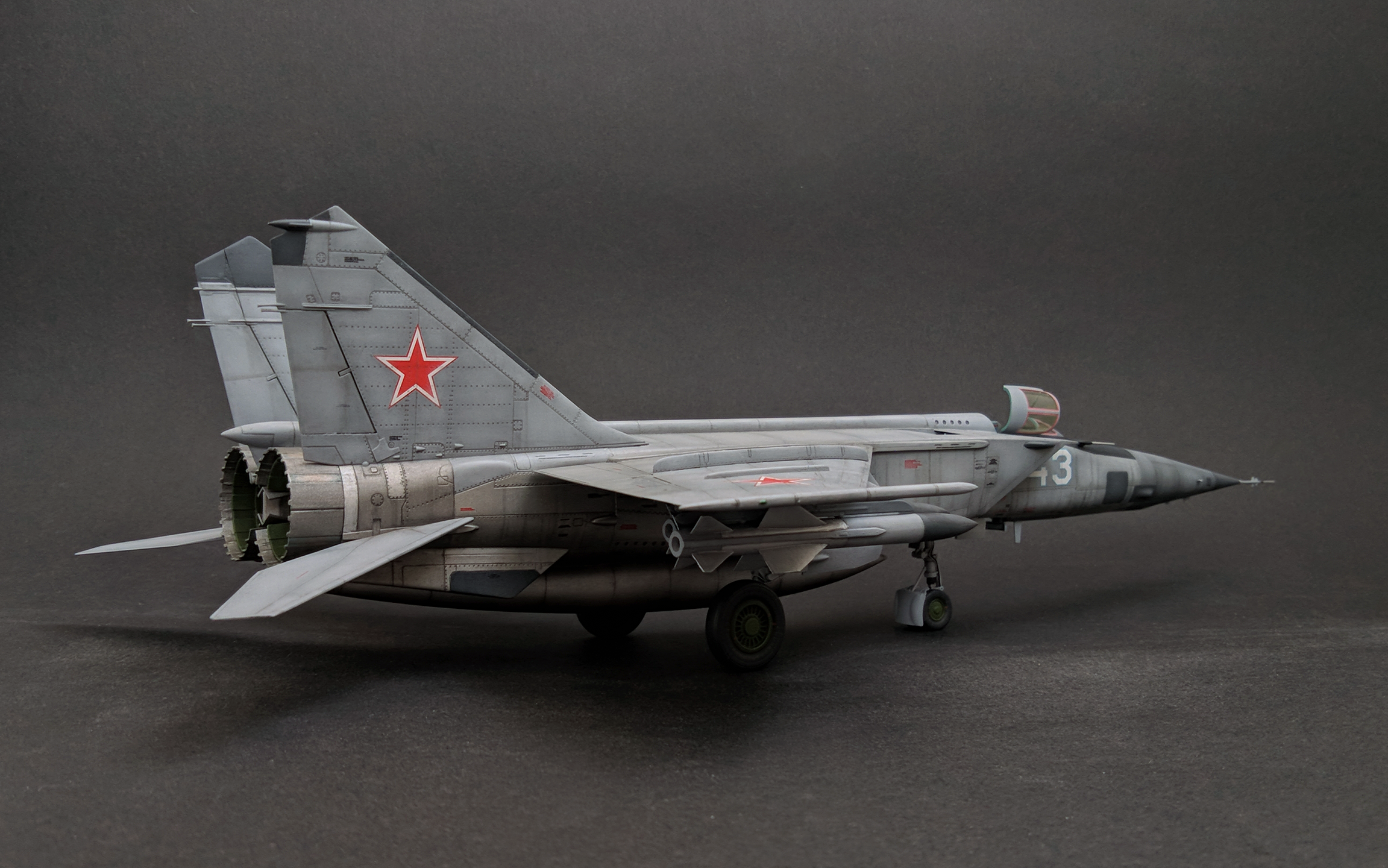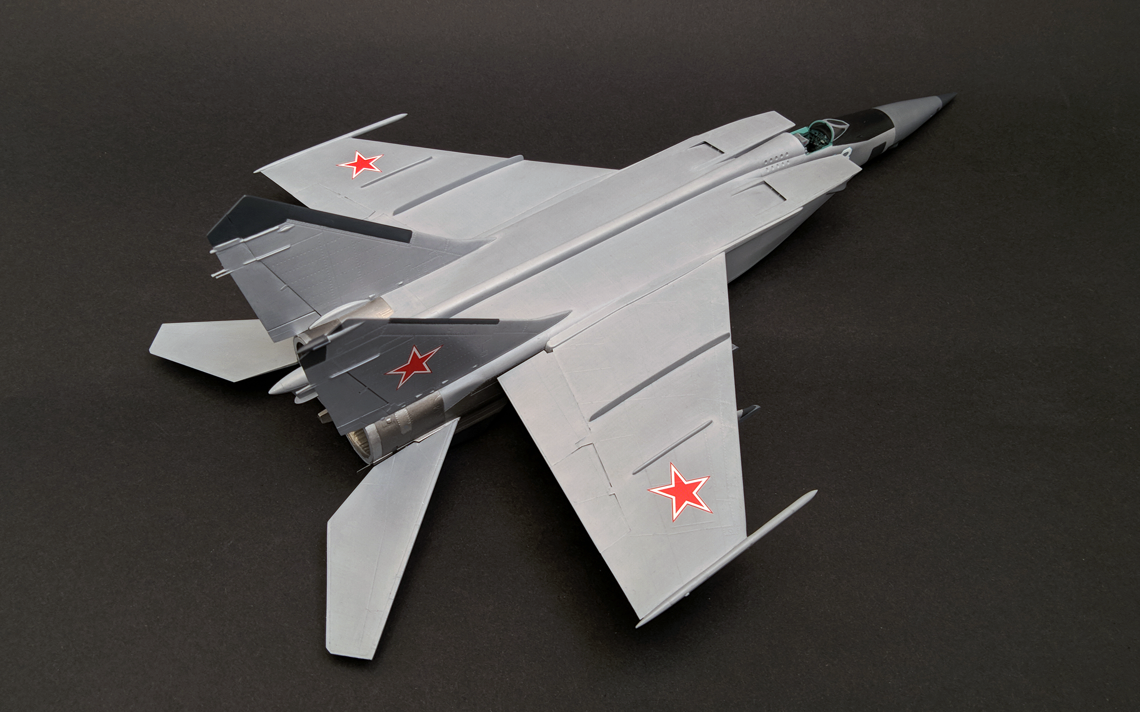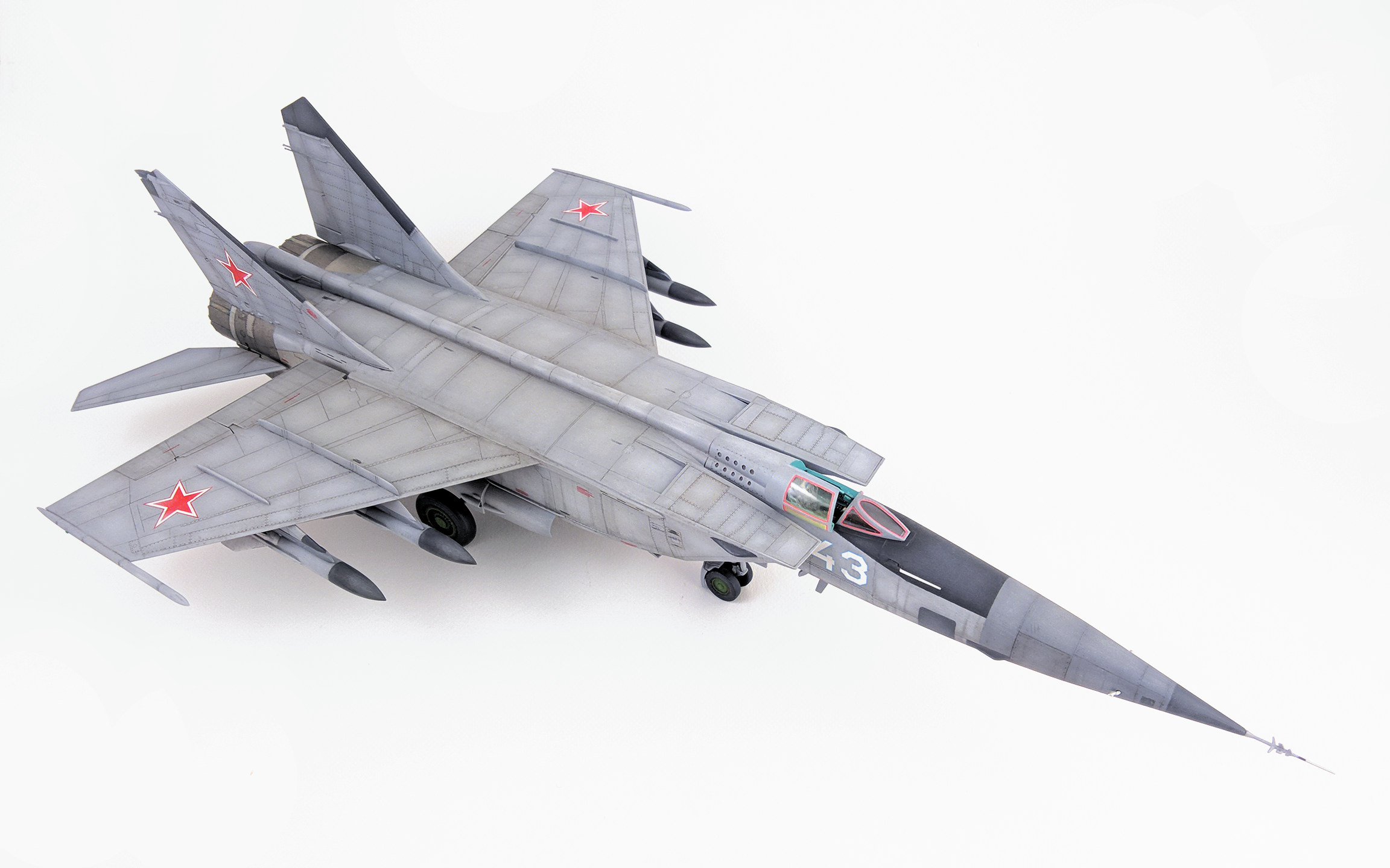 Уже хорошо знакомый мне набор МиГ-25 от ICM, теперь в варианте самолета прорыва ПВО, отличается от предыдущих другим носом и наличием ракет Х-58У с пилонами. Членение ракет несколько неудобное, под стать всему набору. Но в целом модель собралась без серьёзных проблем.