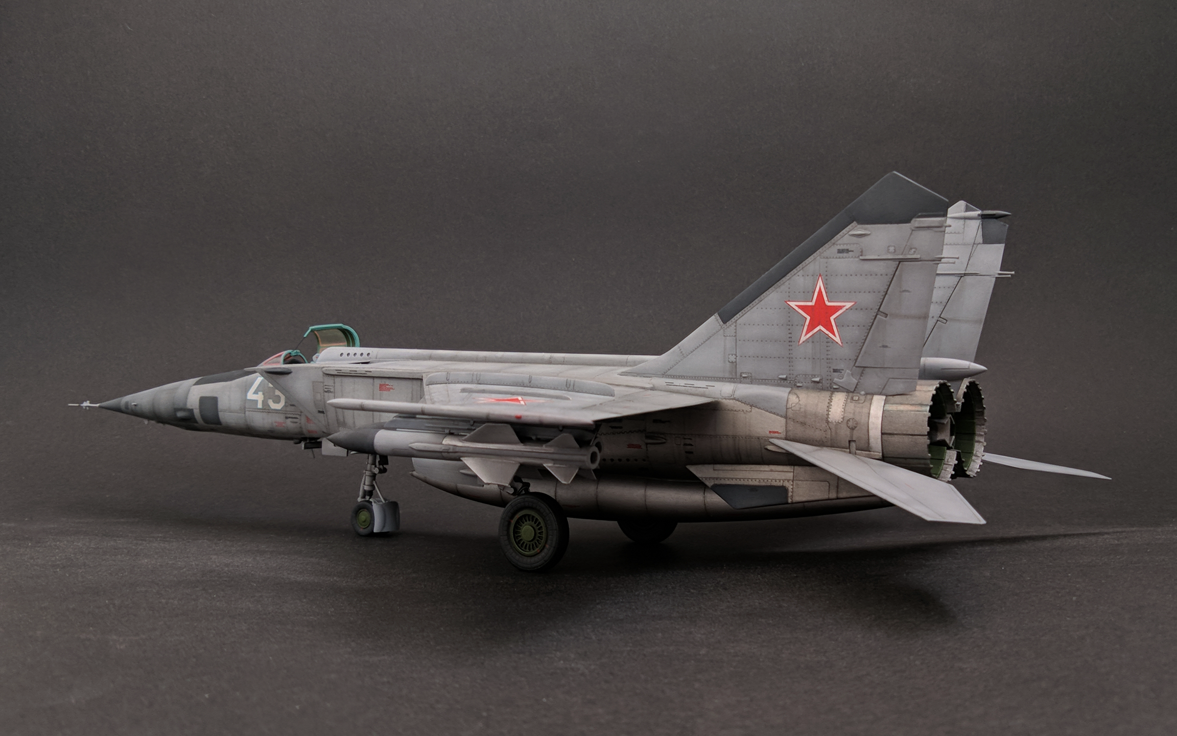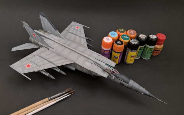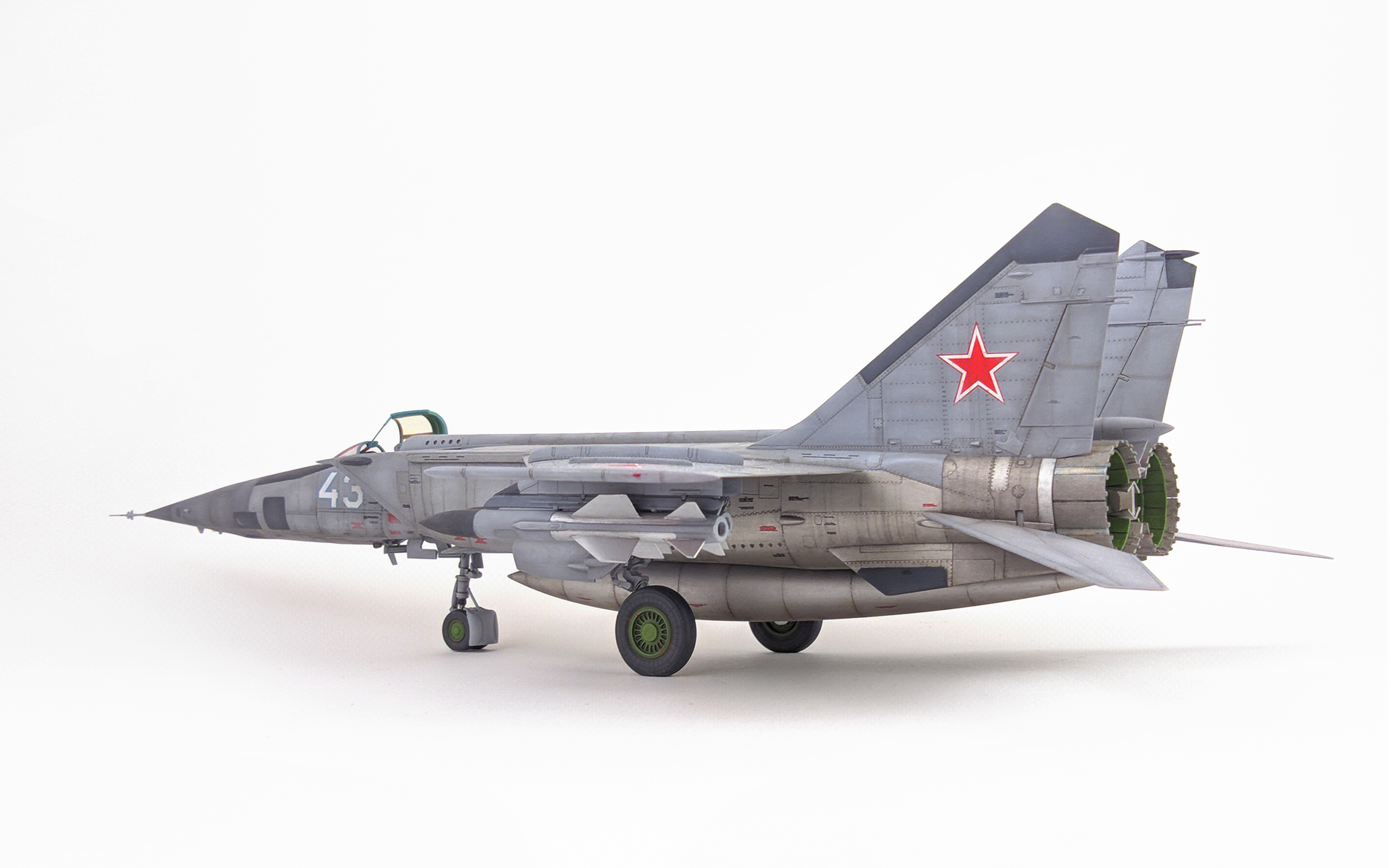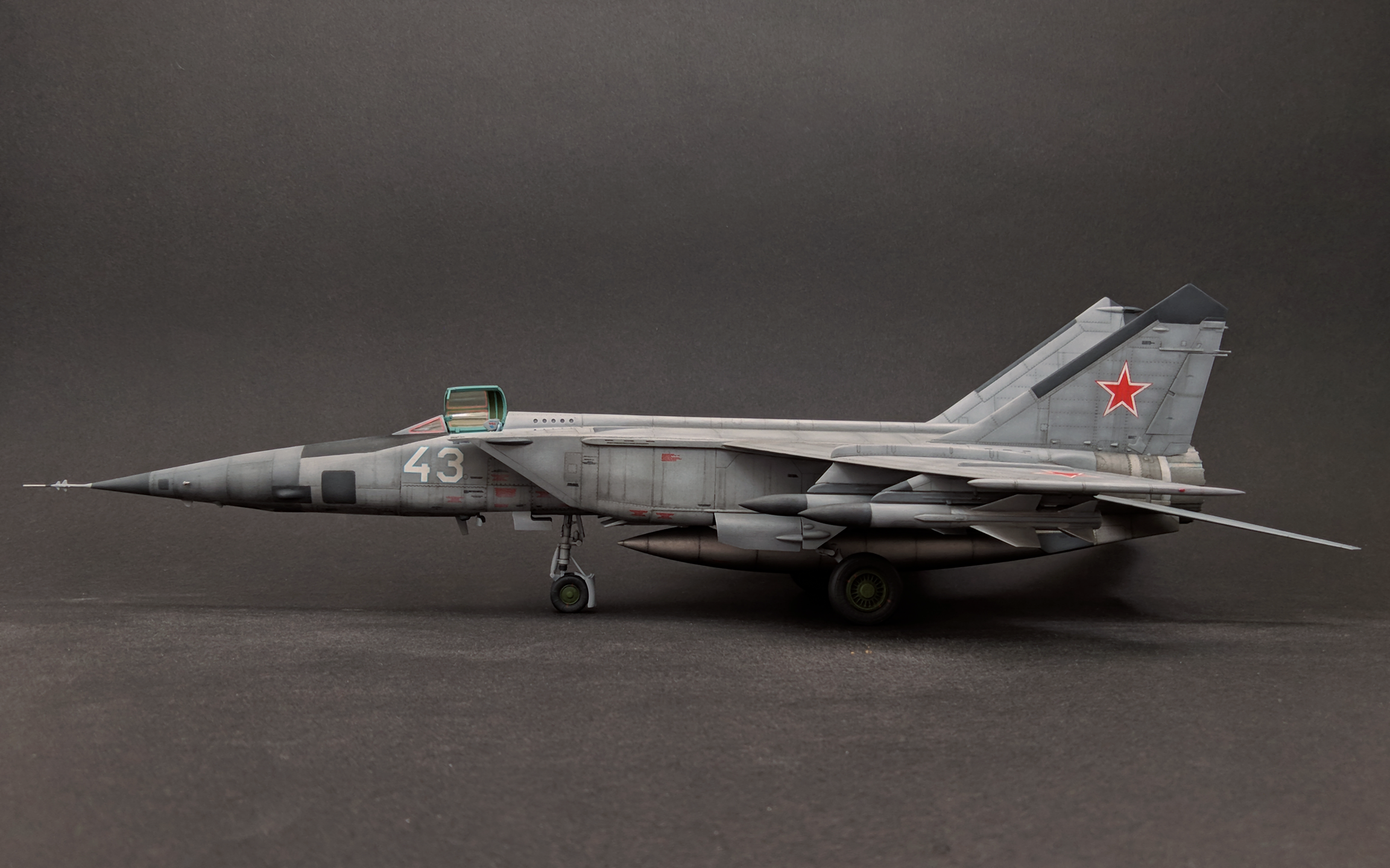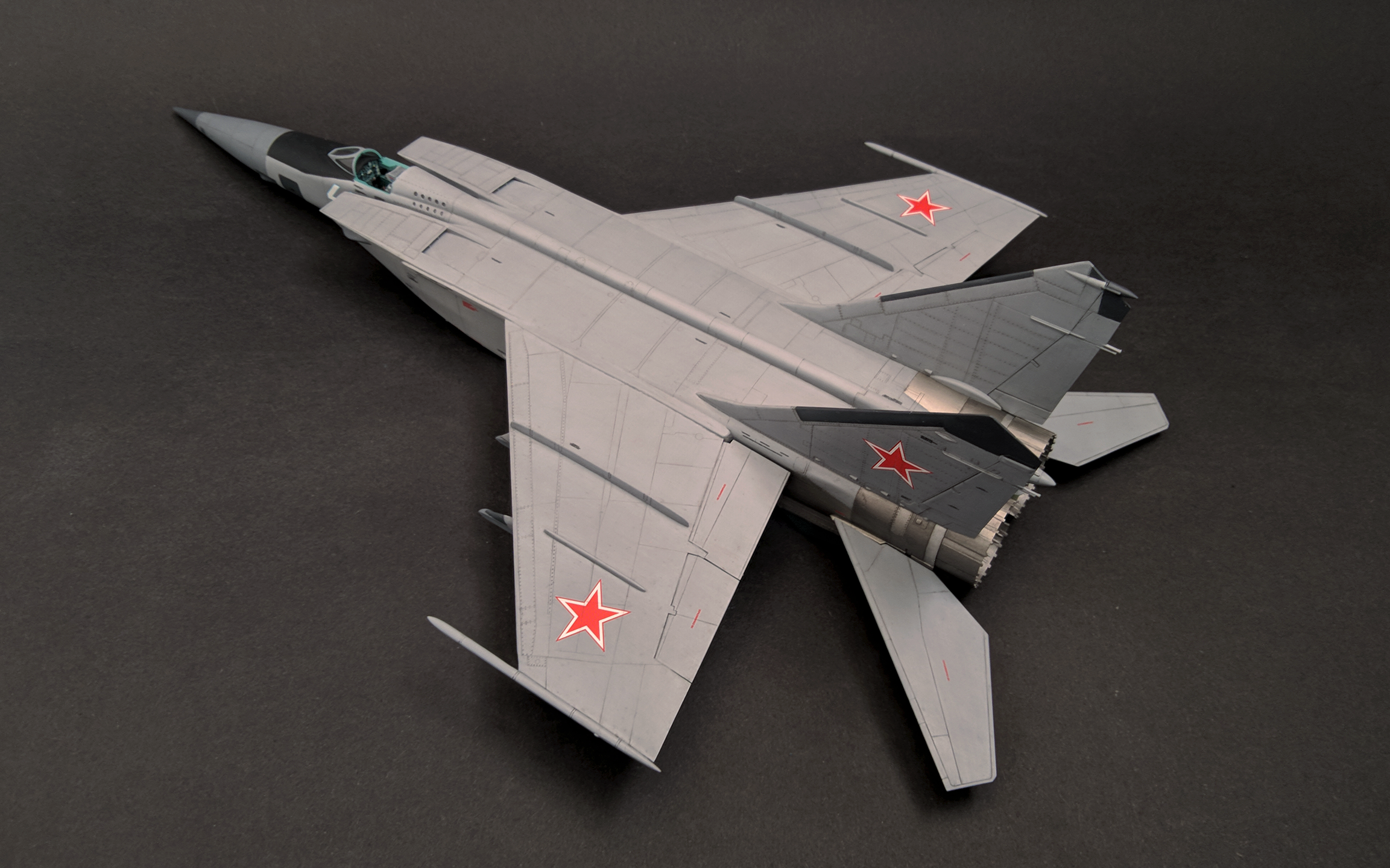 Уже хорошо знакомый мне набор МиГ-25 от ICM, теперь в варианте самолета прорыва ПВО, отличается от предыдущих другим носом и наличием ракет Х-58У с пилонами. Членение ракет несколько неудобное, под стать всему набору. Но в целом модель собралась без серьёзных проблем.